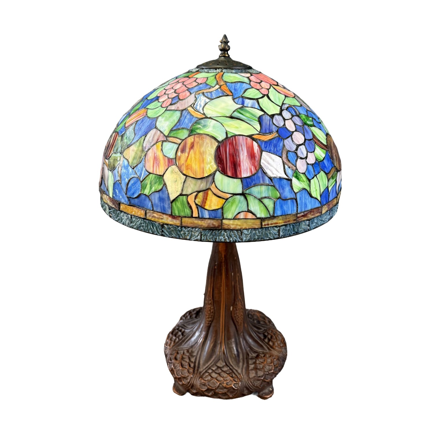 This large Tiffany-style leaded glass lamp features a vibrant domed shade with richly colored floral and fruit motifs, casting a warm and inviting glow. The sculptural tree trunk base, with its textured bark detailing and organic form, adds a striking naturalistic element that beautifully complements the artistry of the glass.
