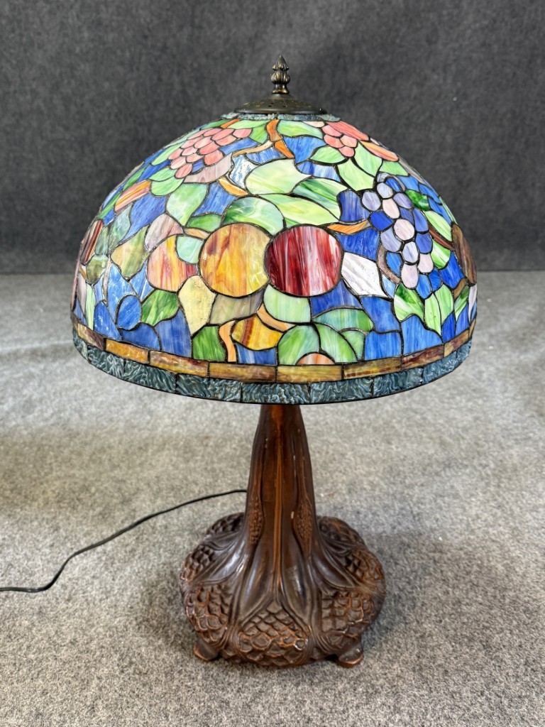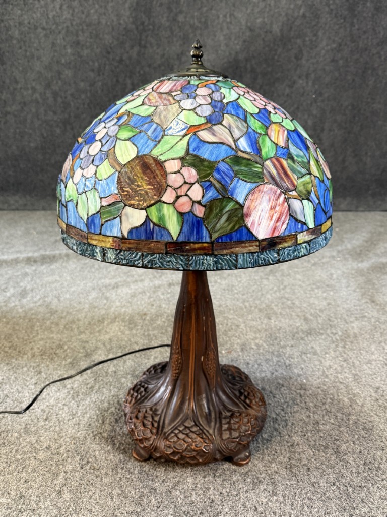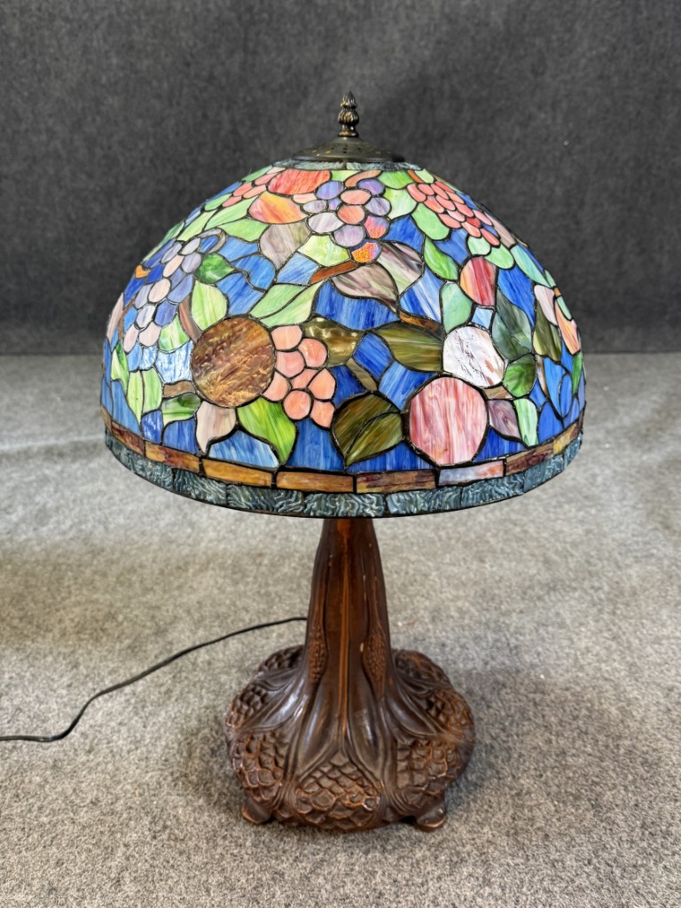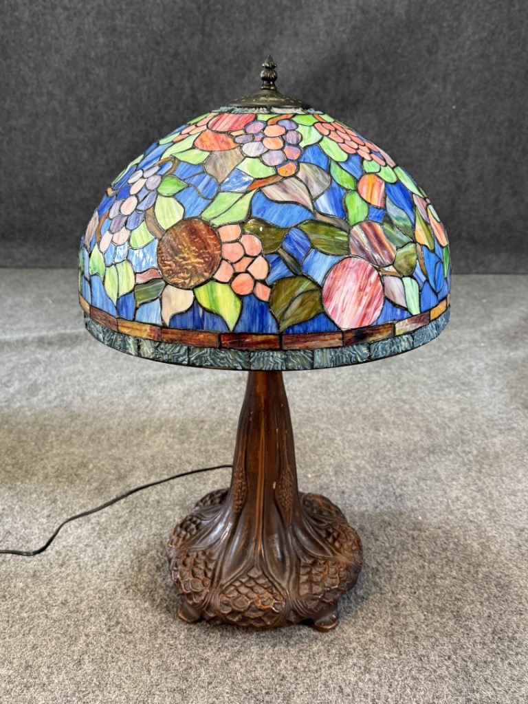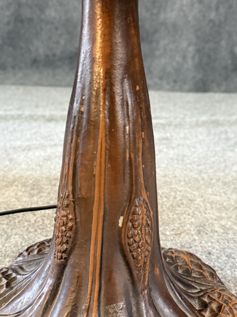 Large Tiffany Style Leaded Glass Lamp with Tree Trunk Base