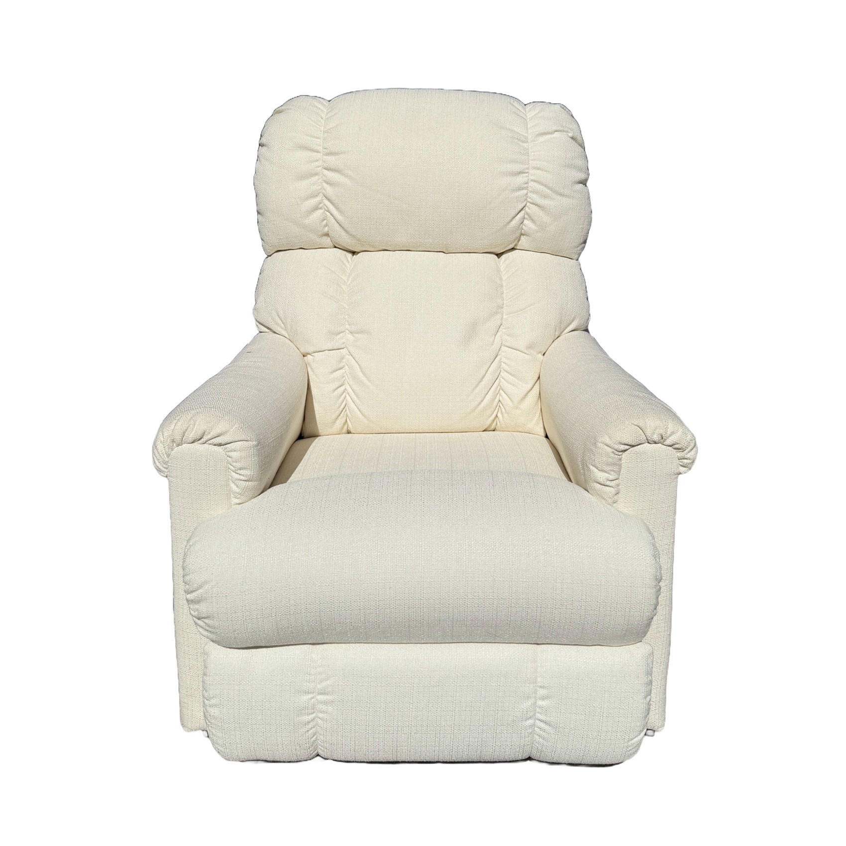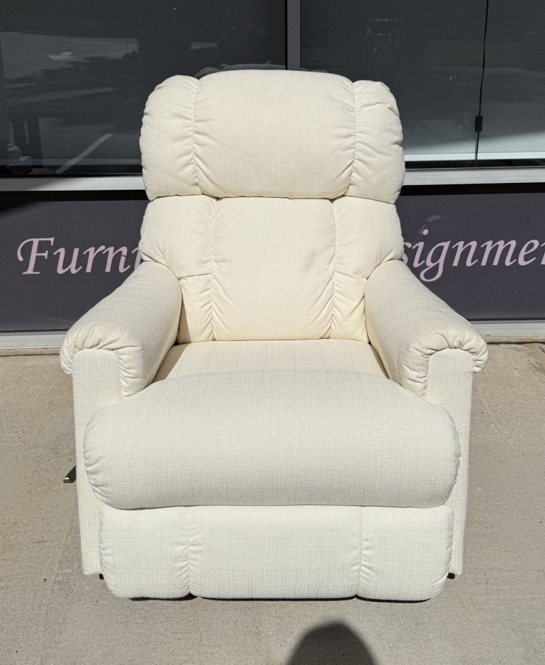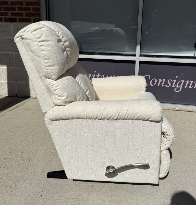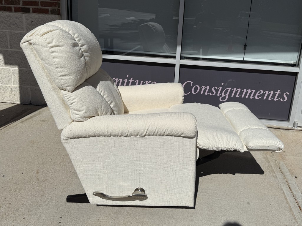 This Lay-Z-Boy Pinnacle Rocker-Recliner offers plush, overstuffed cushioning with a three-tier back design that provides exceptional head, lumbar, and leg support. Upholstered in a soft cream fabric, it combines classic comfort with a clean, inviting look perfect for any living space.