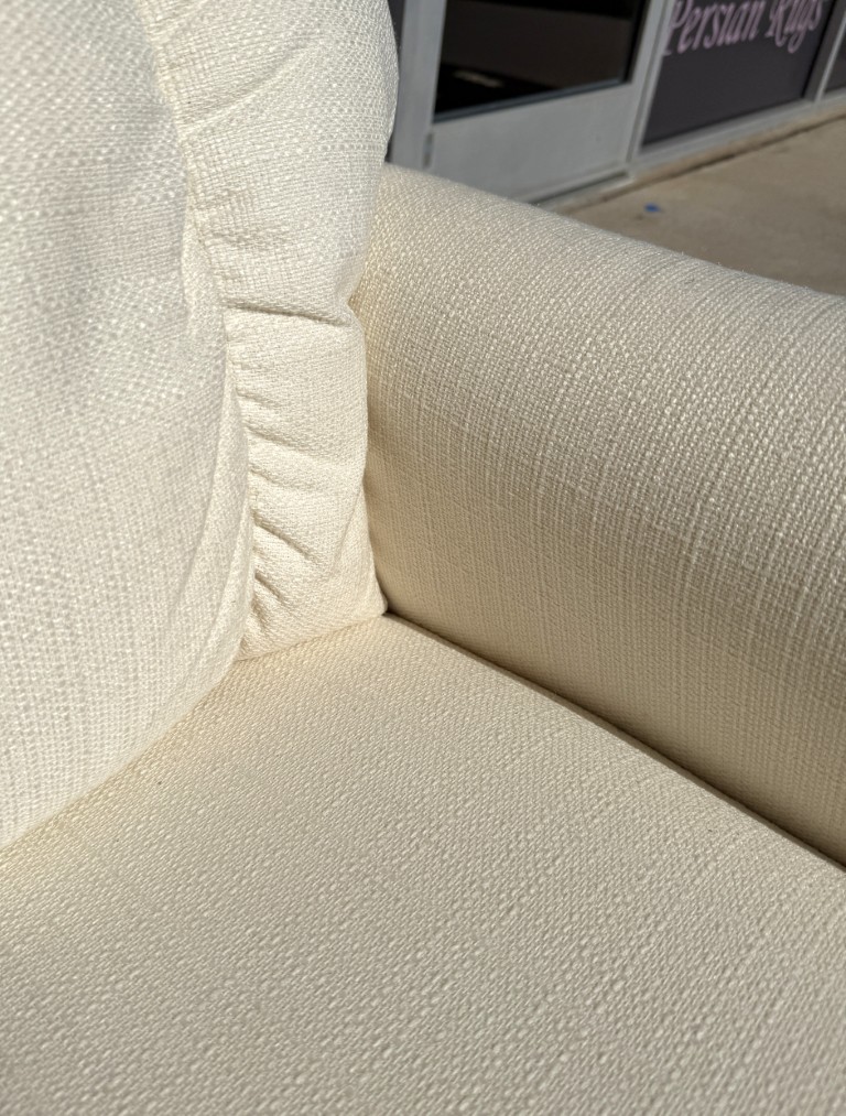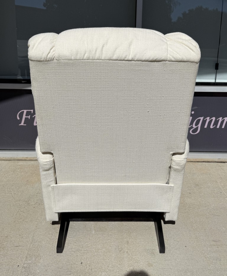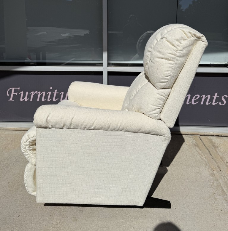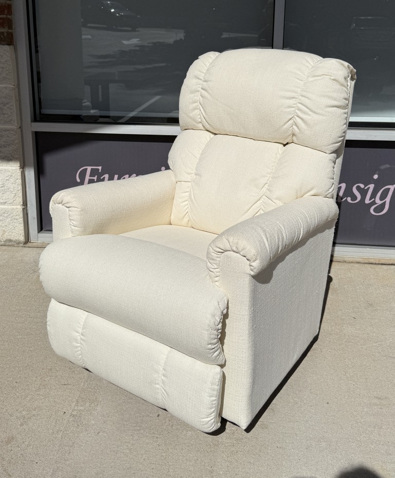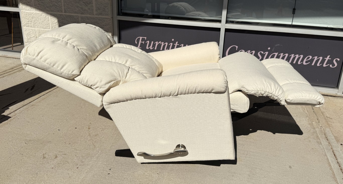 This Lay-Z-Boy Pinnacle Rocker-Recliner offers plush, overstuffed cushioning with a three-tier back design that provides exceptional head, lumbar, and leg support. Upholstered in a soft cream fabric, it combines classic comfort with a clean, inviting look perfect for any living space.