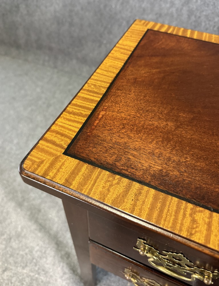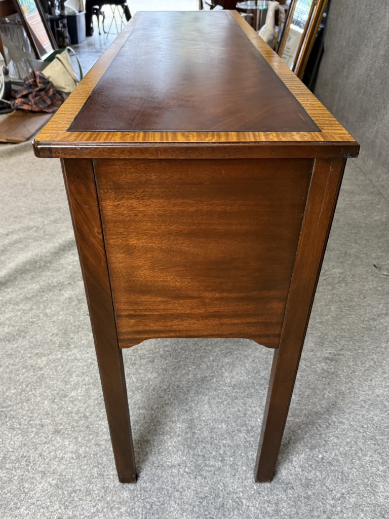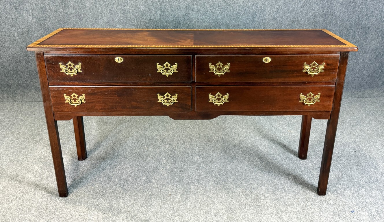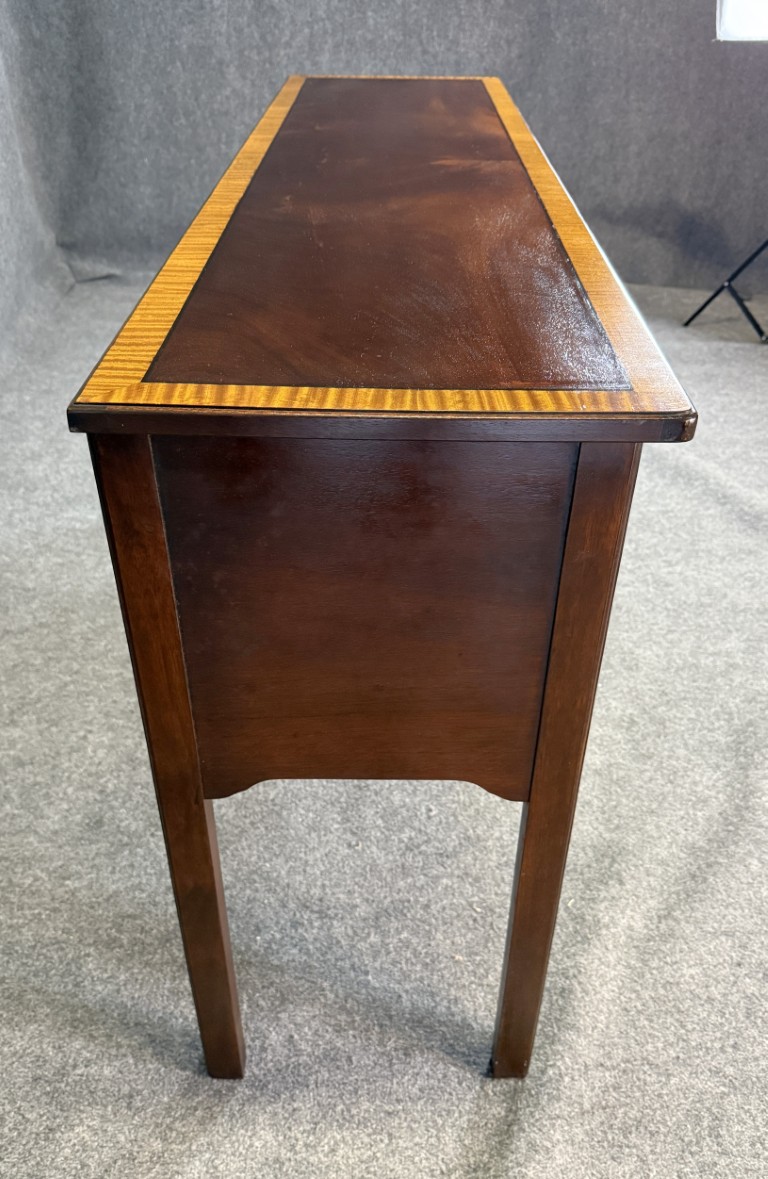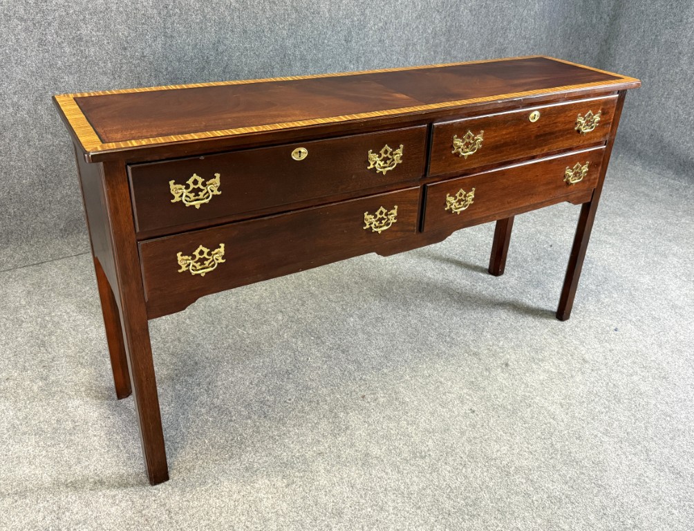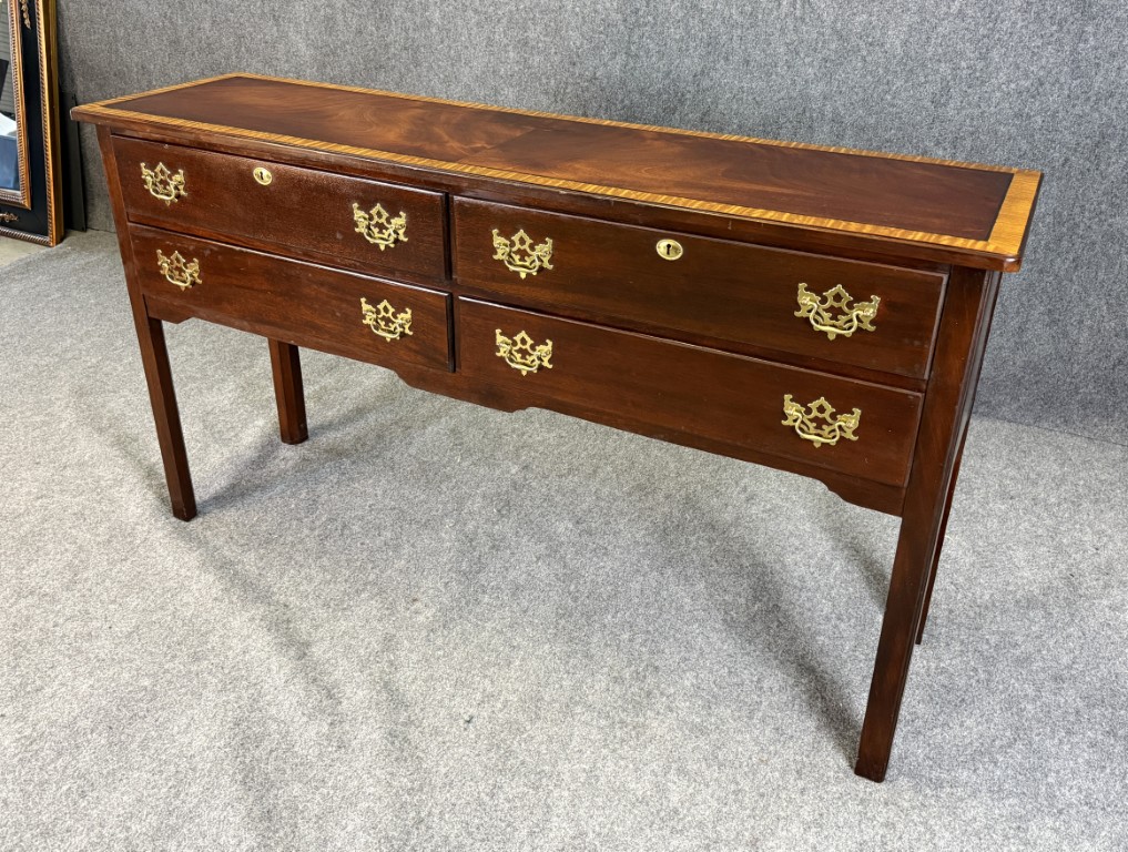 This Madison Park banded-top mahogany sideboard features a rich, figured top framed by contrasting inlay, paired with classic brass hardware and clean, elegant lines. The four spacious drawers offer ample storage for linens, serving pieces, or dining essentials, making it both functional and refined. A timeless piece that blends traditional craftsmanship with versatile appeal for dining rooms, entryways, or living spaces.