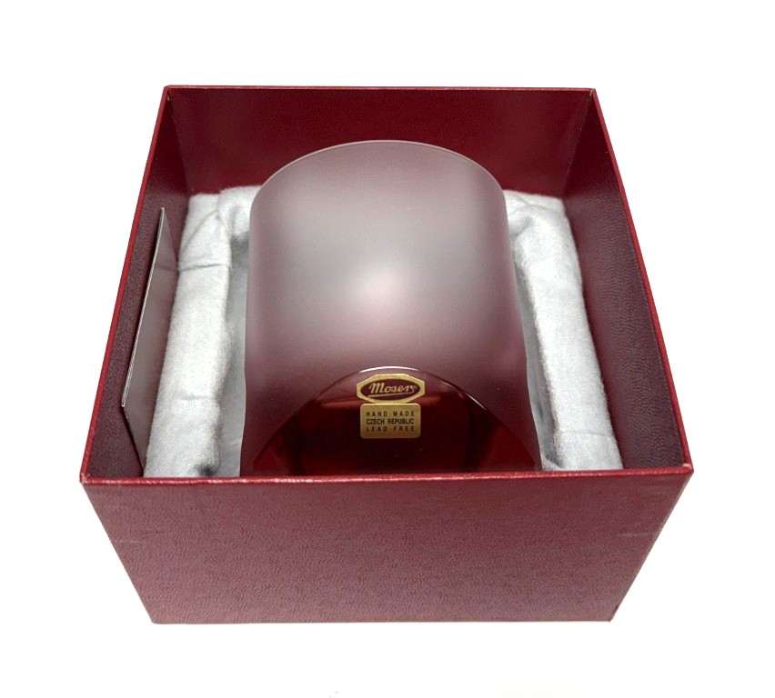 This Magenta Moser Frosted Tipsy Whiskey Glass is new in box and features the signature rounded base that allows for playful movement as the glass gently rocks back and forth. Moser, one of Europe’s premier luxury crystal makers, continues to produce the Tipsy line today, celebrated for its modern artistry and hand-crafted precision. Beautifully boxed and visually striking, it makes an exceptional gift for any collector or design-minded spirits enthusiast.