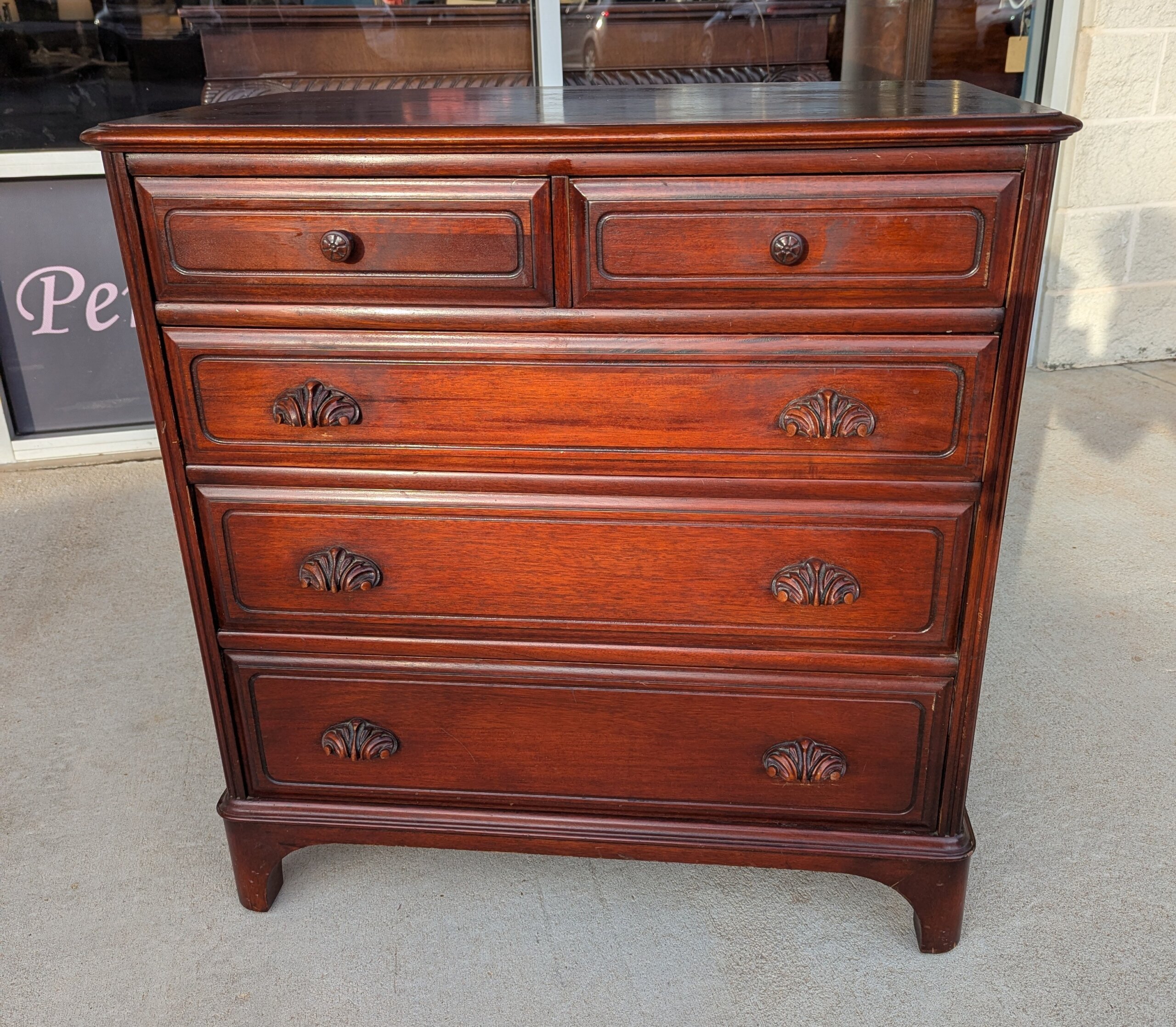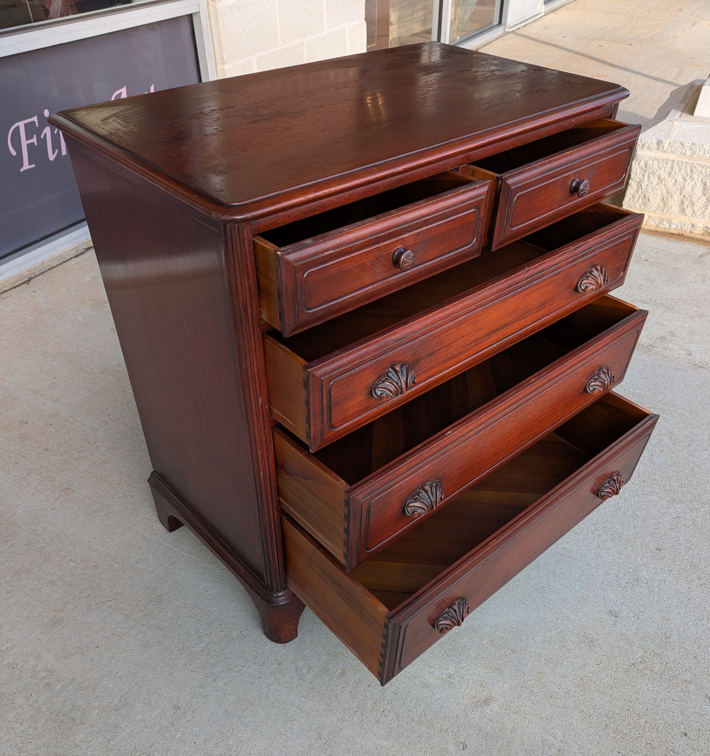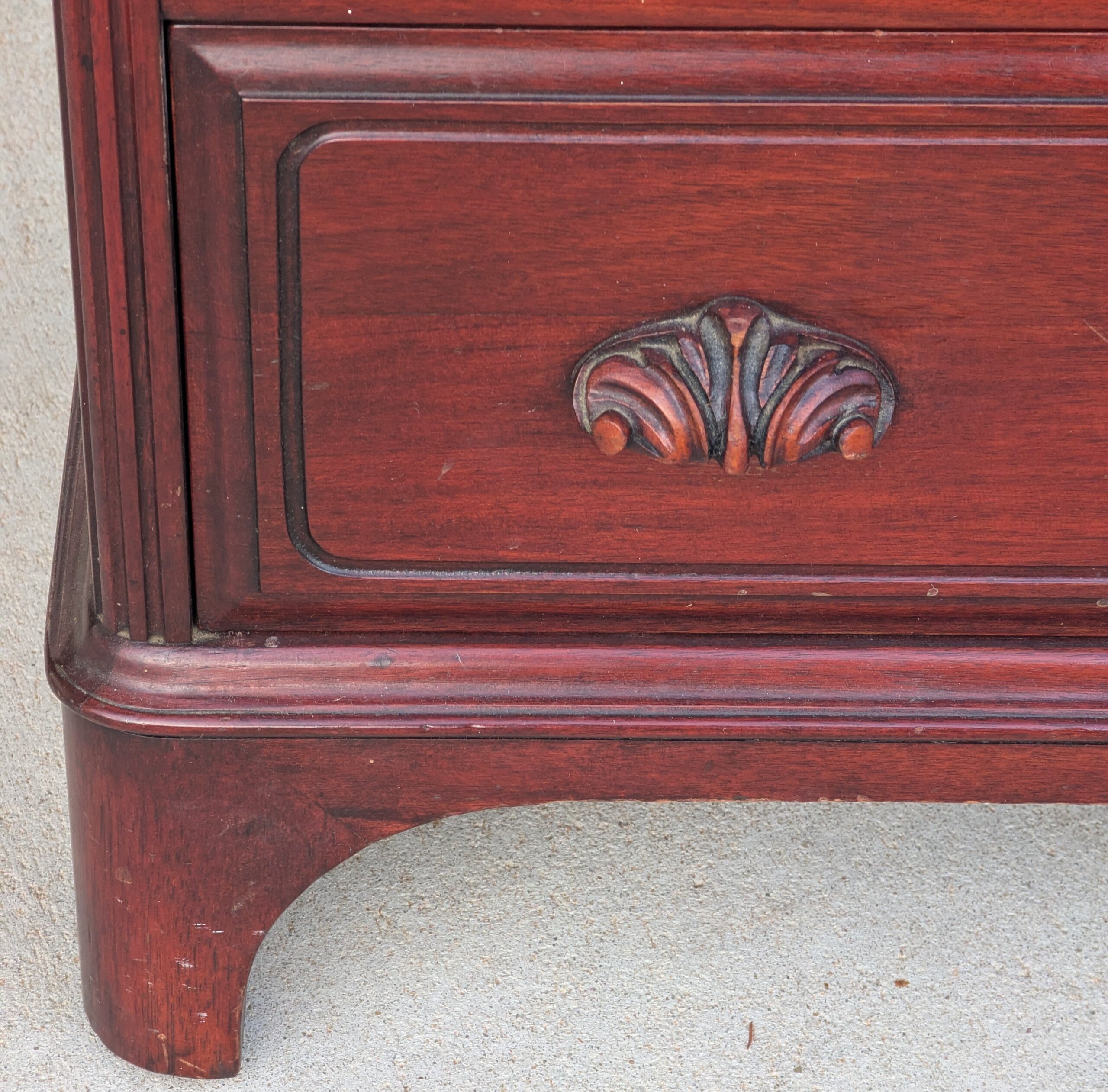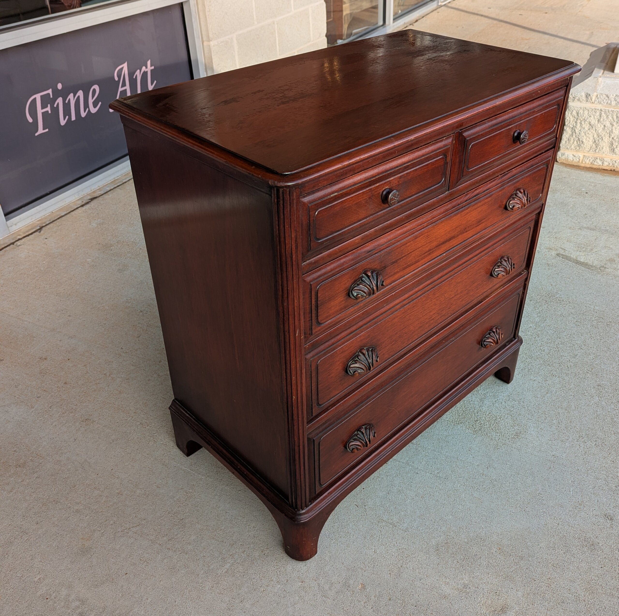 Mahogany Bachelor Chest Nightstand [circa 1950]. Fashioned in the Victorian style featuring five dove tail drawers with mustache pulls. This compact dresser has ample storage for small spaces and can double as a nightstand.