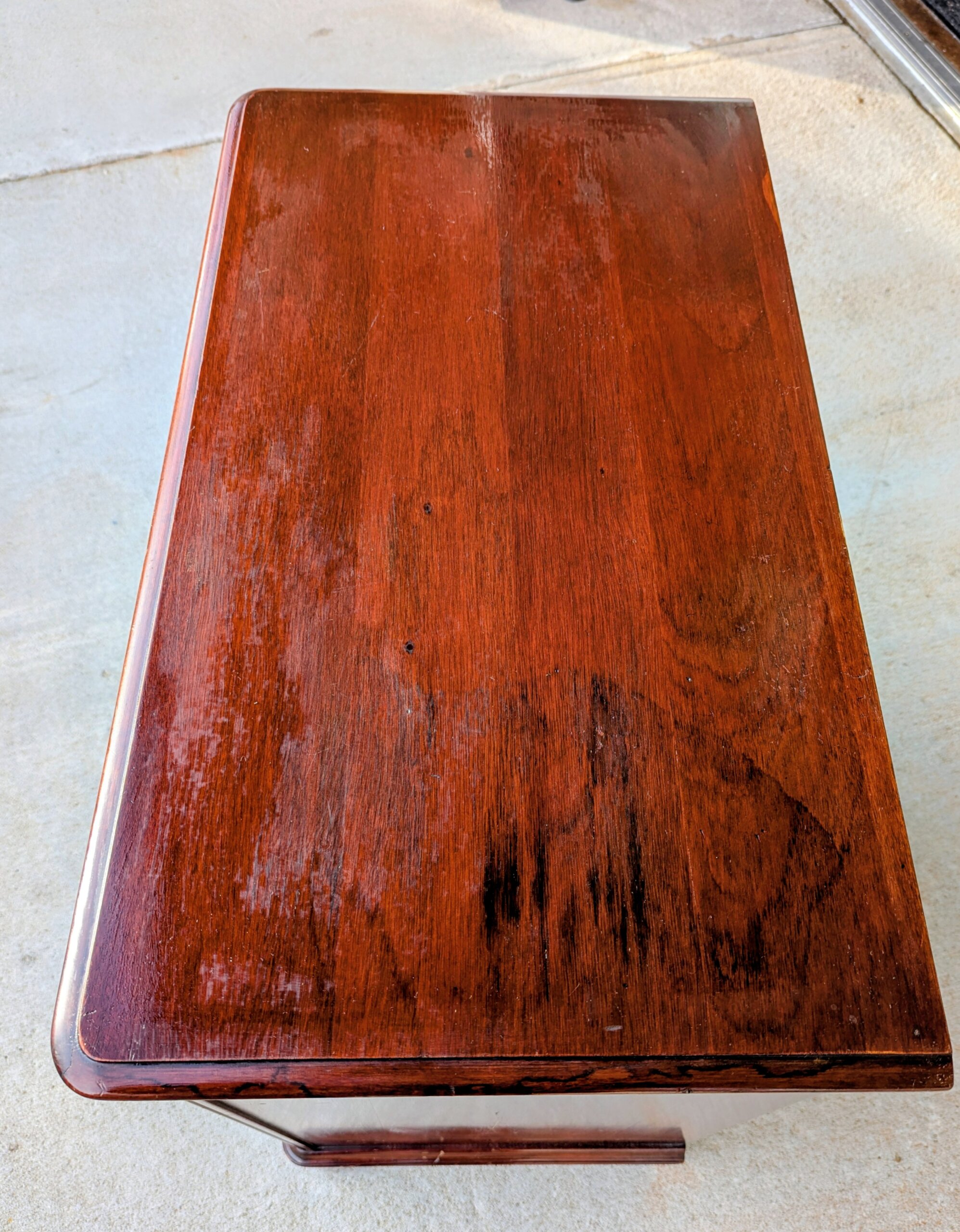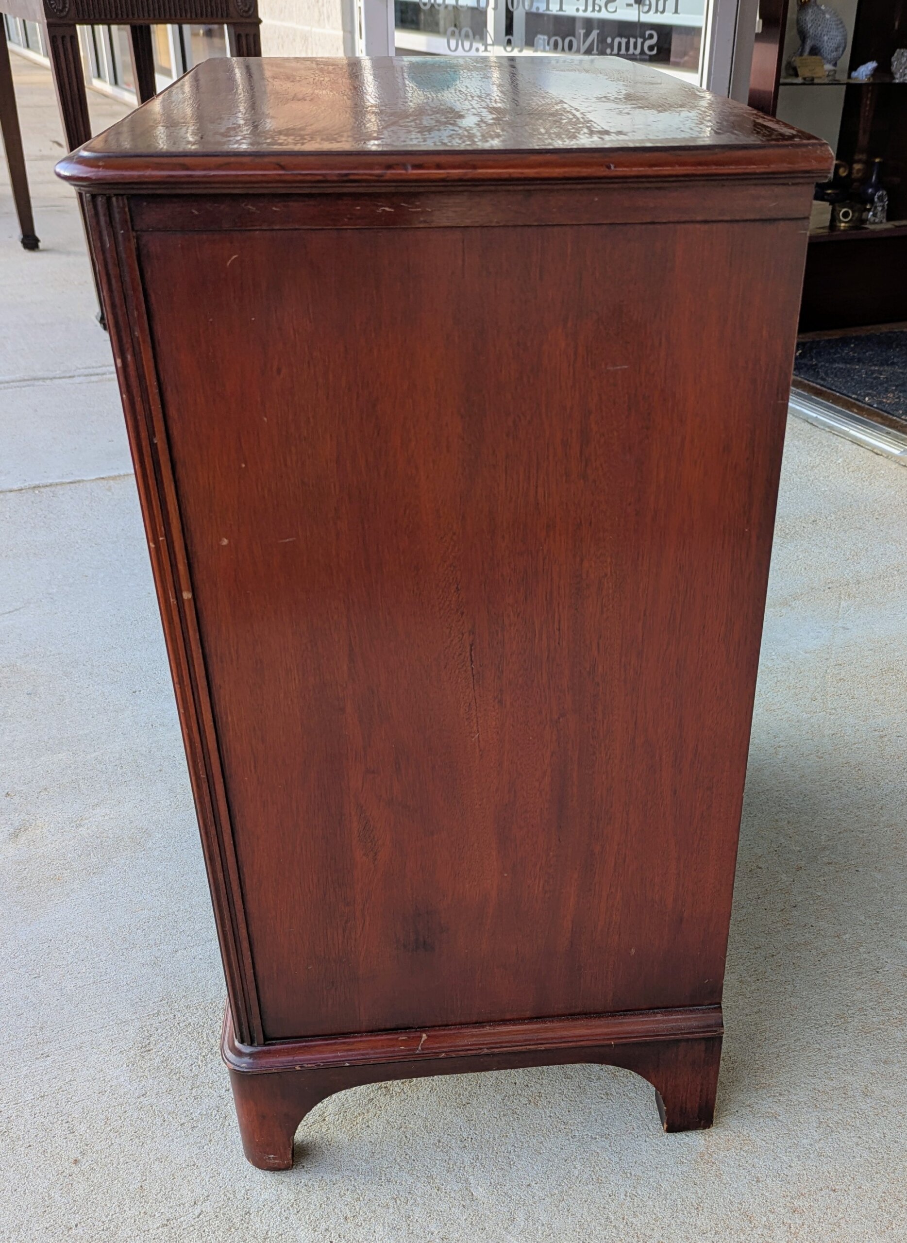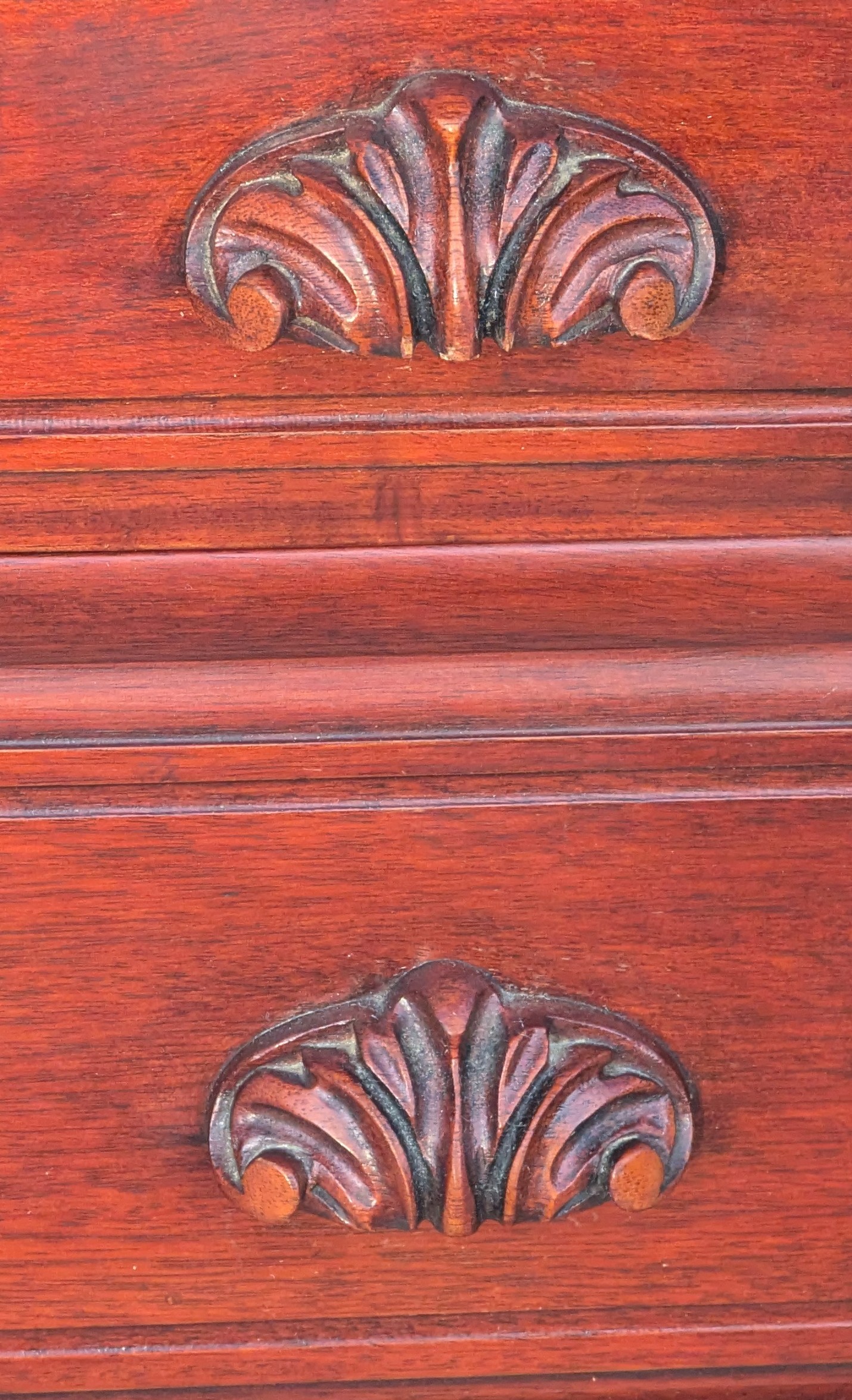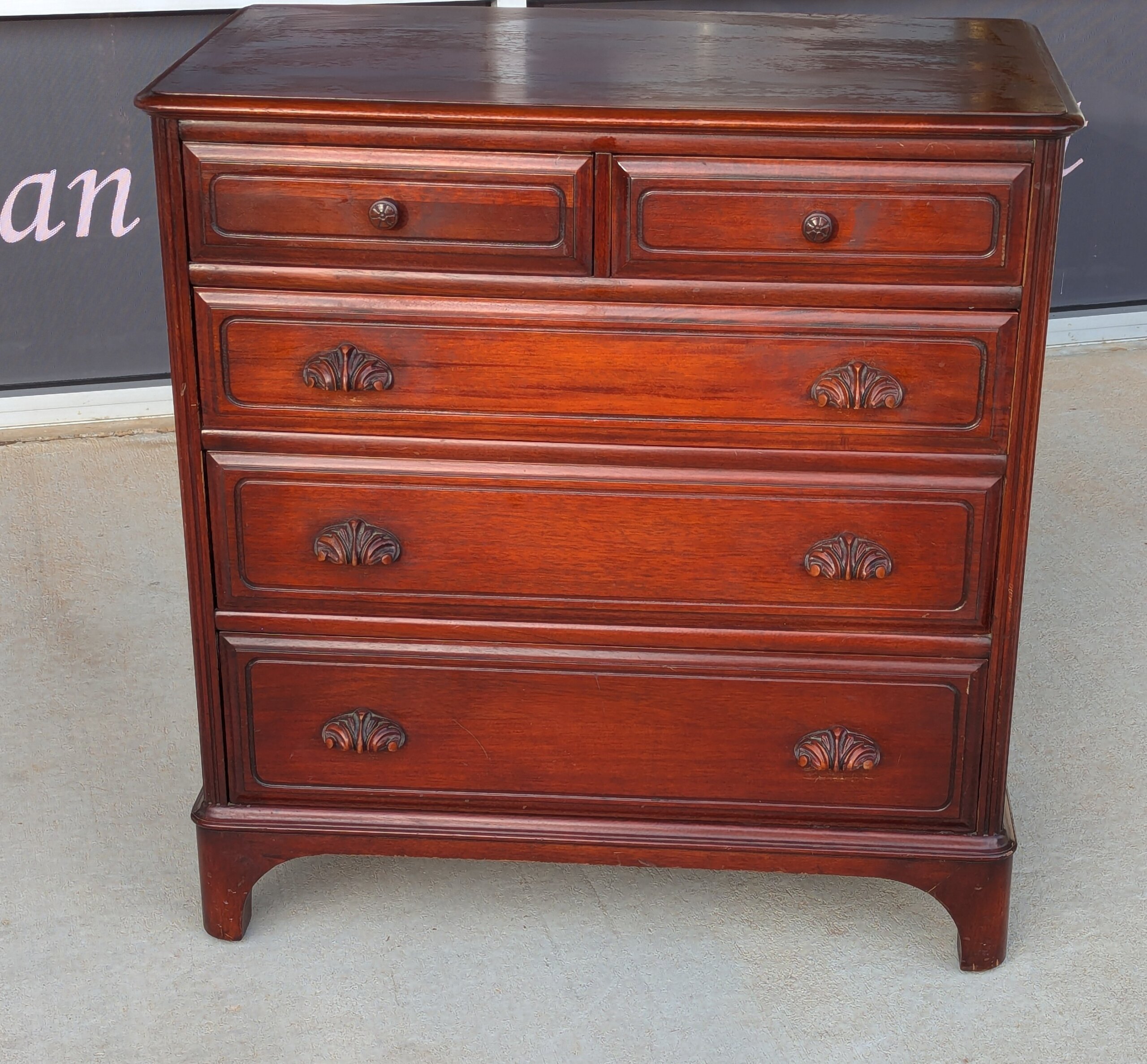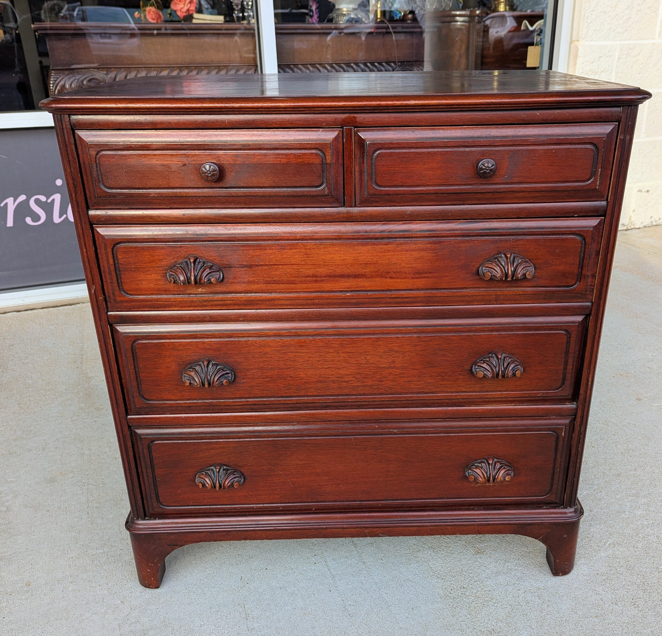 Mahogany Bachelor Chest Nightstand [circa 1950]. Fashioned in the Victorian style featuring five dove tail drawers with mustache pulls. This compact dresser has ample storage for small spaces and can double as a nightstand.