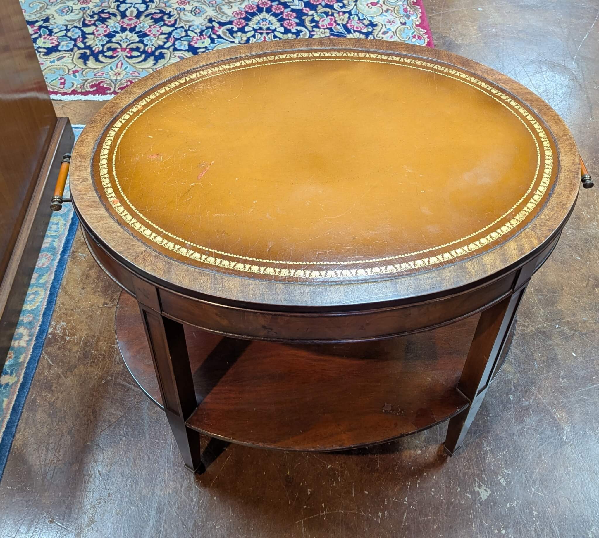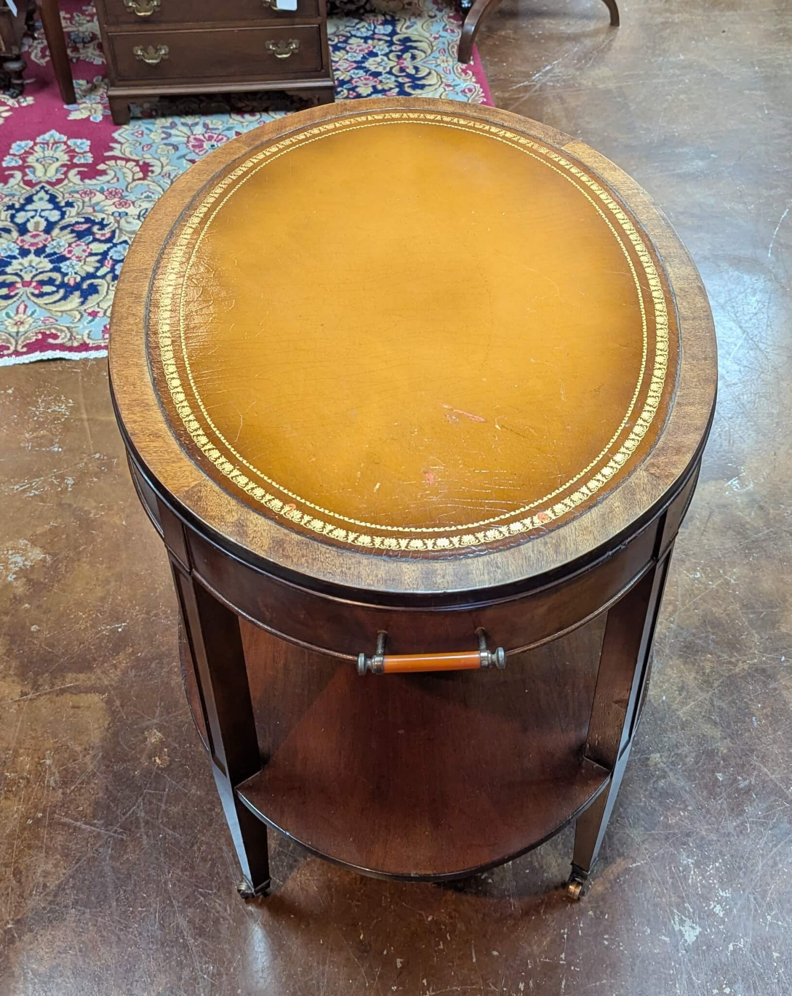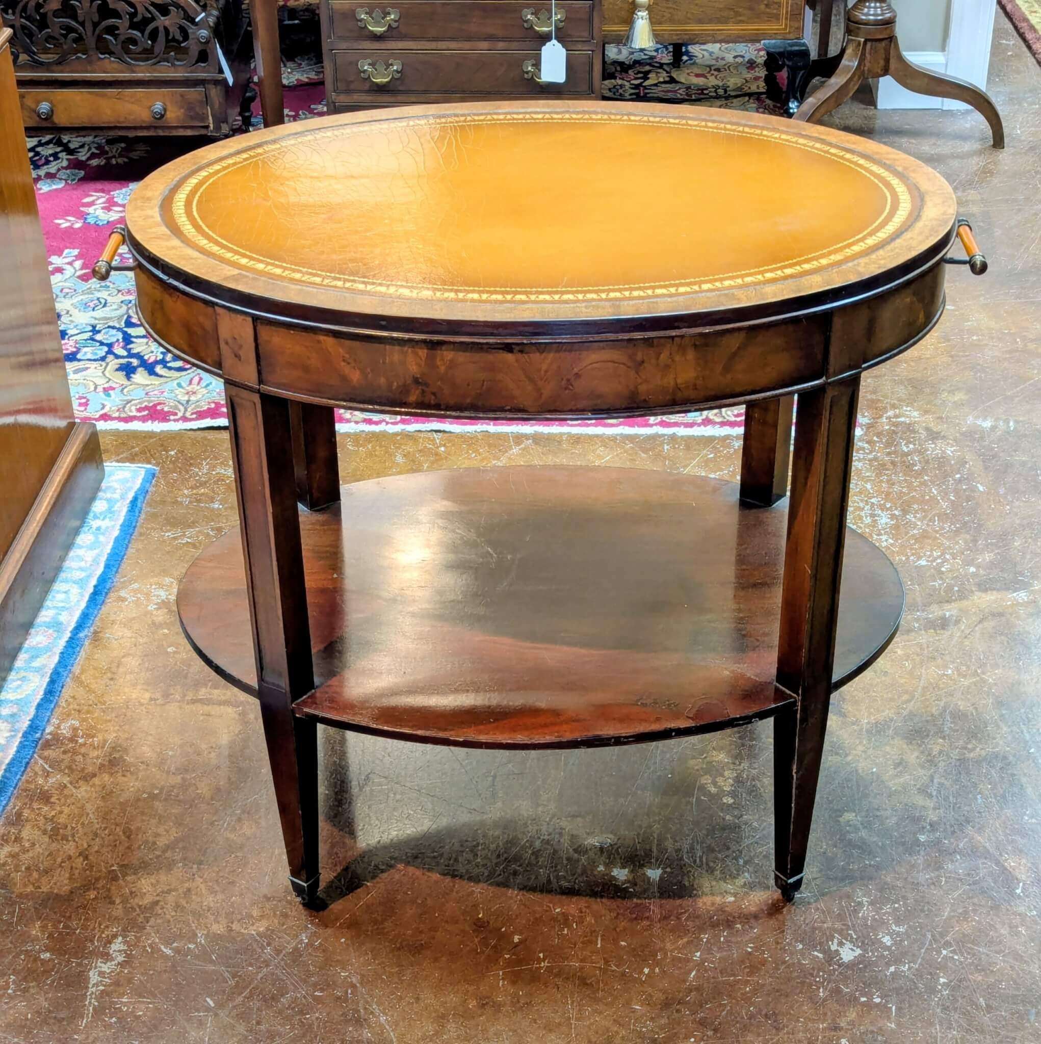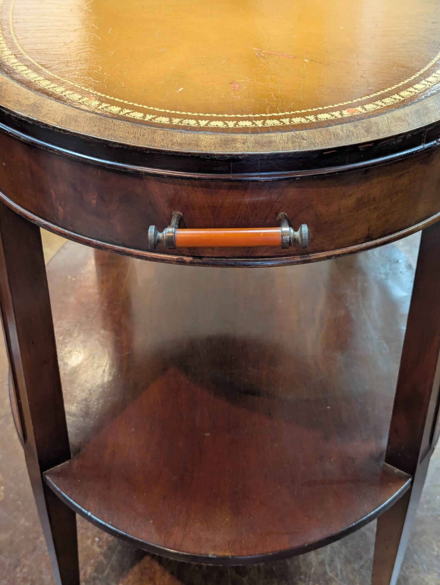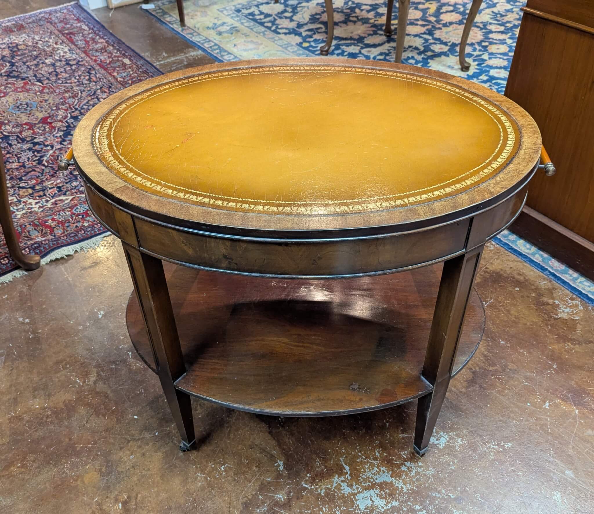 Your happiness with this item is of the utmost importance to us so please review the photographs carefully for condition. We endeavor to try and list any issues we may observe; we may not necessarily note all minor nicks and dings or we may simply miss something. Please inspect carefully to ensure your full happiness with this item. The table has faint crazing crackle lines to the top leather finish. we also found wear to the gold embossing and small scaring to the leather consistent with age.