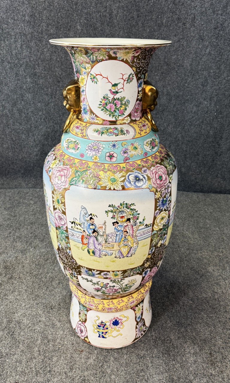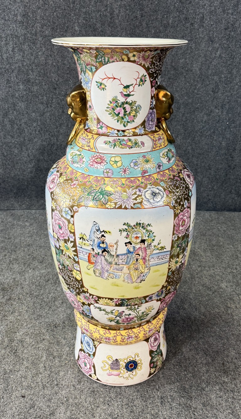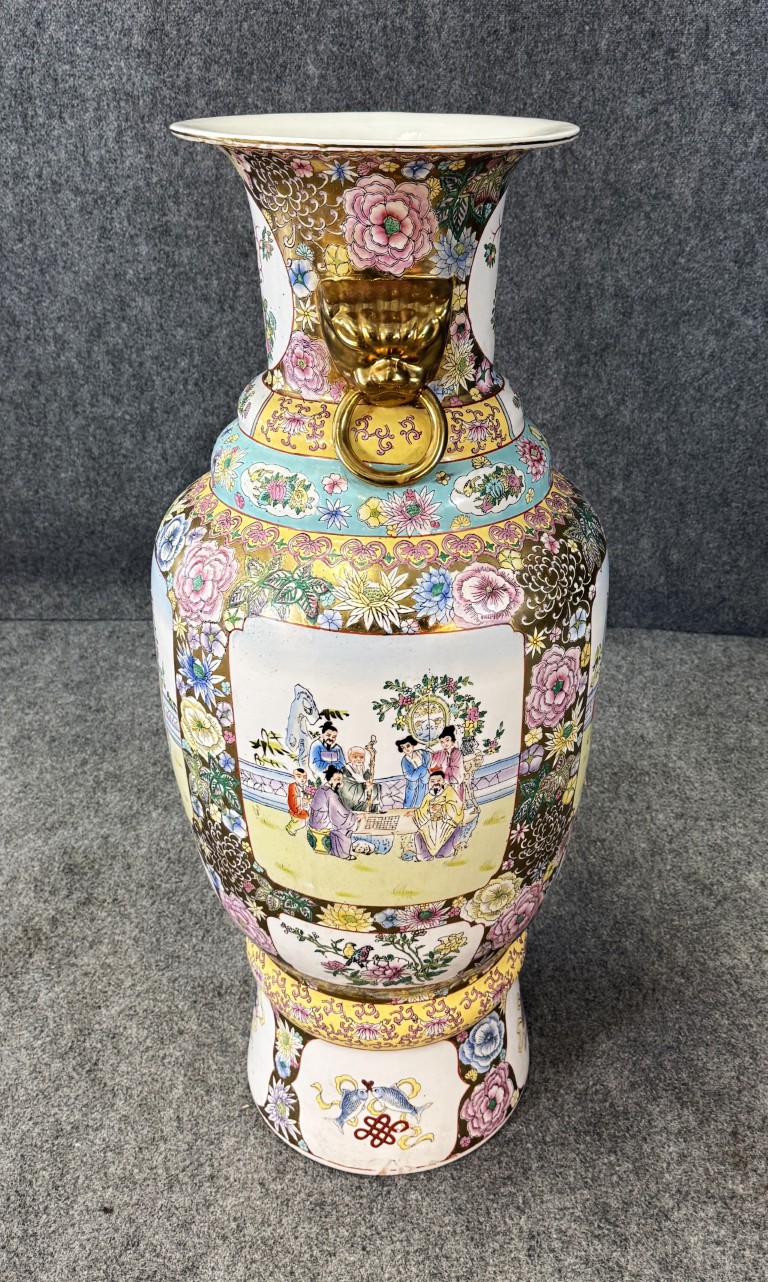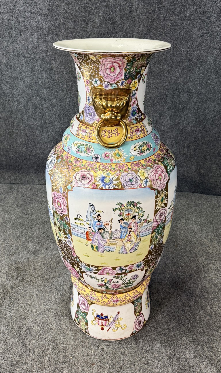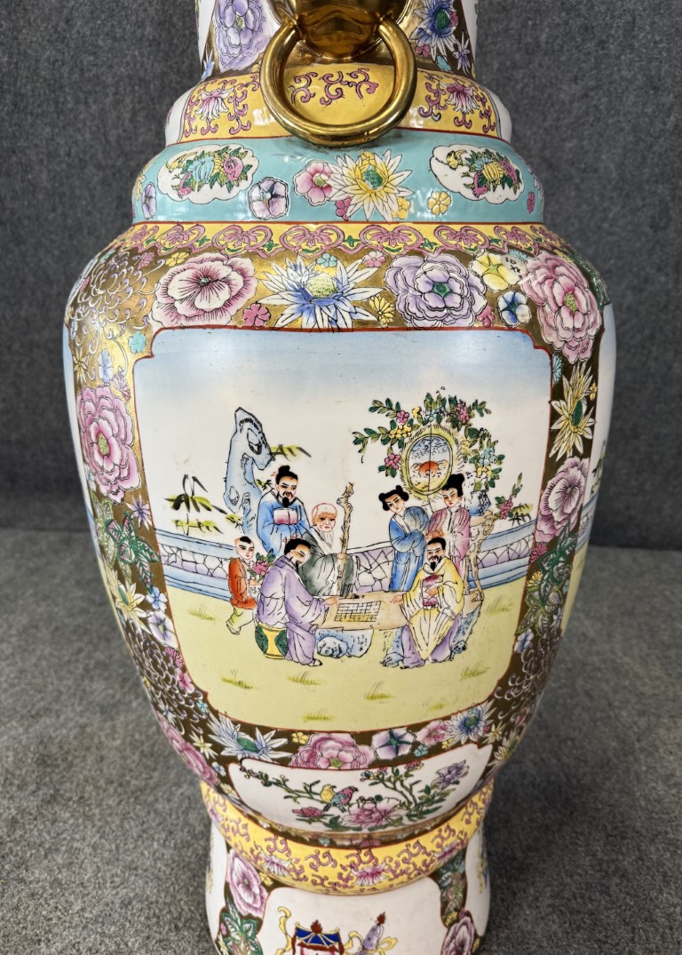 This Monumental Oriental Porcelain Palace Vase, standing at an impressive 43 inches tall, is richly hand-painted with intricate floral motifs and detailed scenes of figures in traditional attire gathered in an outdoor setting. Accented with gilt lion handles and vibrant pastel enamels, it stands as a striking example of fine craftsmanship and decorative artistry.