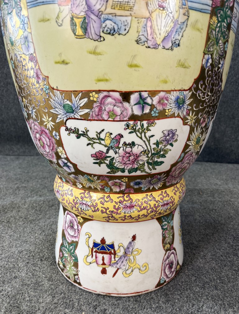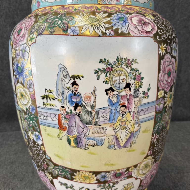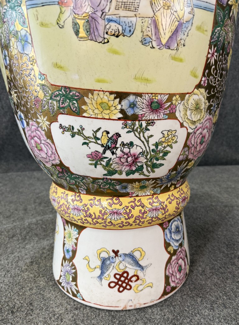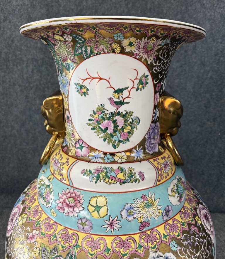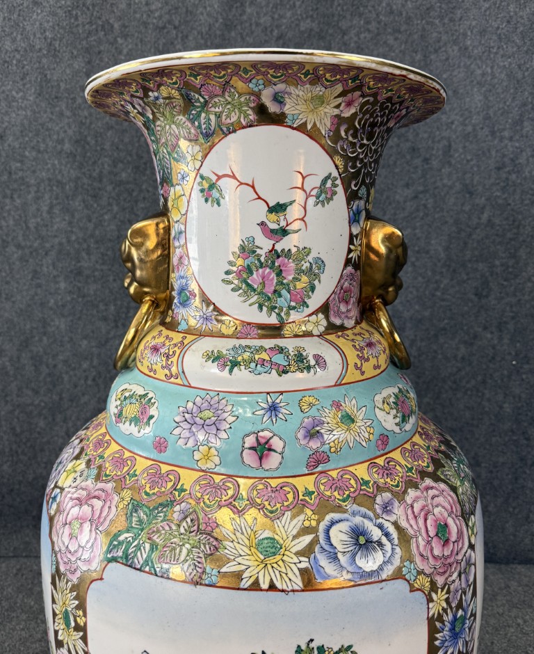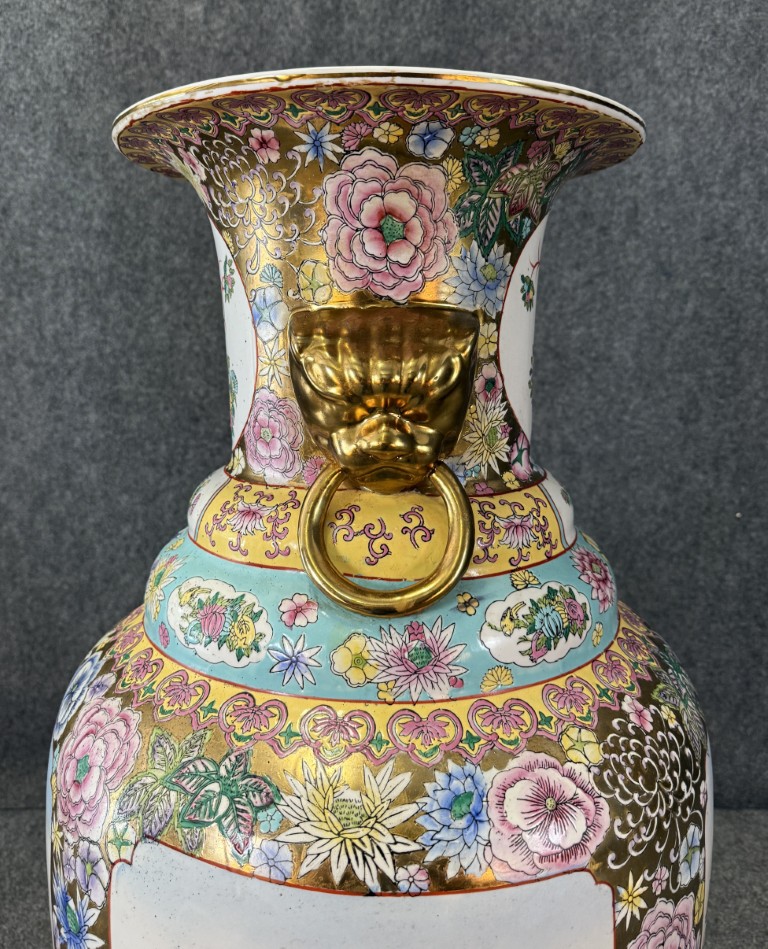 This Monumental Oriental Porcelain Palace Vase, standing at an impressive 43 inches tall, is richly hand-painted with intricate floral motifs and detailed scenes of figures in traditional attire gathered in an outdoor setting. Accented with gilt lion handles and vibrant pastel enamels, it stands as a striking example of fine craftsmanship and decorative artistry.