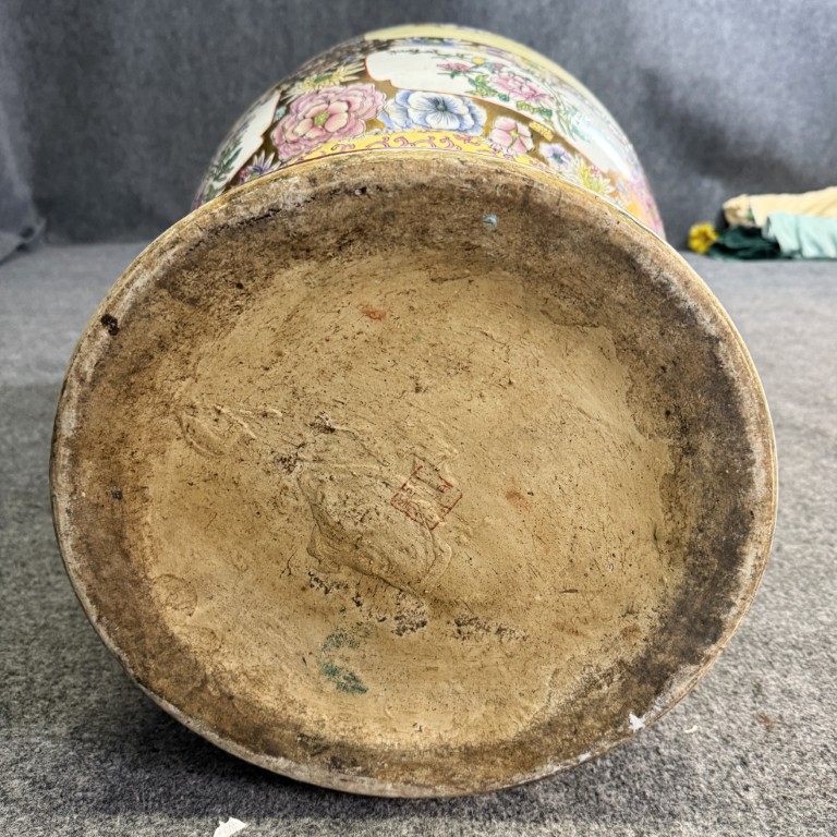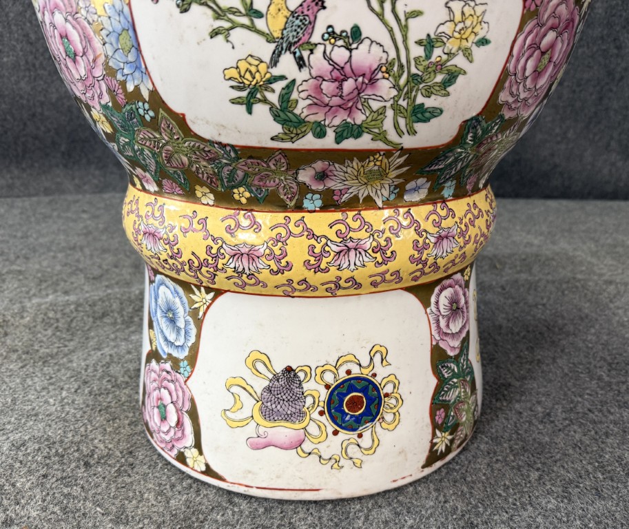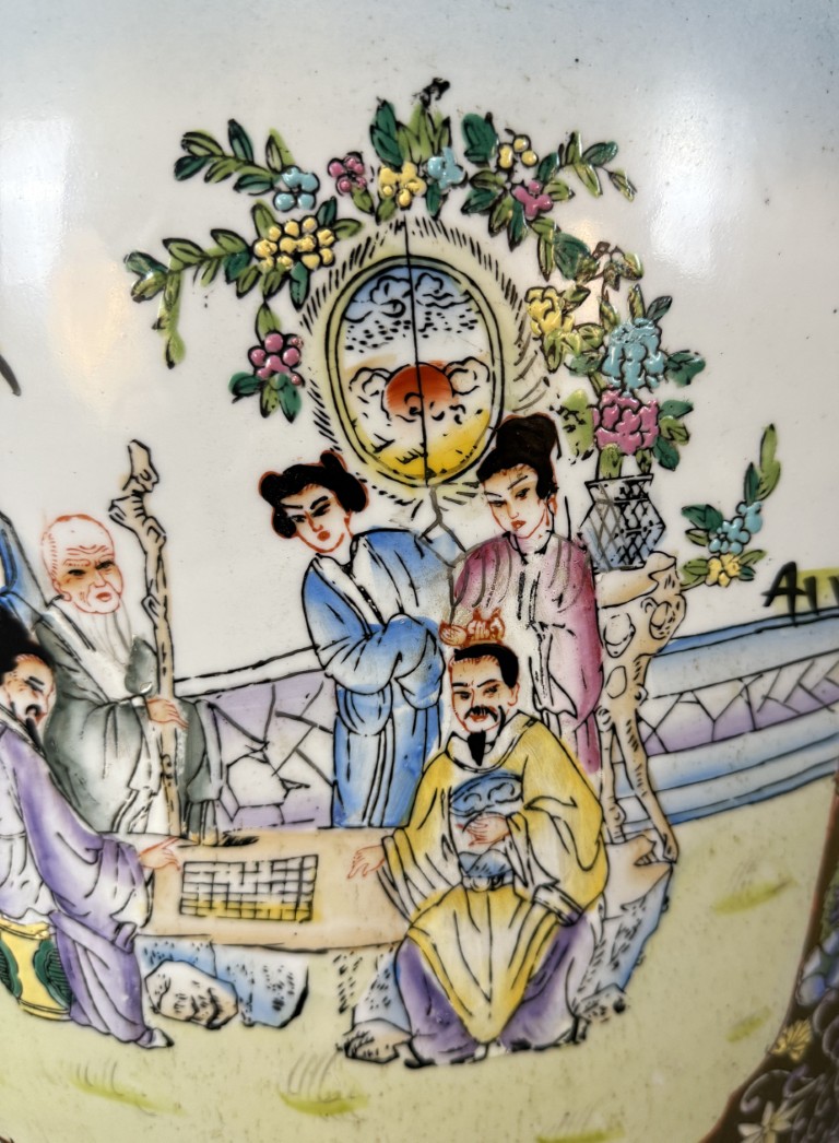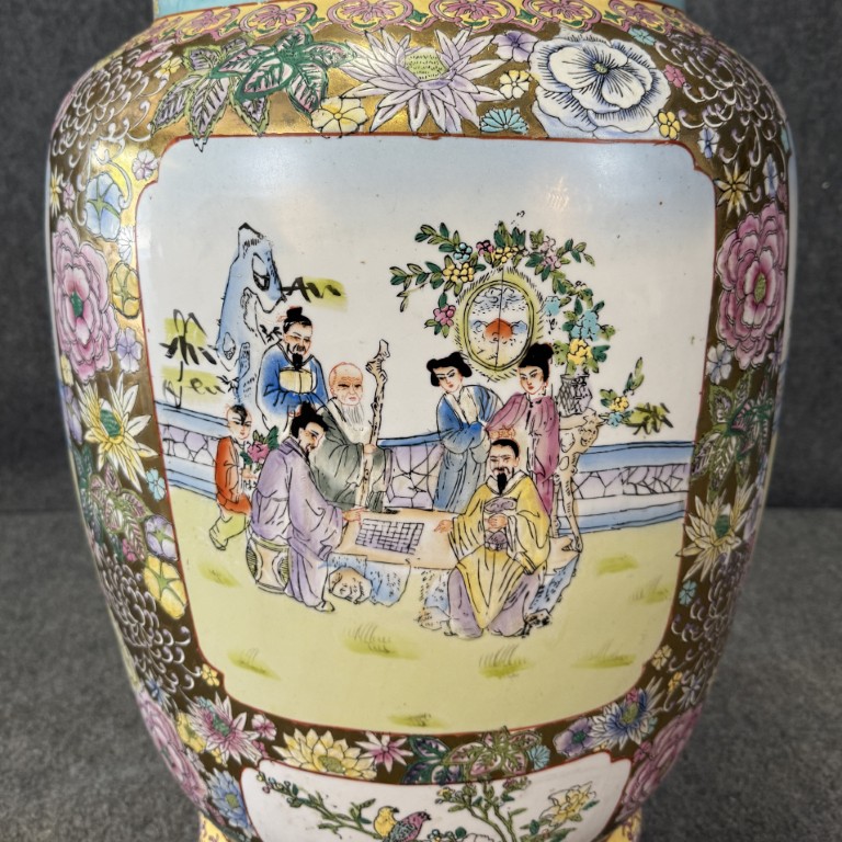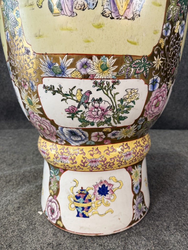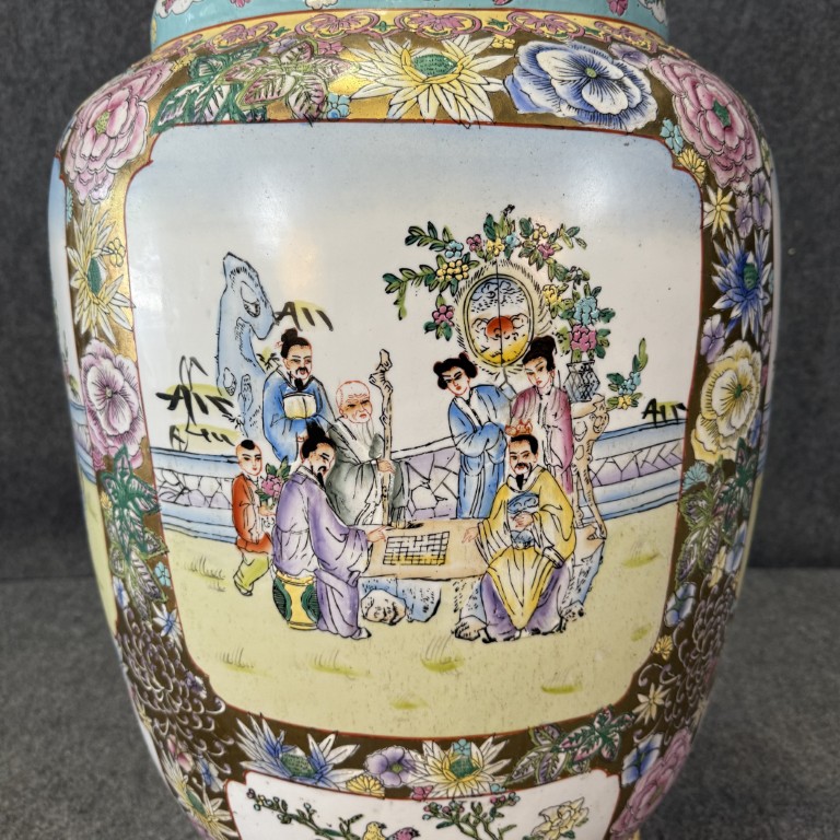 This Monumental Oriental Porcelain Palace Vase, standing at an impressive 43 inches tall, is richly hand-painted with intricate floral motifs and detailed scenes of figures in traditional attire gathered in an outdoor setting. Accented with gilt lion handles and vibrant pastel enamels, it stands as a striking example of fine craftsmanship and decorative artistry.