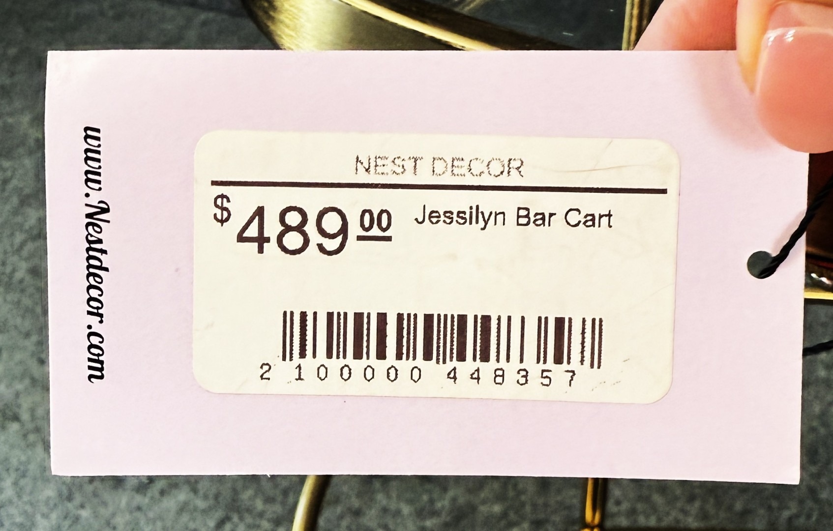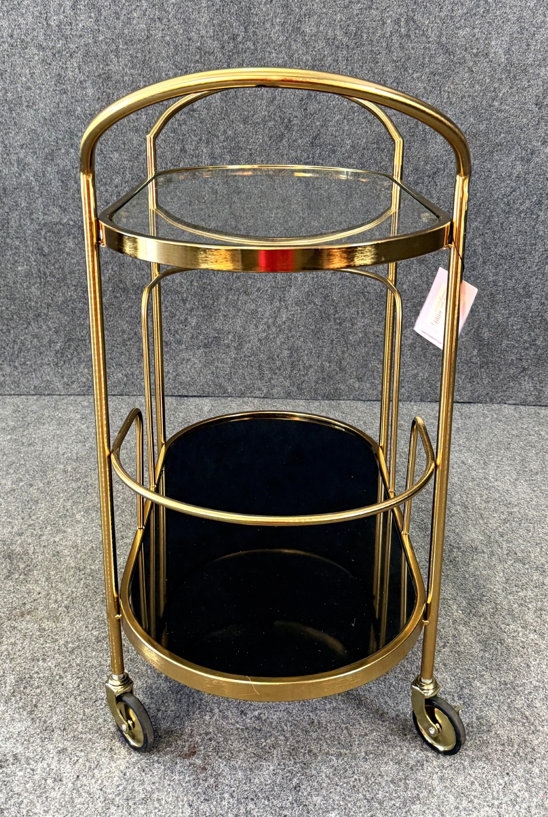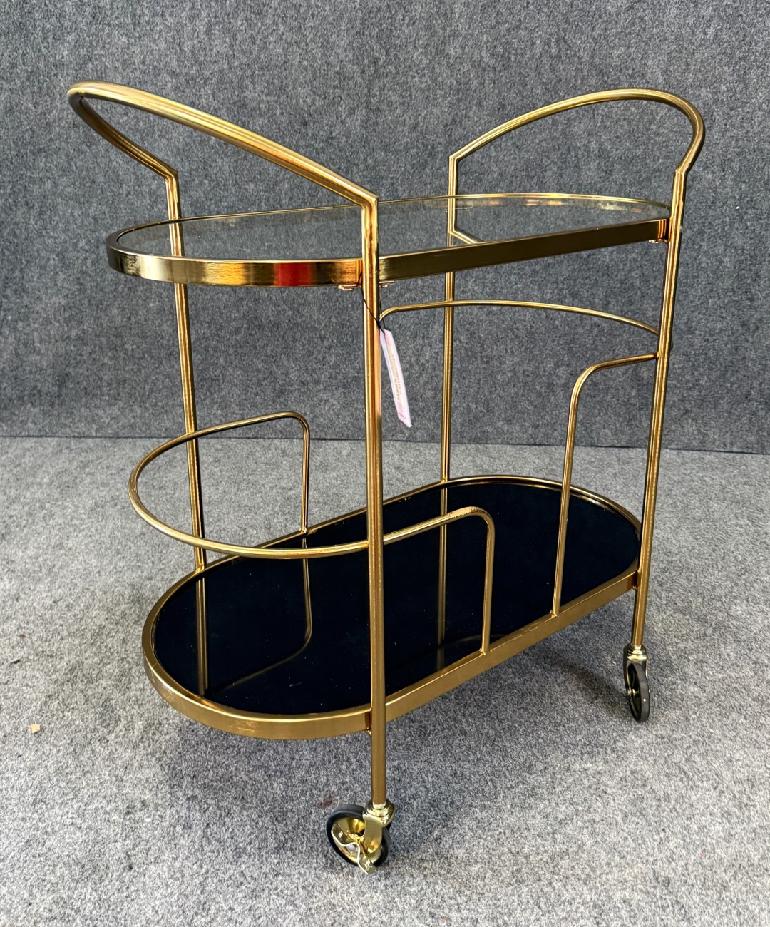 This new gold bar cart features a sleek metallic frame with curved handles, black glass base, and clear glass top for a glamorous look. Its tiered design offers ample storage for bottles and glassware, while smooth-rolling casters ensure easy mobility. With an original retail price of $489, it brings both style and function to entertaining spaces.