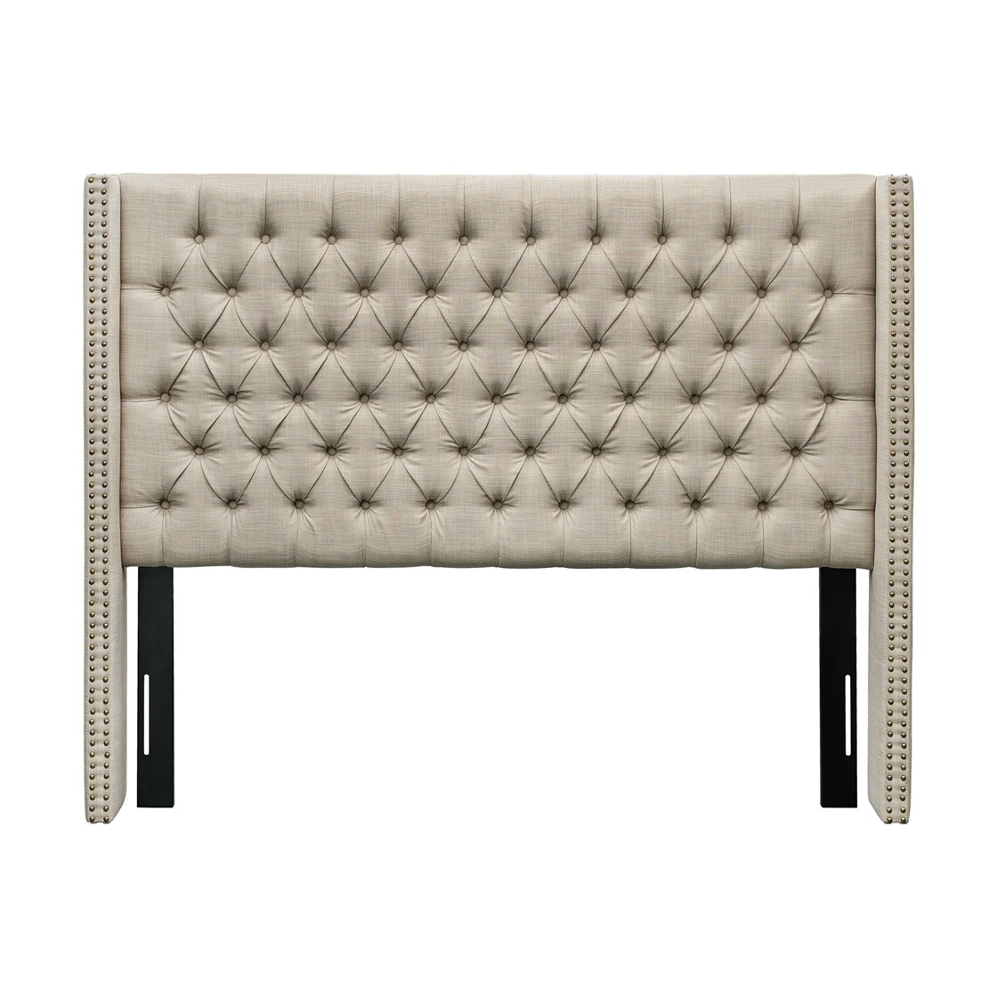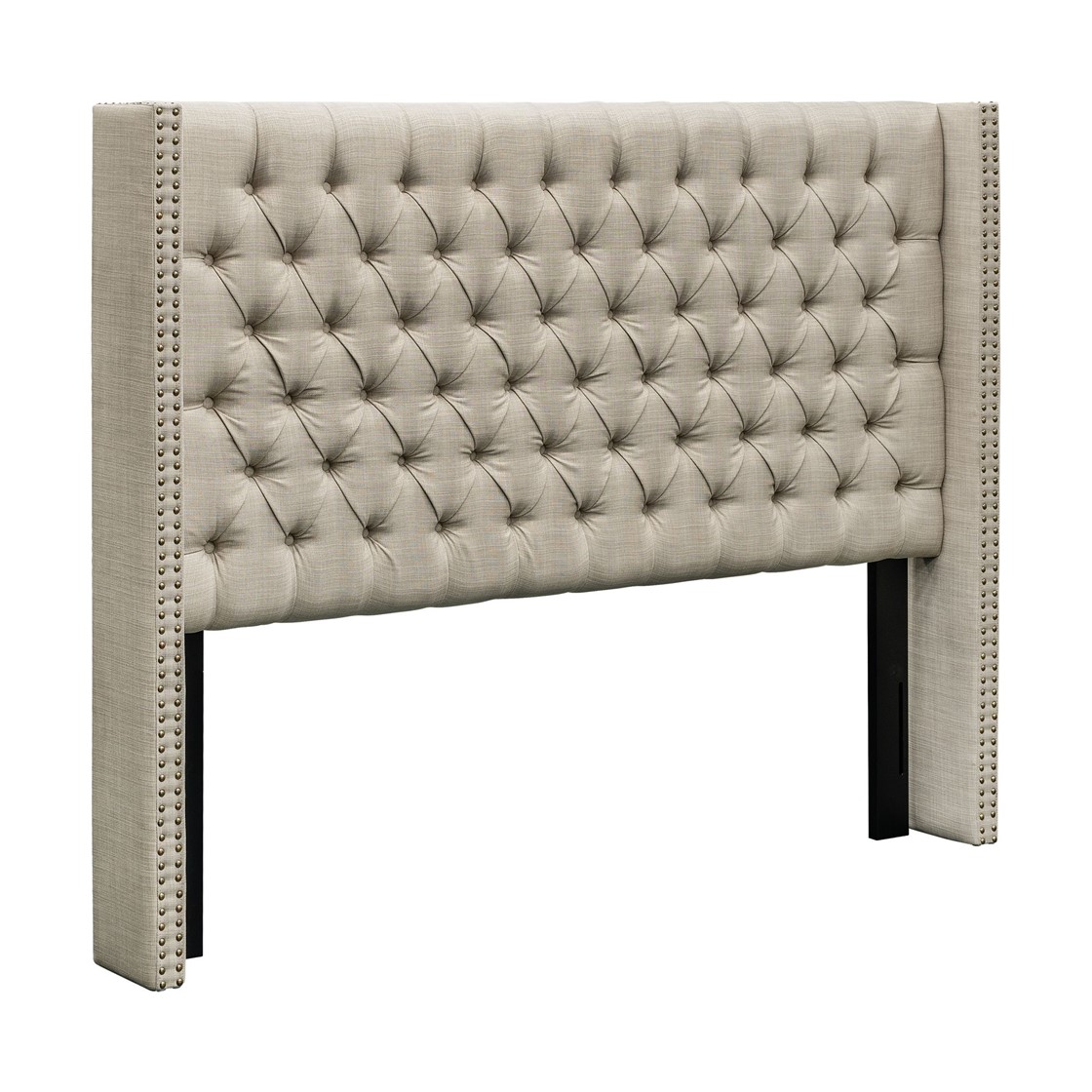 This new queen-size upholstered wingback headboard makes a refined statement with its classic silhouette, hand-tufted button detailing, and plush foam padding for added comfort. A double row of individually applied nailhead trim frames the soft neutral fabric, lending timeless sophistication suited to modern, transitional, or traditional bedroom décor.