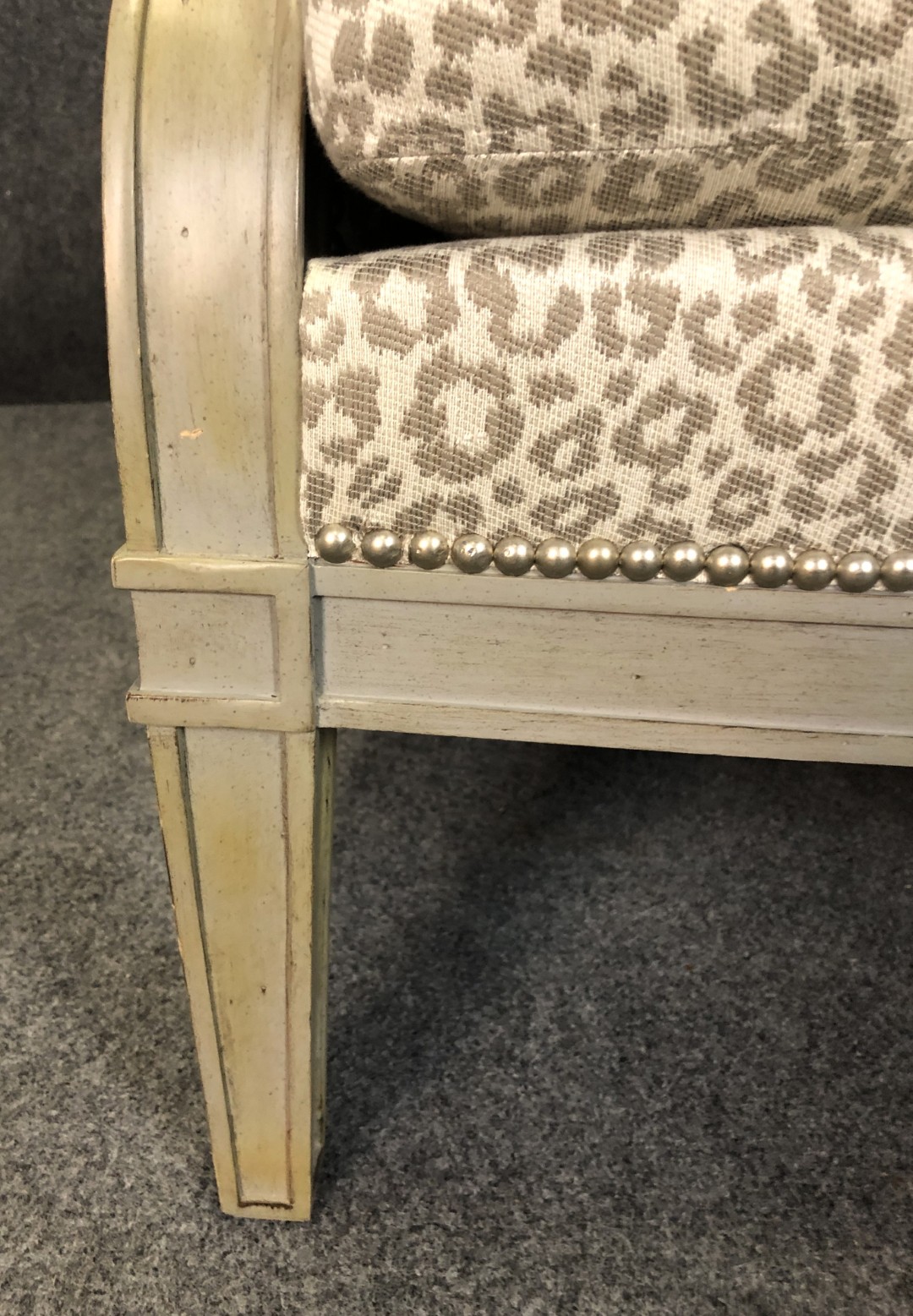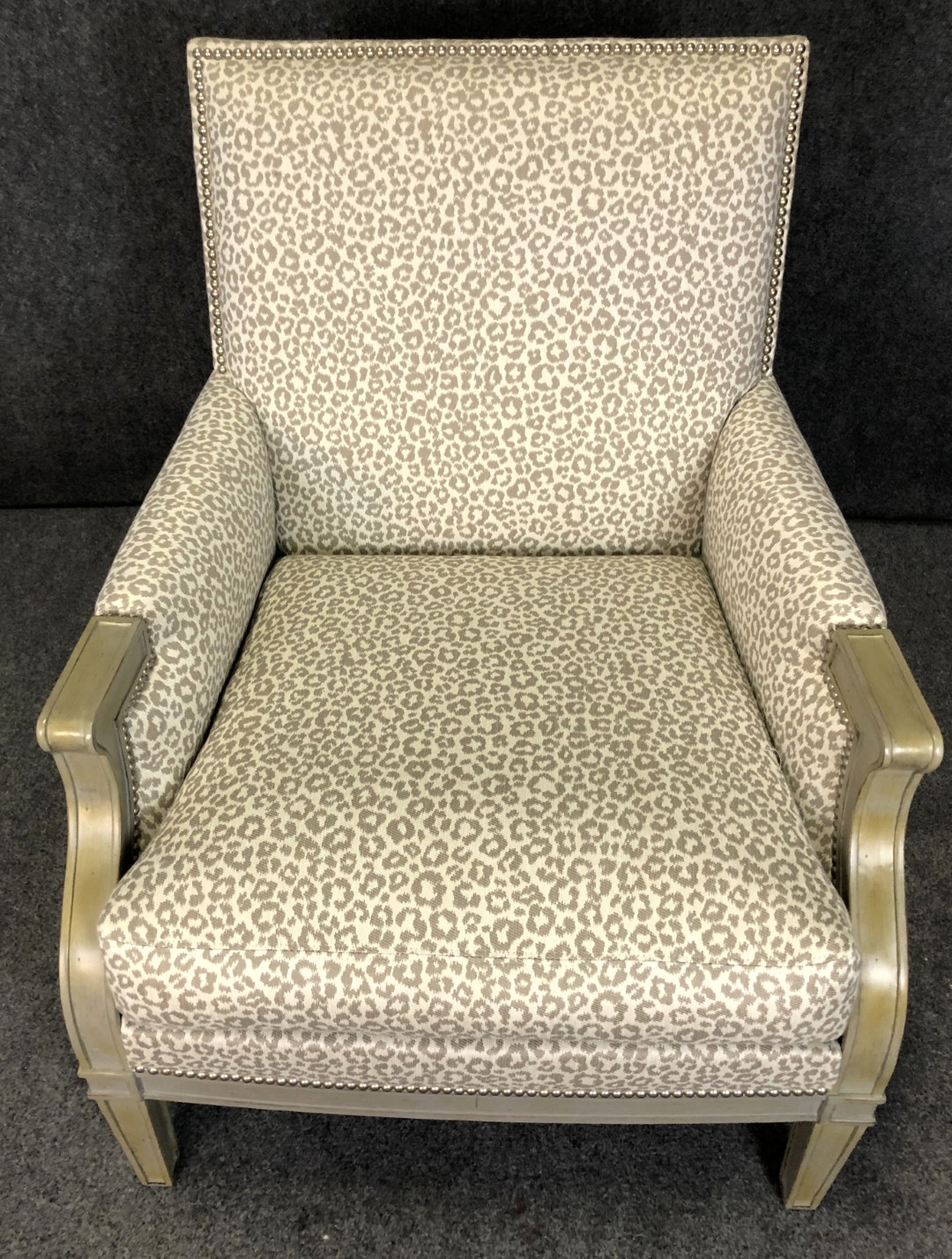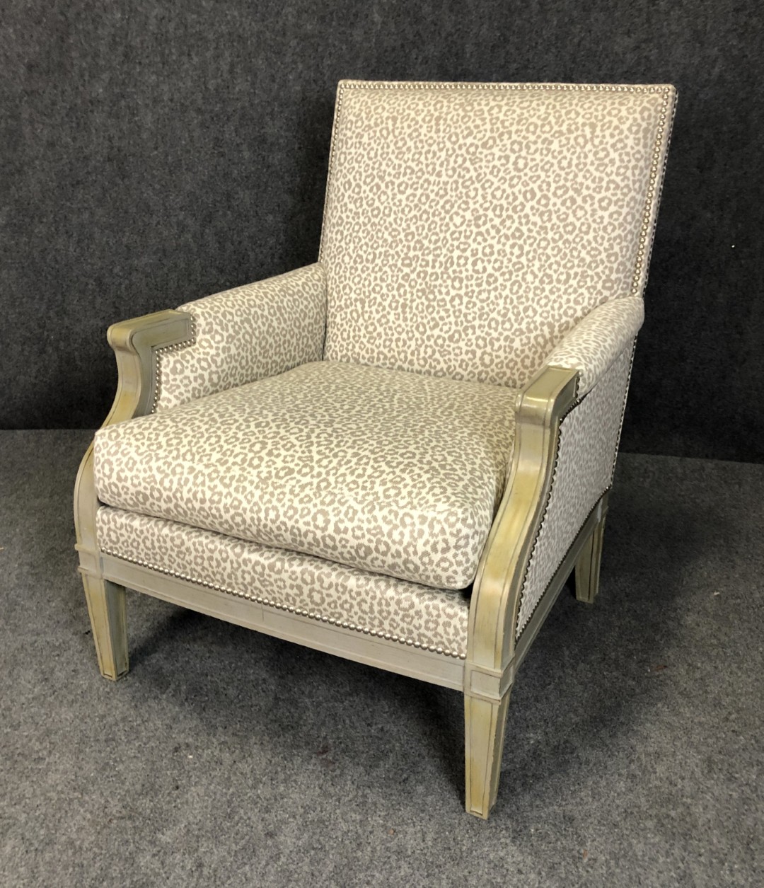 This new showroom sample Lillian August arm chair features a bold yet refined leopard print upholstery accented with nailhead trim. Its gracefully curved arms and painted wood frame give it a sophisticated, designer look. Stylish and comfortable, it brings a touch of modern glamour to any living space.