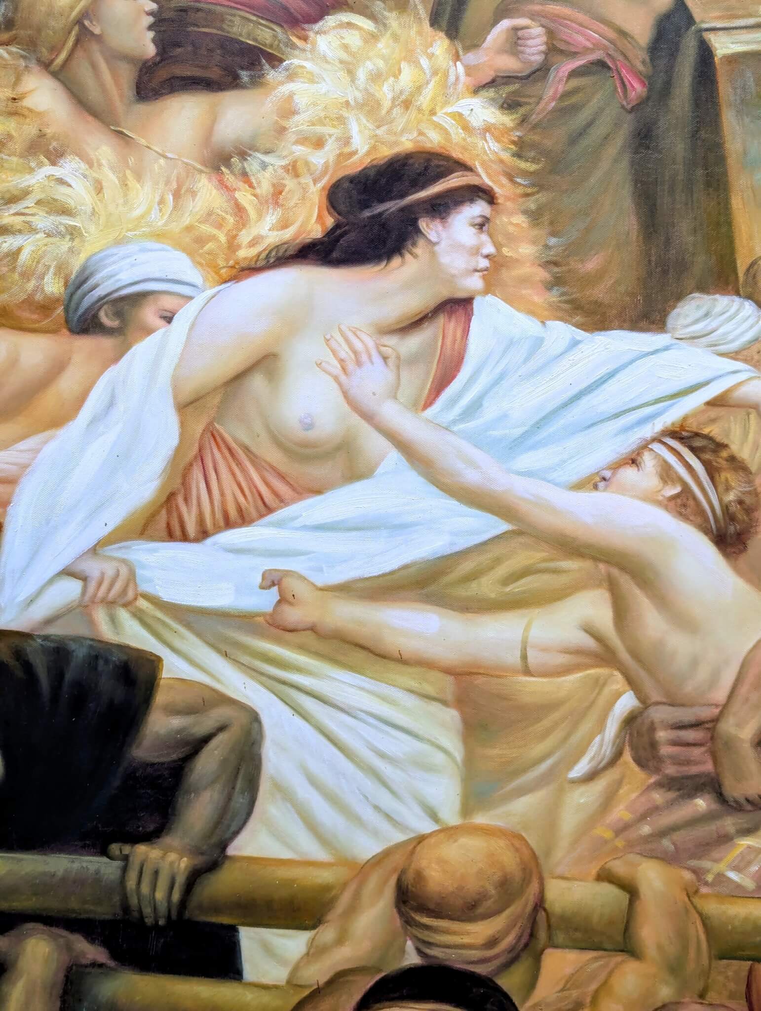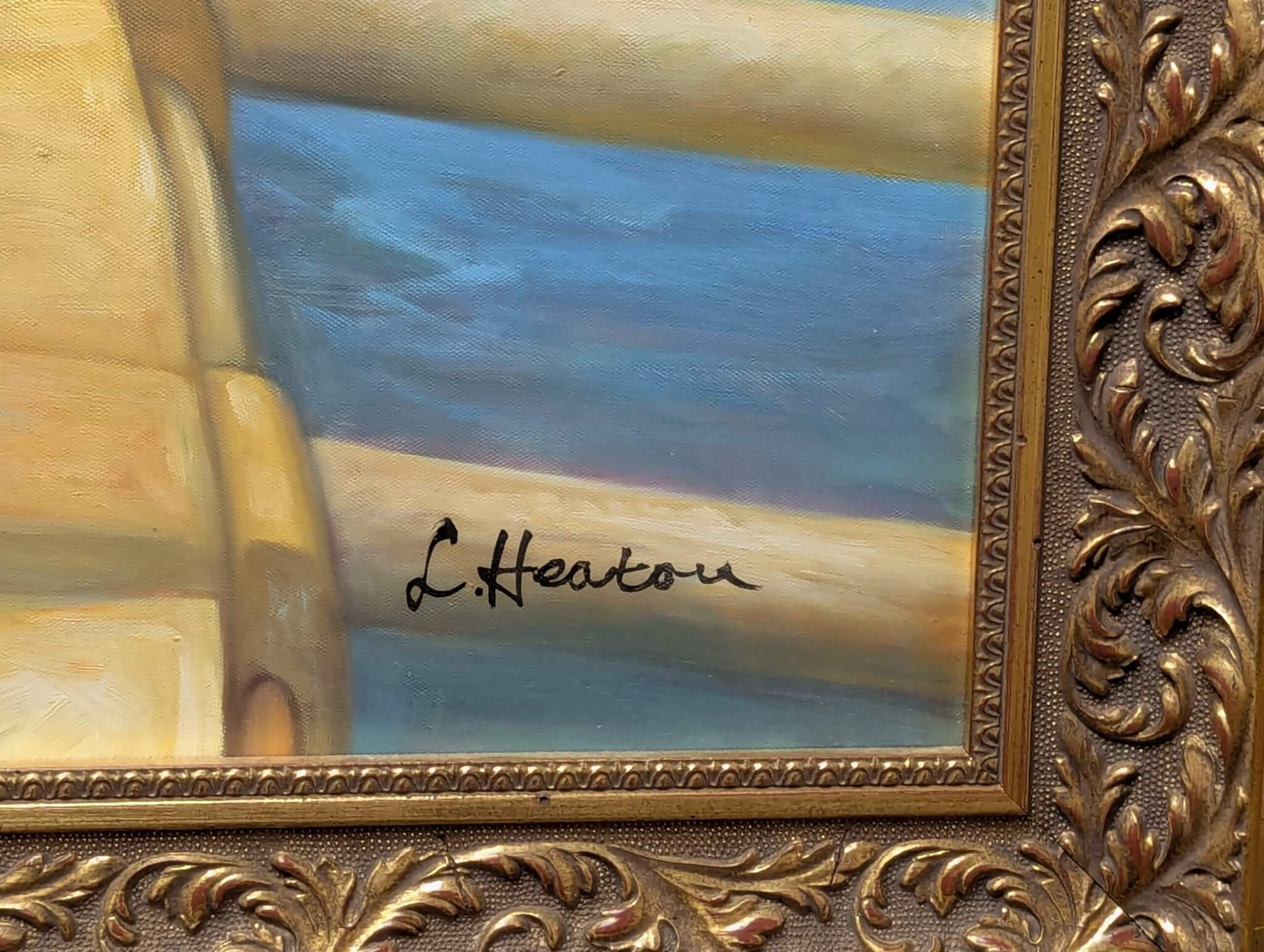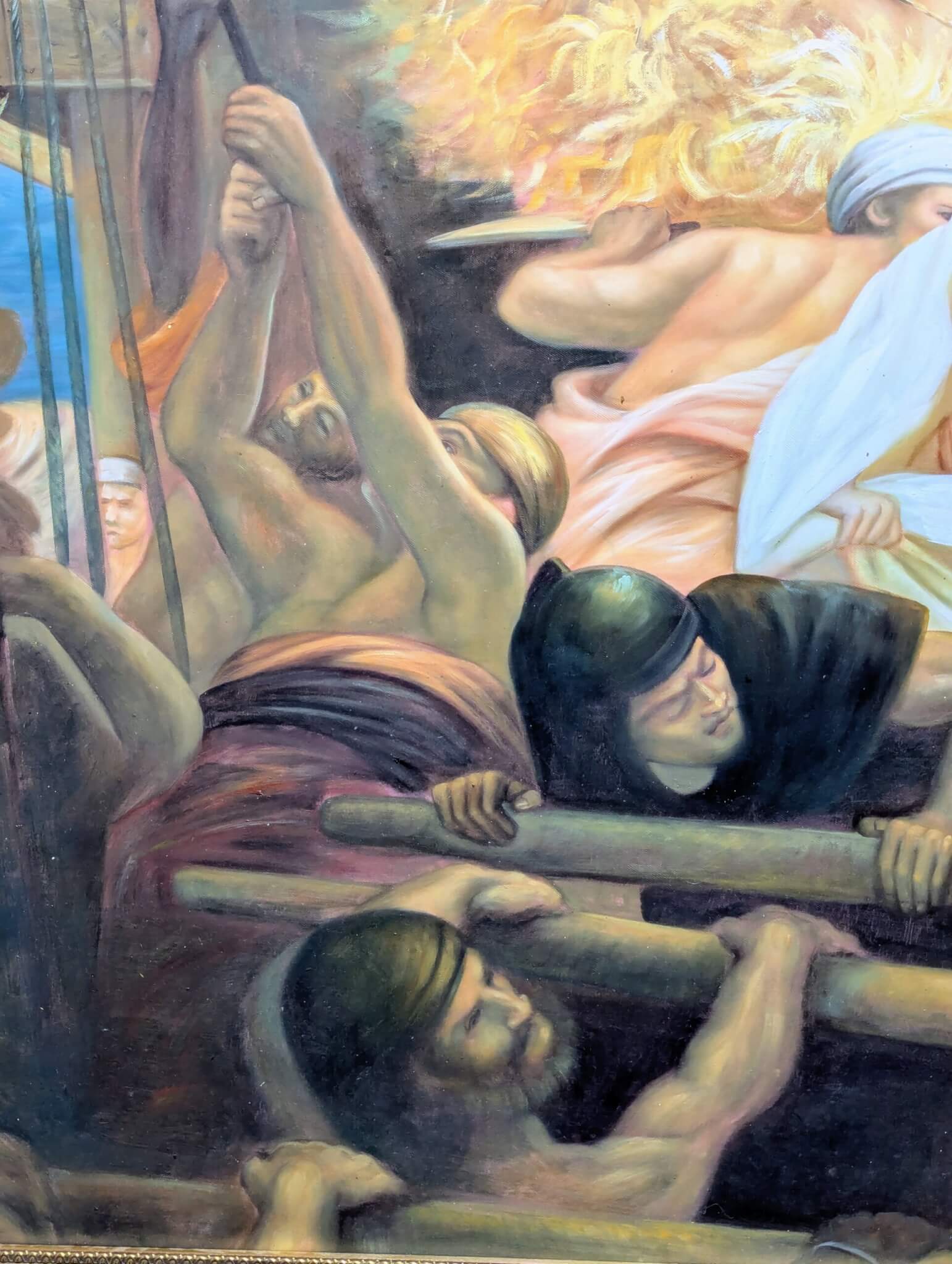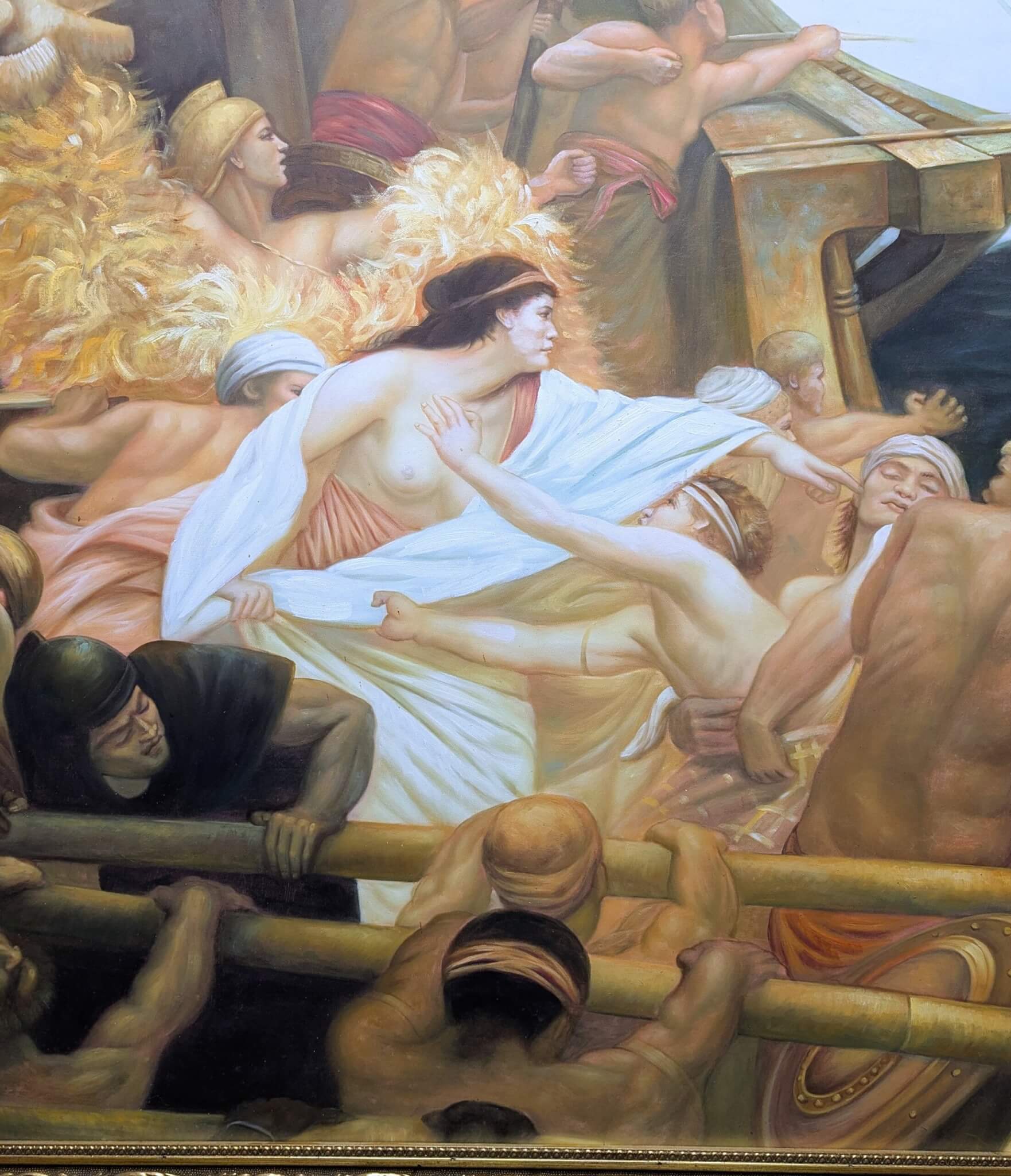 Classical Greek painting of Jason and the Argonauts with the sorceress Meda securing the magical “Golden Fleece “[circa 2003] Signed L. Heatou This very large and impressive oil on canvas features dynamic color, drama and animation while interpreting an adventurist tale from Greek Mythology. Wonderfully large and beautifully enhanced by an intricately detailed gold frame, it’s bound to be a statement piece in any room.