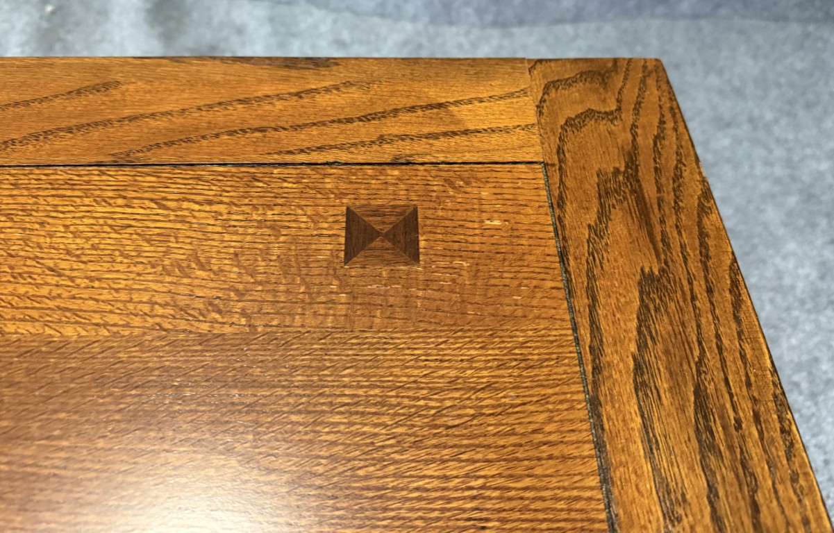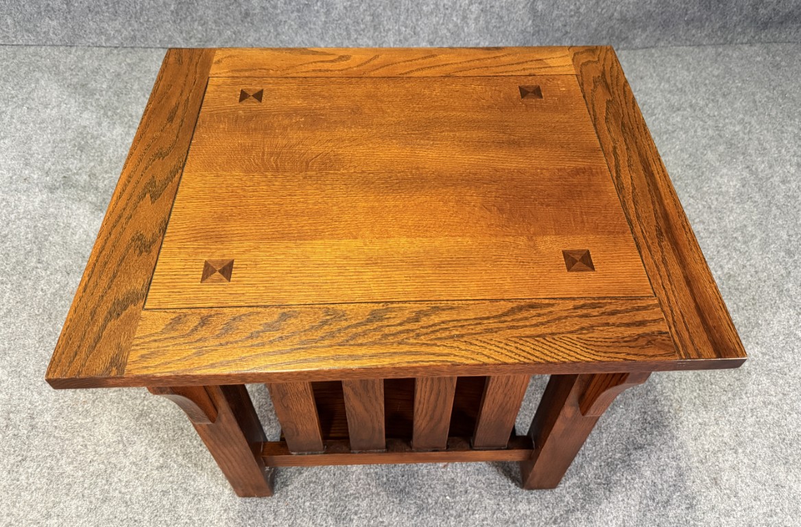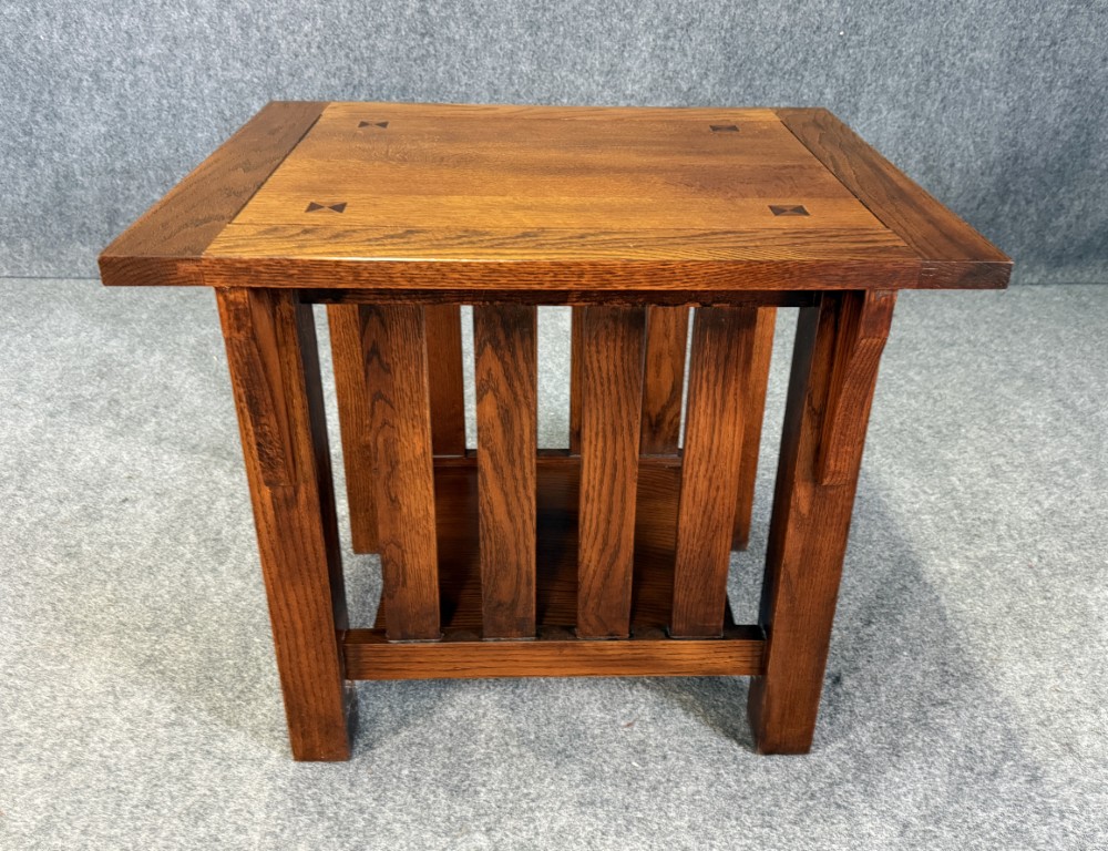 This oak Mission style side table features clean, rectilinear lines with slatted sides and a sturdy, handcrafted feel true to the Arts & Crafts tradition. A paneled top with subtle inlay accents and a lower shelf provide both visual interest and practical surface and storage space.