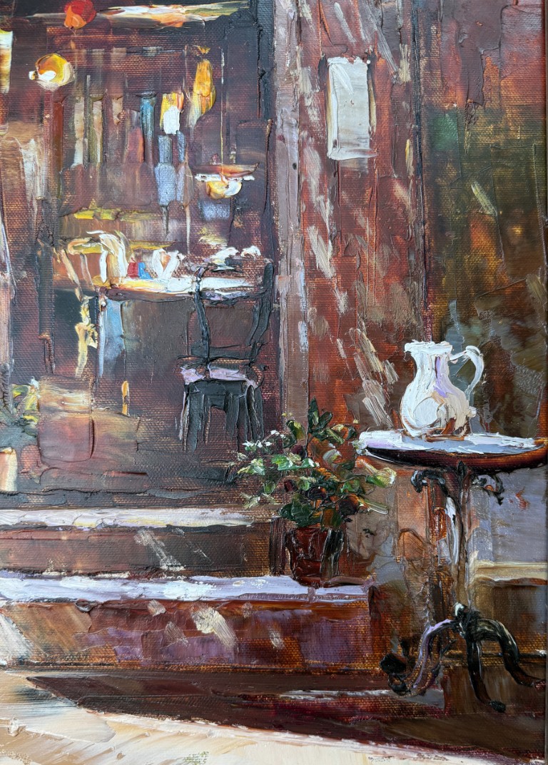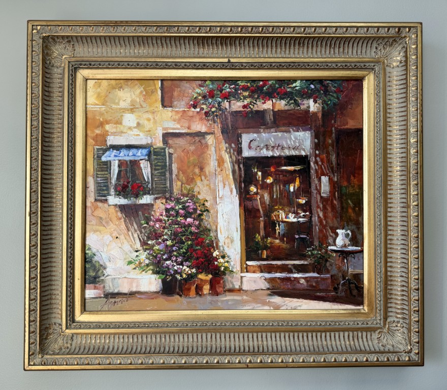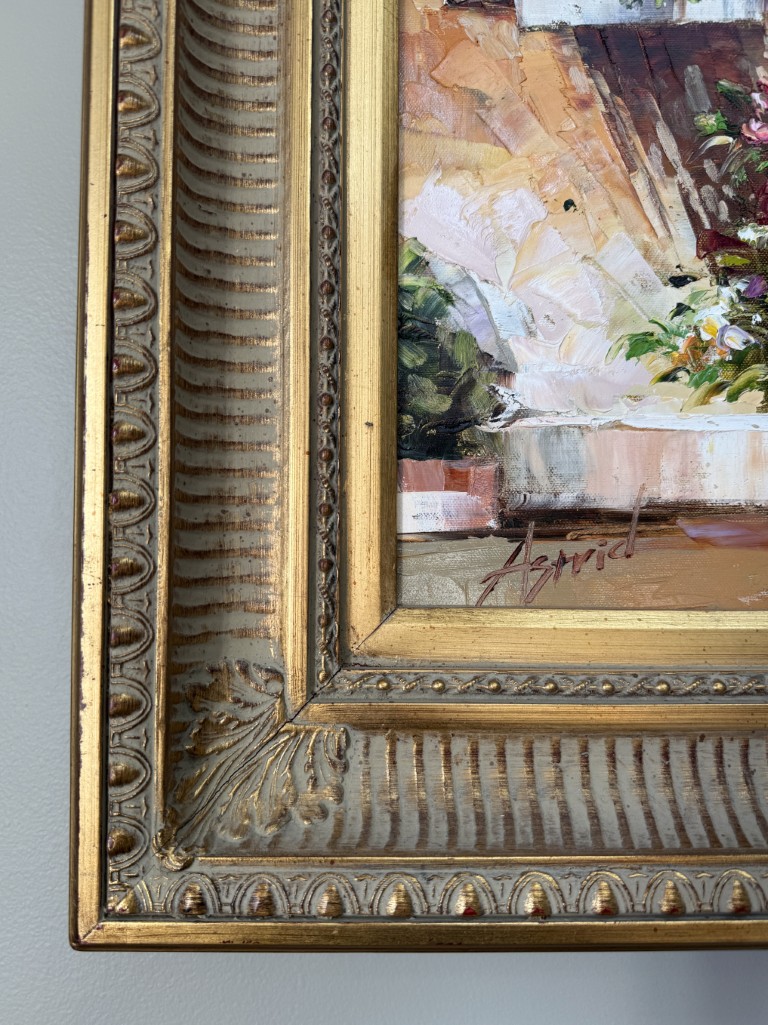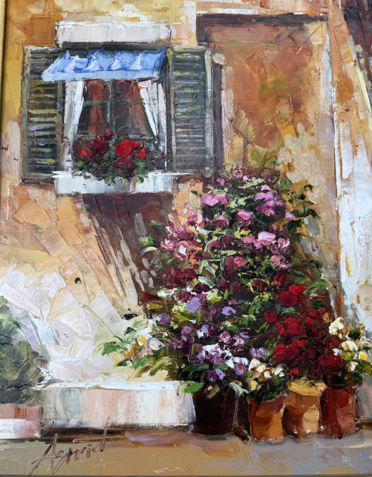 This charming oil on canvas depicts a sun-washed Italian café façade, where warm stucco tones, flowering pots, and an inviting doorway create a romantic Mediterranean atmosphere. Signed Astrid, the painting’s rich palette and expressive brushwork capture the intimate beauty and leisurely charm of a quiet European street scene.