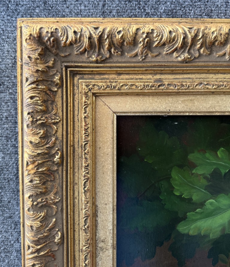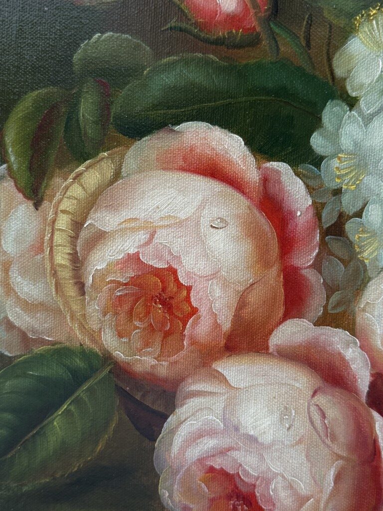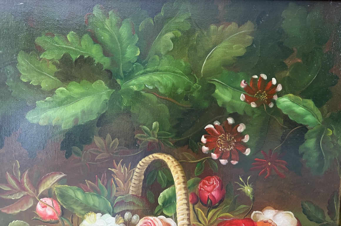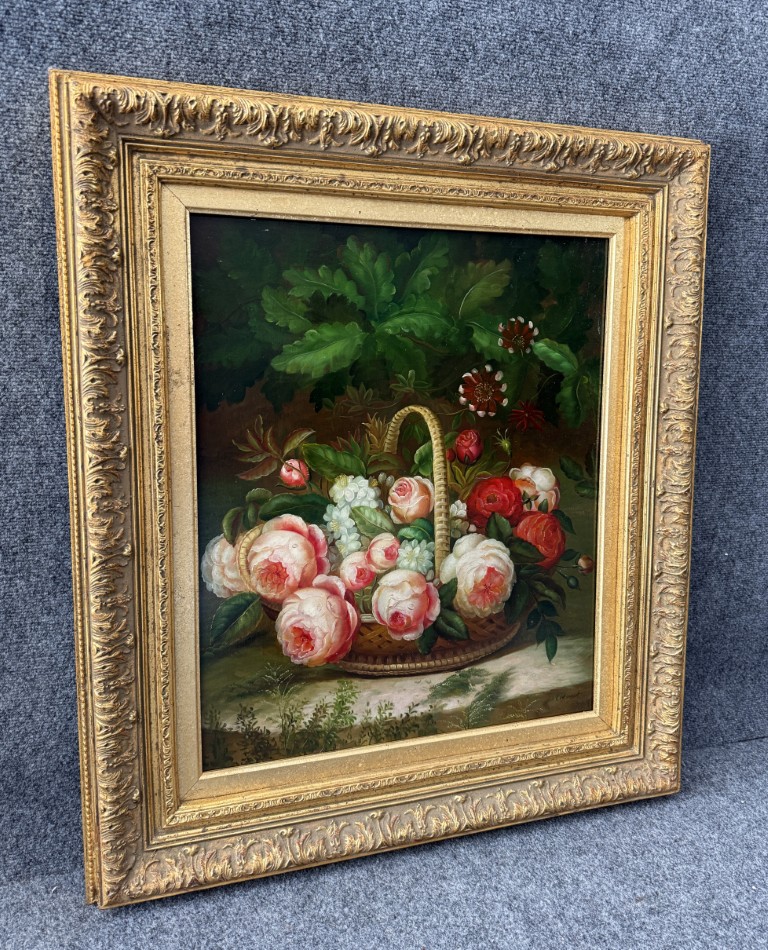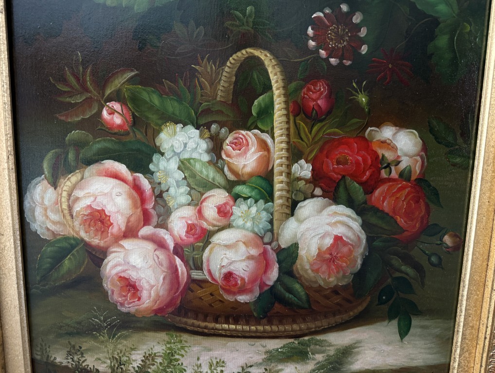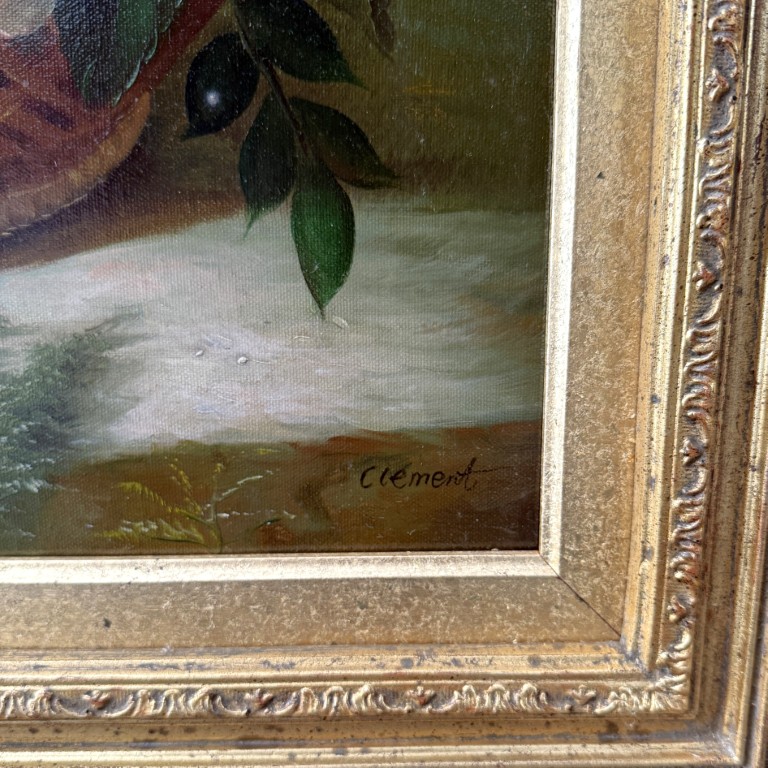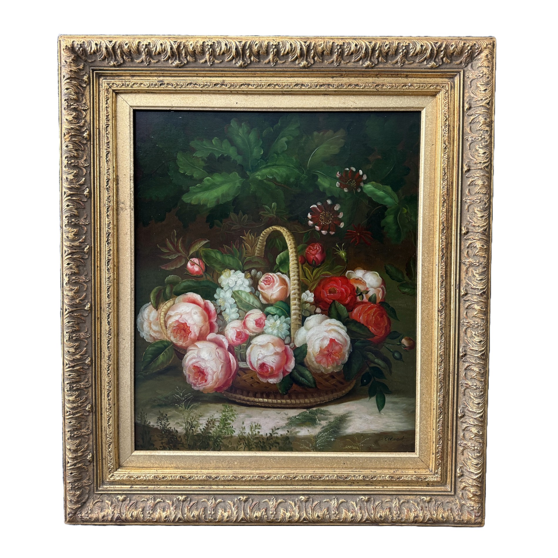 This original floral still life oil on canvas, signed Clement, depicts a lush basket overflowing with blooming roses and garden blossoms. The artist’s detailed brushwork highlights the soft petals, rich greenery, and naturalistic textures with striking realism. Set against a dark background and framed in an ornate gilt frame, the piece exudes timeless elegance and classical charm.
