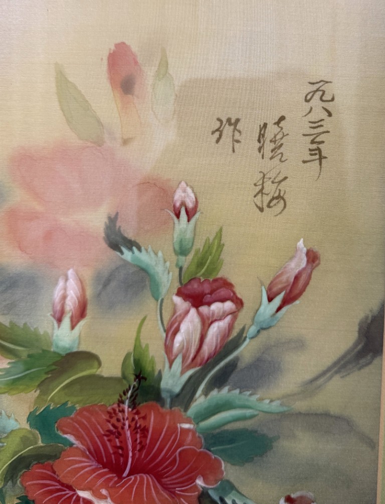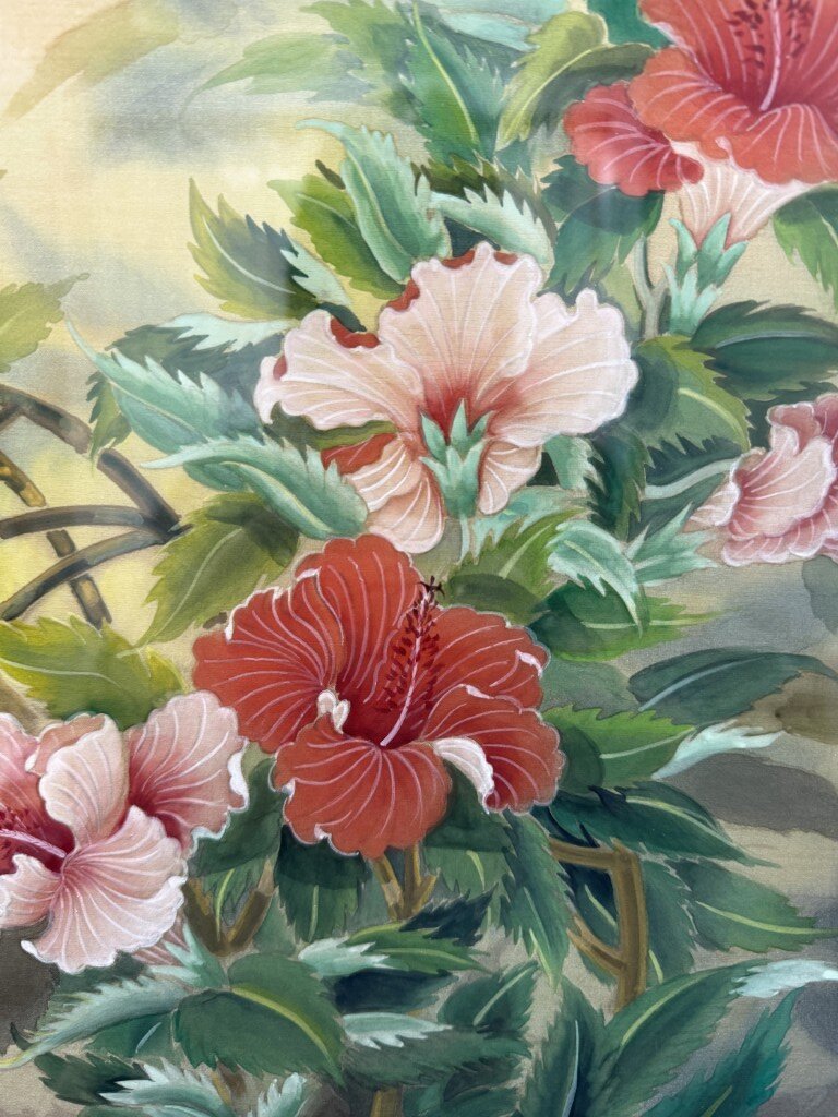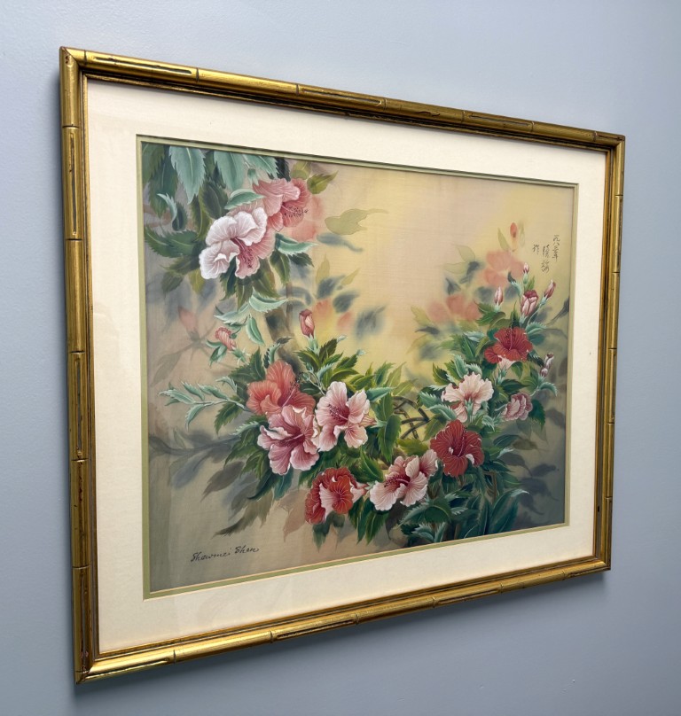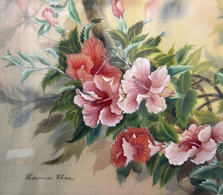 This original watercolor by Shawmei Shen features a graceful arrangement of hibiscus-like blossoms in soft pinks and corals, surrounded by lush foliage and set against a warm, atmospheric background. Fluid brushwork and delicate color transitions reflect East Asian painting traditions, creating a serene floral composition that emphasizes harmony and natural beauty.