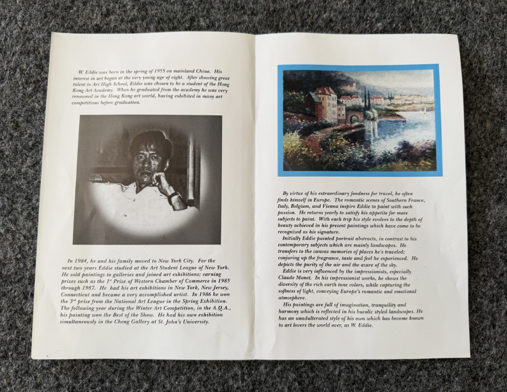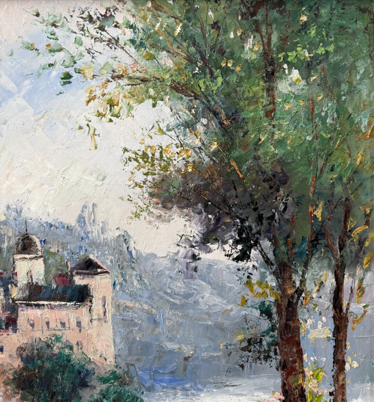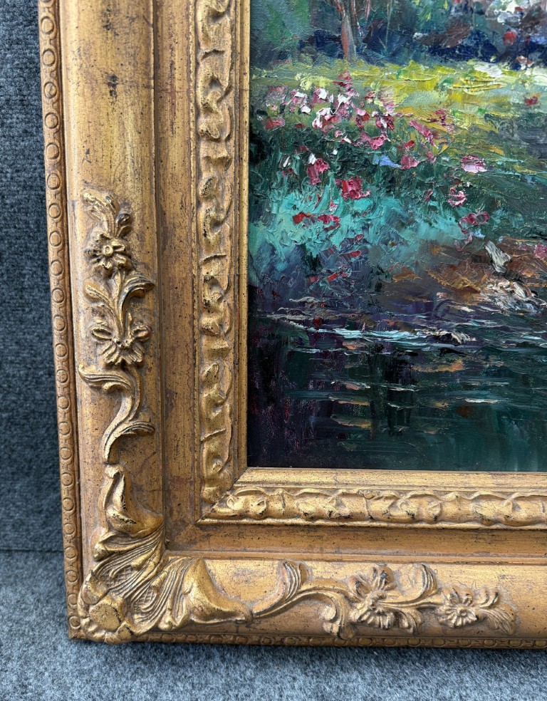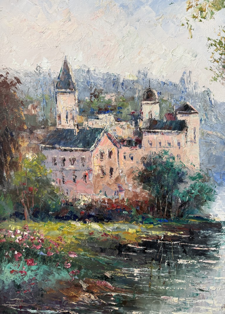 This original oil on canvas by W. Eddie depicts a tranquil riverside castle surrounded by lush greenery and soft, misty light, rendered in the artist’s signature impressionistic style. The palette knife technique and vibrant color transitions bring movement and depth to the serene European landscape. Born in 1955 in China and later based in New York, W. Eddie gained international recognition for his romantic depictions of France and Italy, celebrated for their harmony, luminosity, and poetic atmosphere.