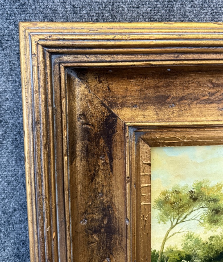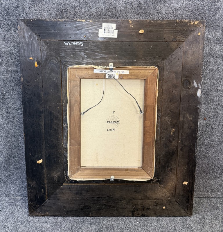 This original oil on canvas depicts a charming riverside village, with whitewashed houses topped in terracotta roofs nestled against rolling hills. A church tower rises prominently above the town, while lush greenery and a calm river with a moored boat complete the idyllic scene. Signed “Cala,” the painting is beautifully framed in a richly textured, rustic gilt frame that enhances its old-world character.