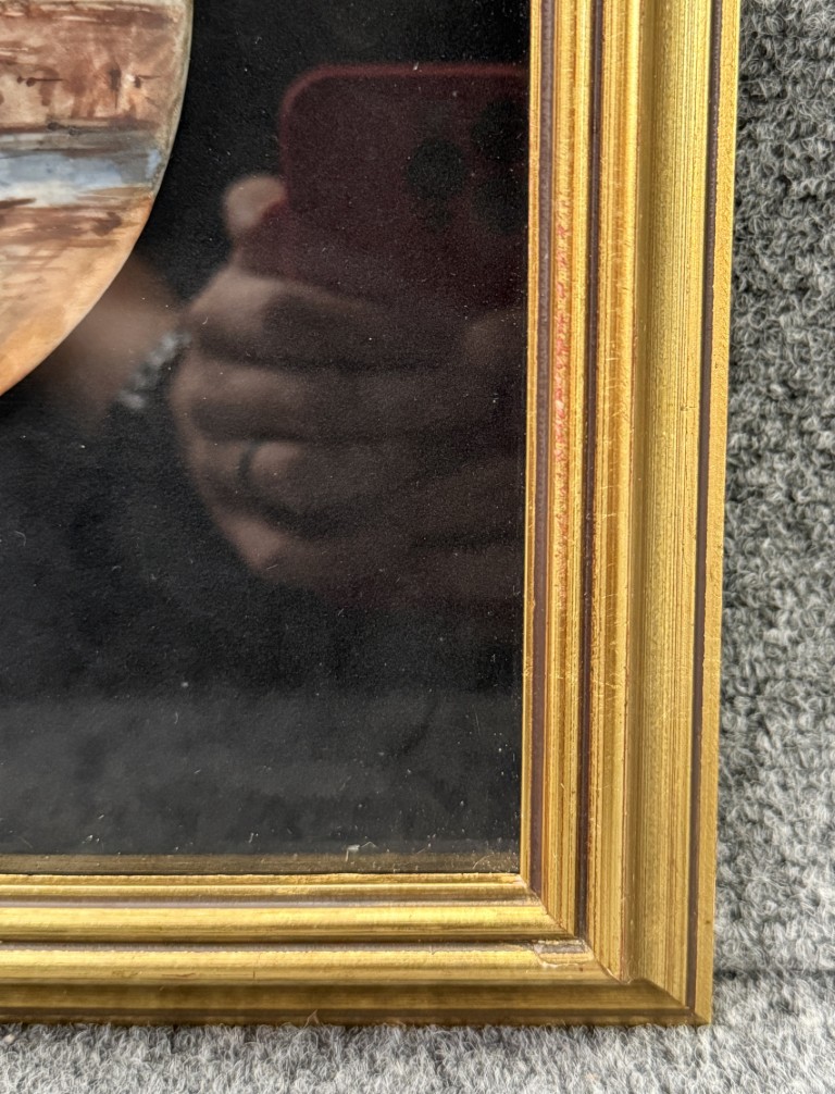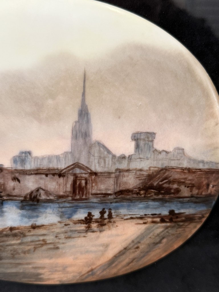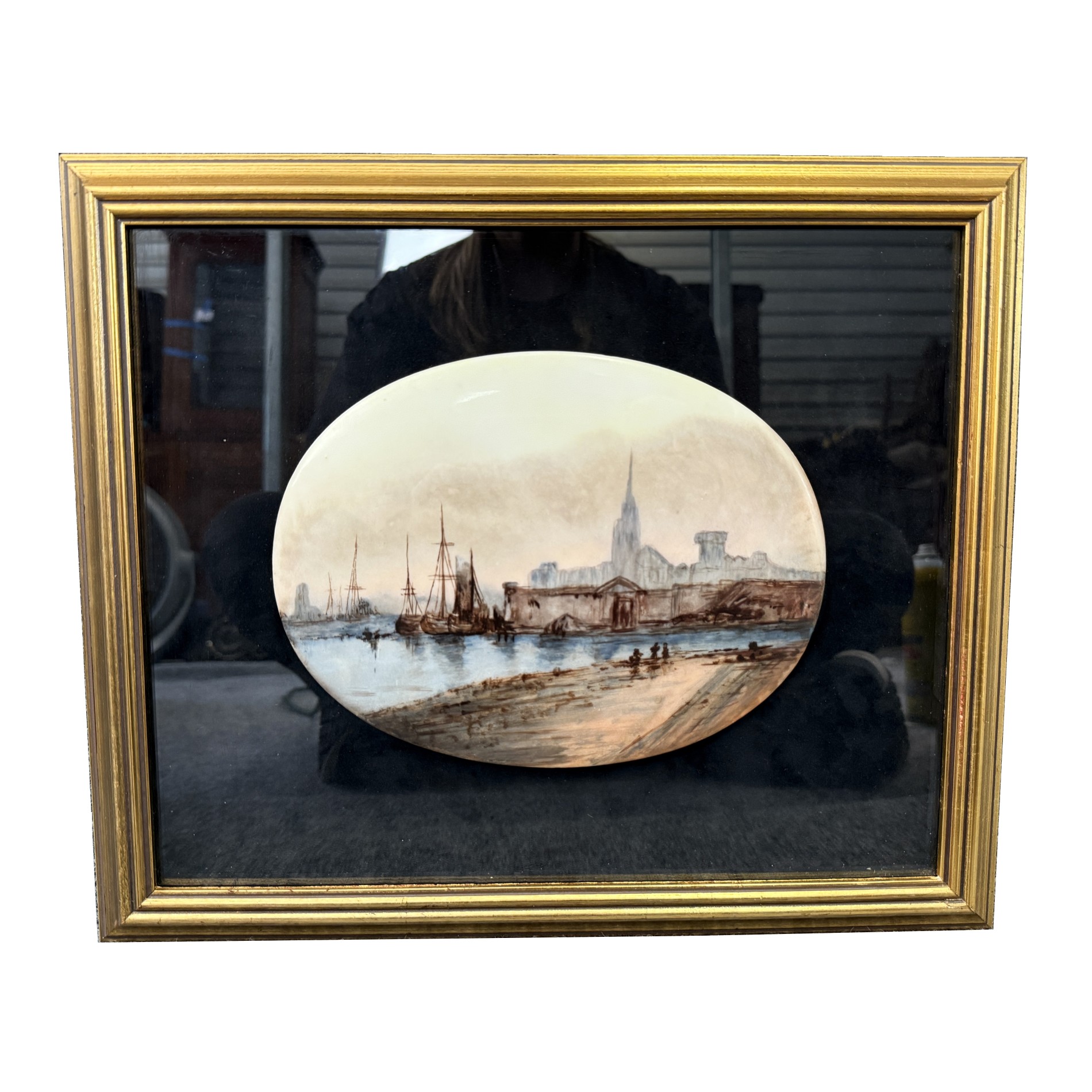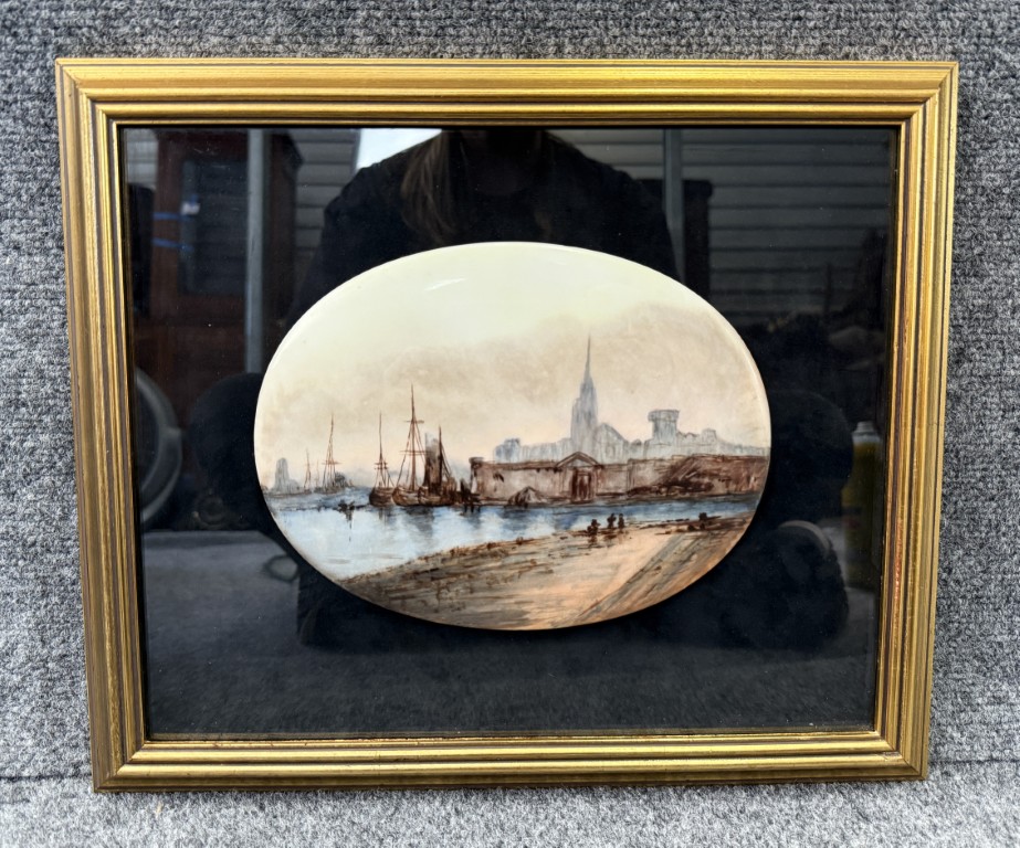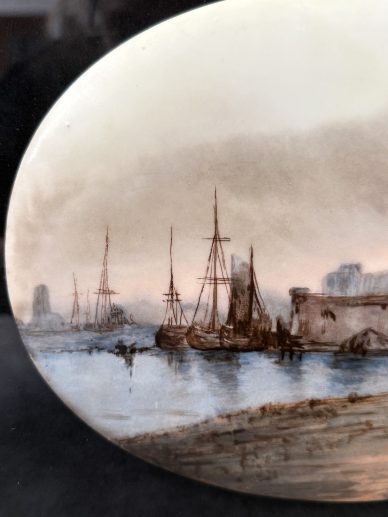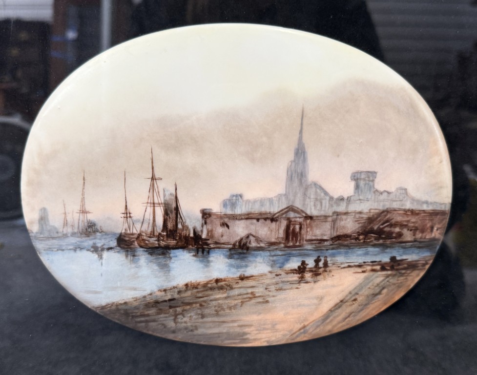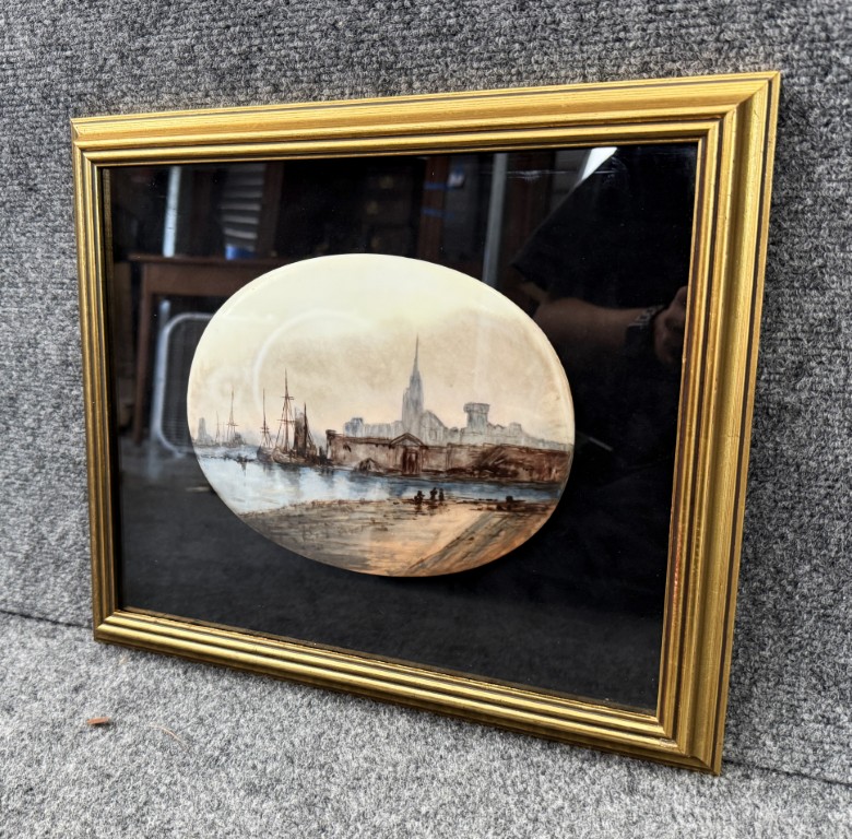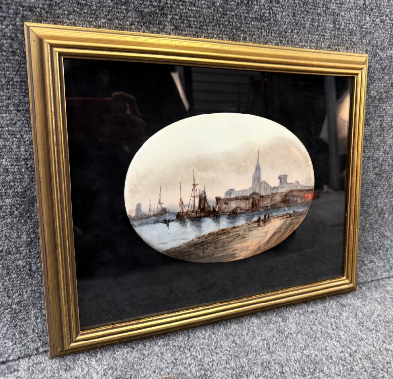 Original Pastel on Enamel Medieval Harbor Scene