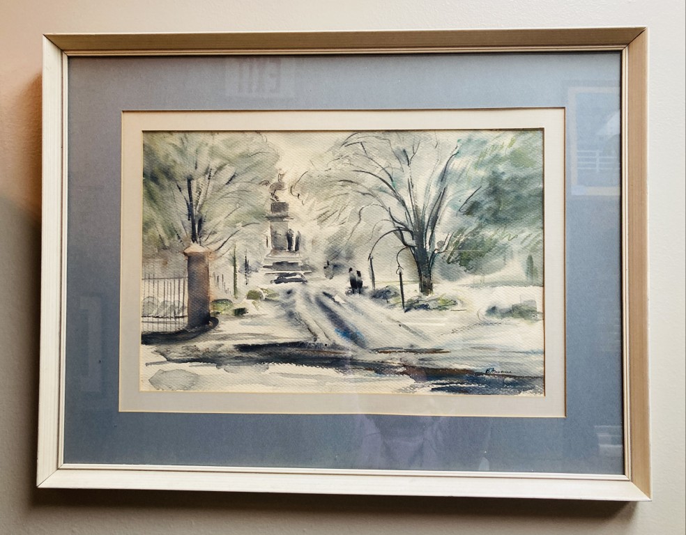 Original Signed Mid-Century Watercolor of Winter Scene in Park
