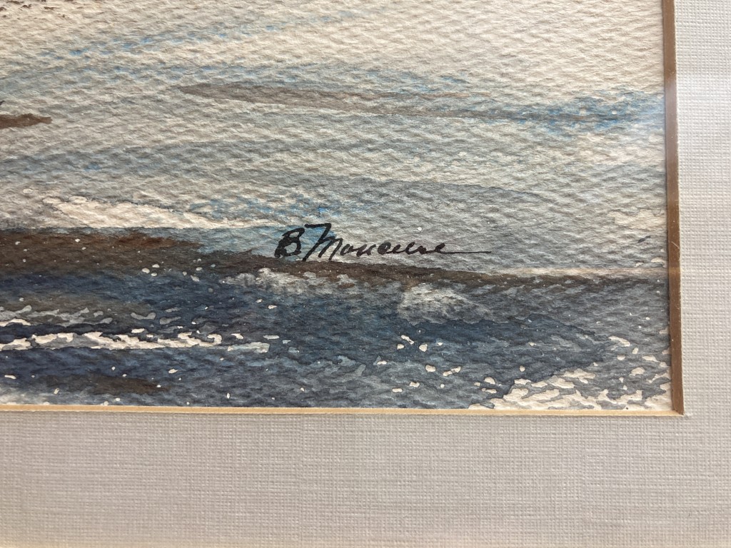 Original signed mid-century watercolor painting of a winter park scene, with a double mat and cream color original frame.