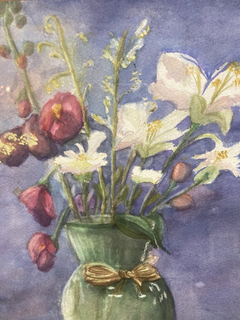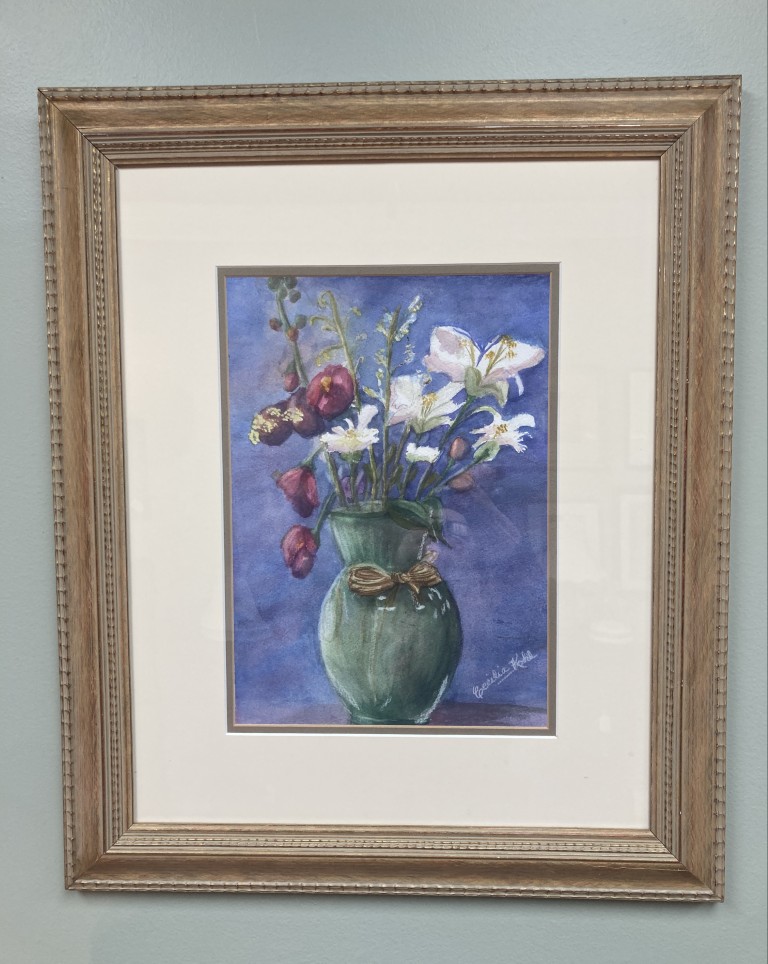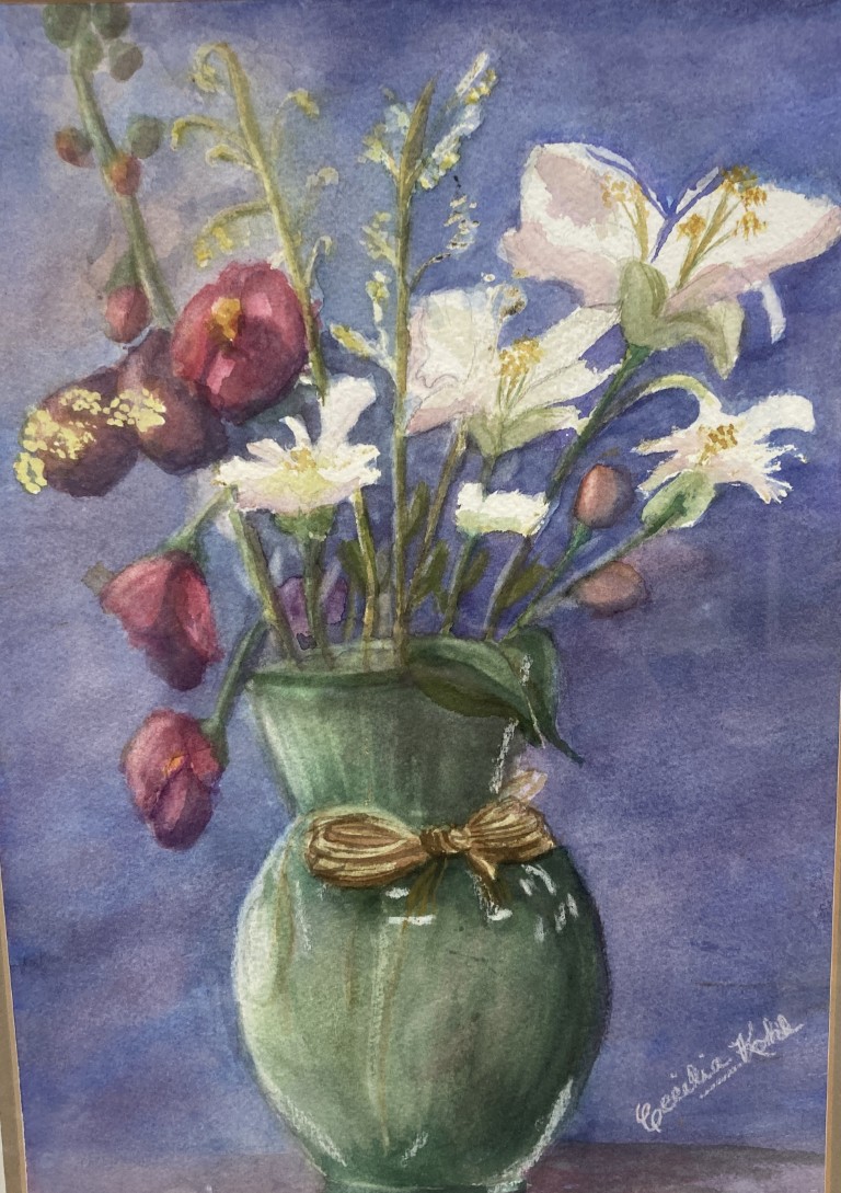 Original Signed Watercolor Floral Painting by Cecilia Kohl Flowers in a green vase.