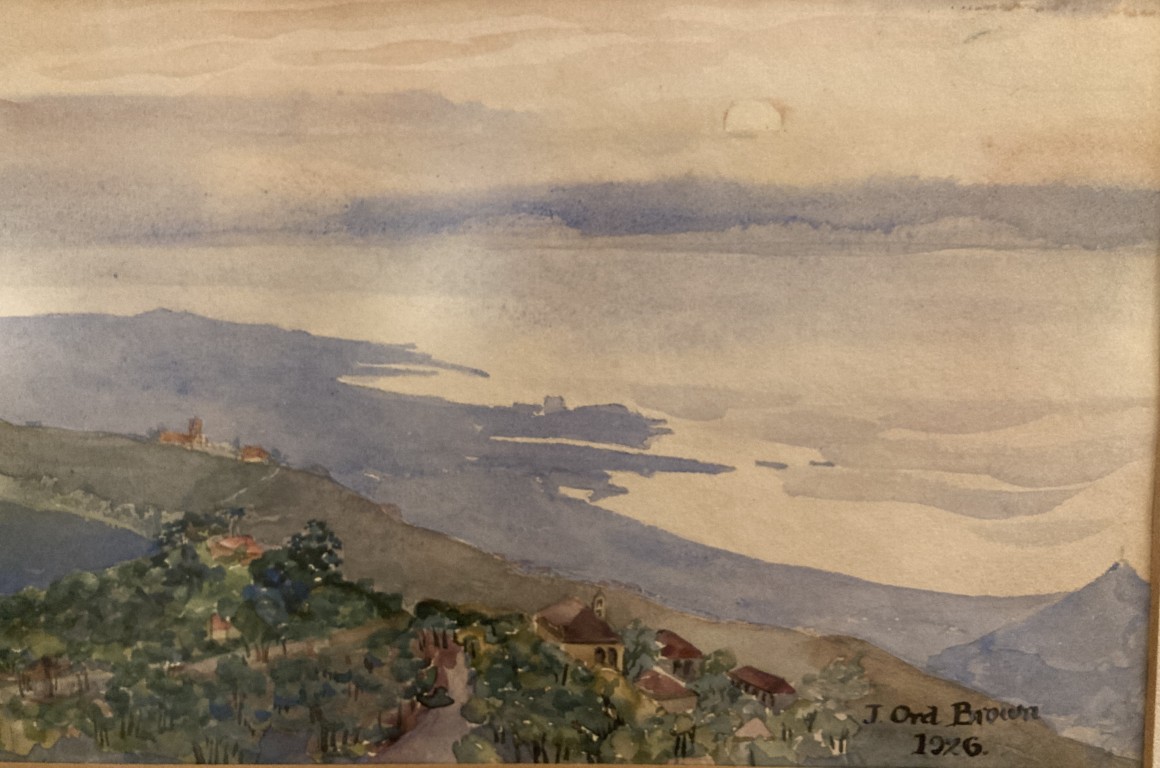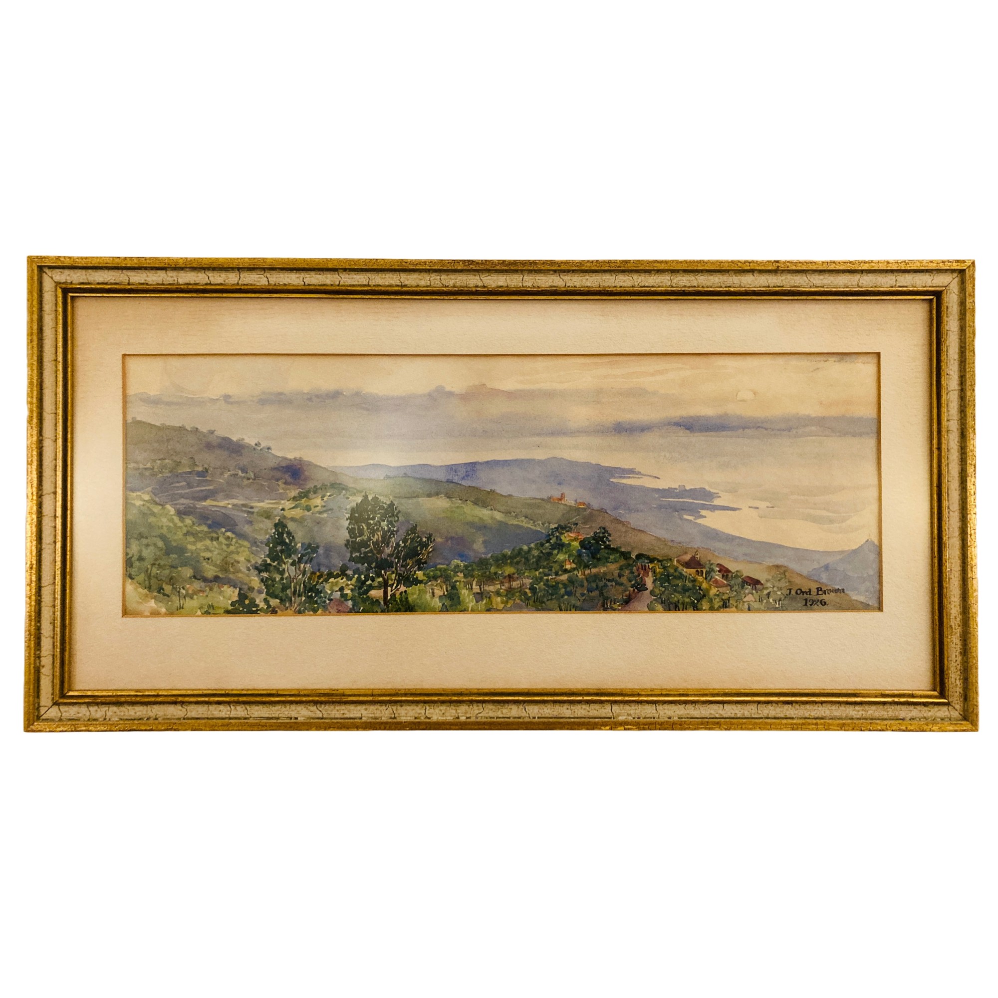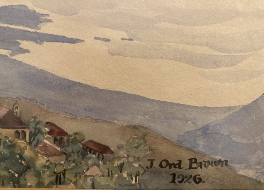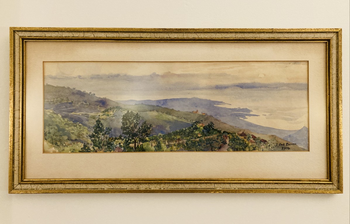 Original signed and dated 1926 watercolor, ‘View from Brummana, Lebanon Looking Southwest Over Beirut’ by Joyce Ord-Brown (1897-1974), South African. On reverse is the documentation ‘Gift of Theda Belle Phelps, 1958’. Theda Belle Phelps was an American nurse and missionary.