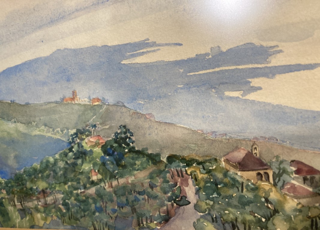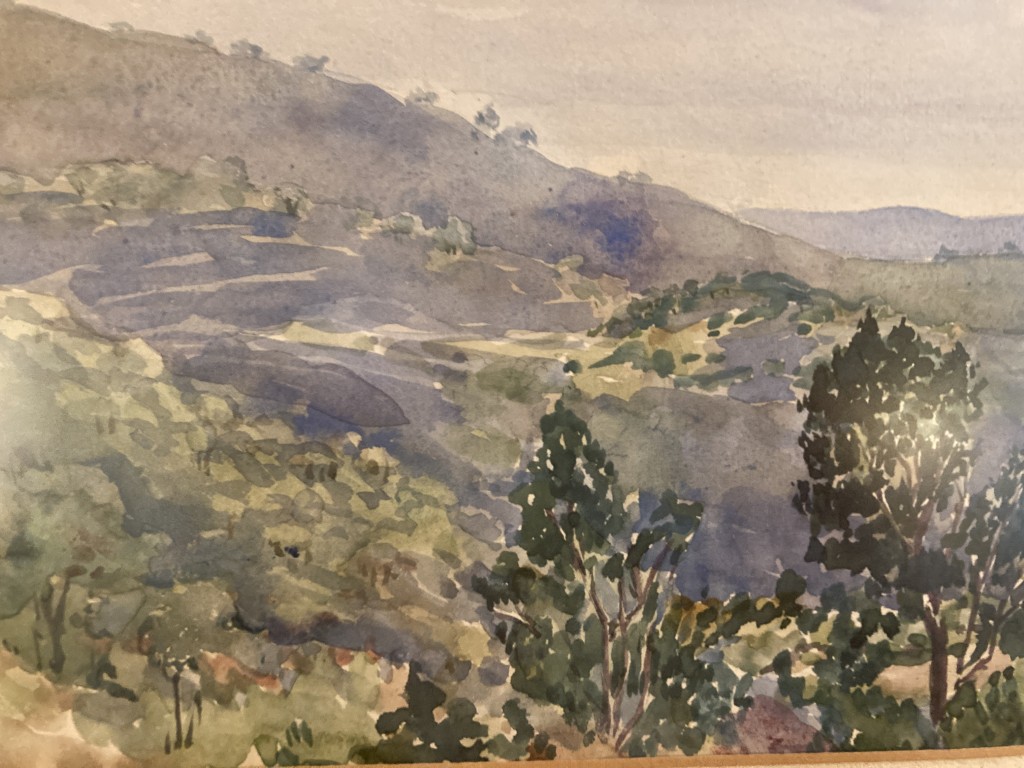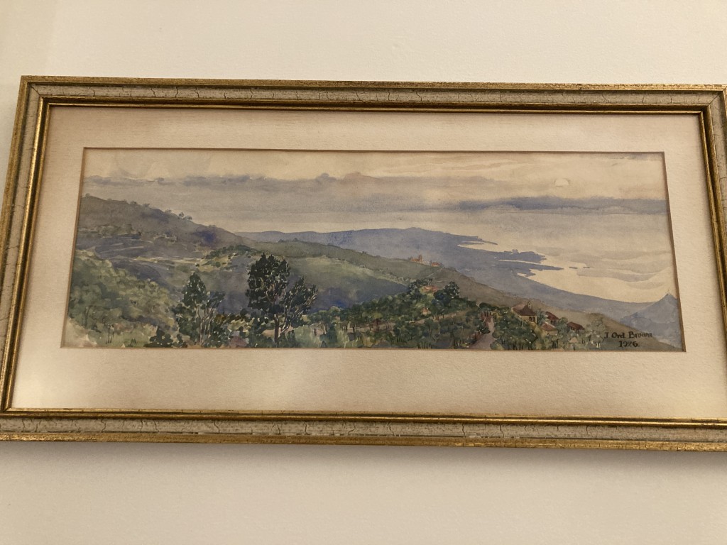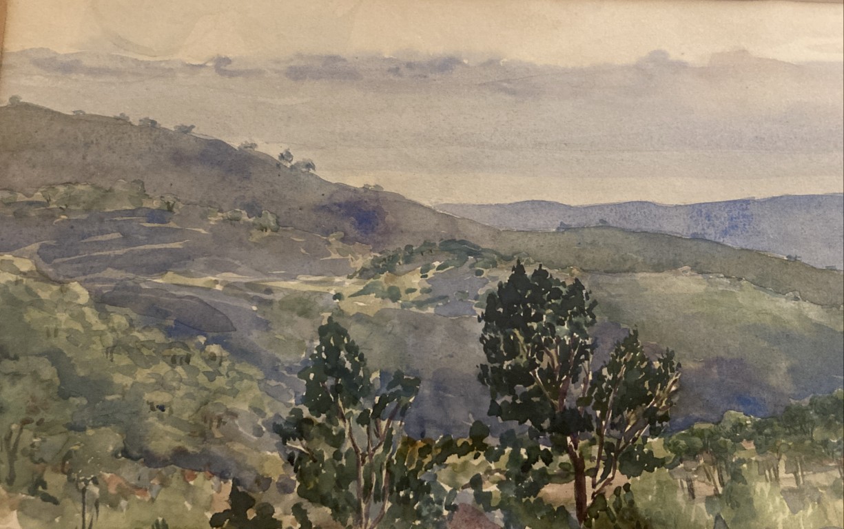 Original signed and dated 1926 watercolor, ‘View from Brummana, Lebanon Looking Southwest Over Beirut’ by Joyce Ord-Brown (1897-1974), South African. On reverse is the documentation ‘Gift of Theda Belle Phelps, 1958’. Theda Belle Phelps was an American nurse and missionary.