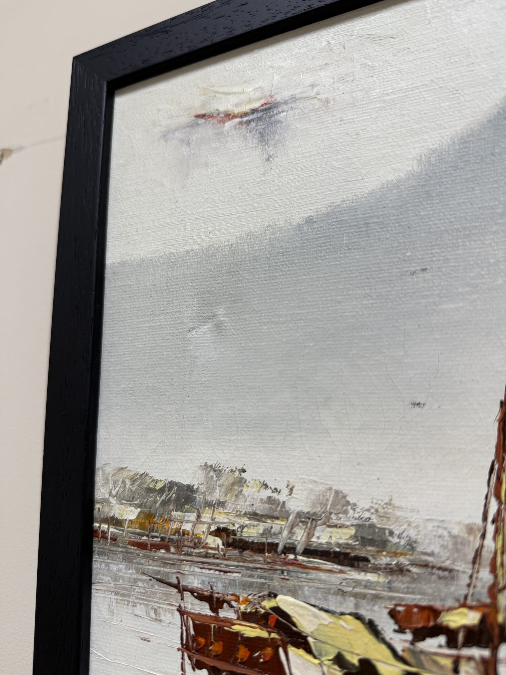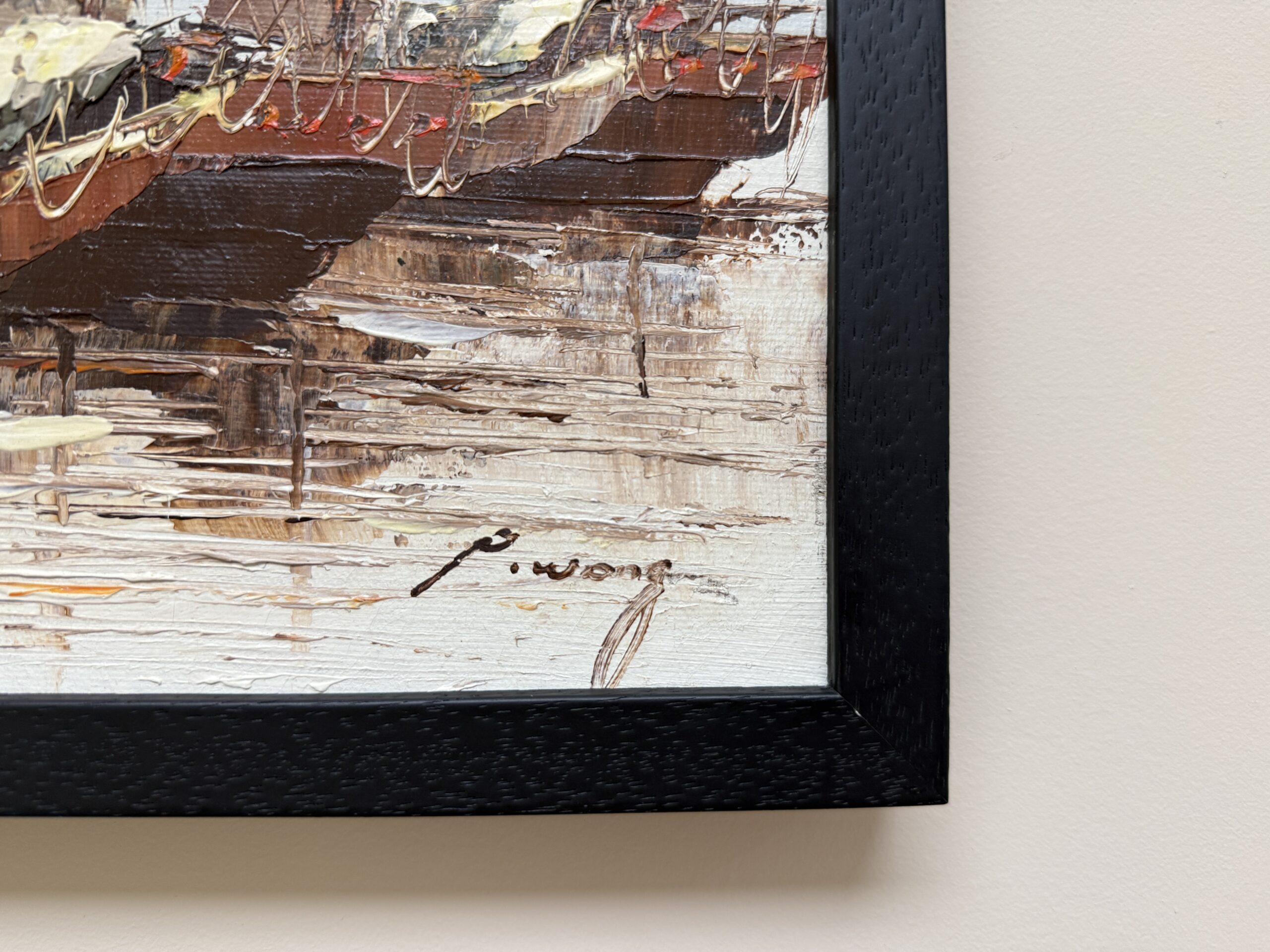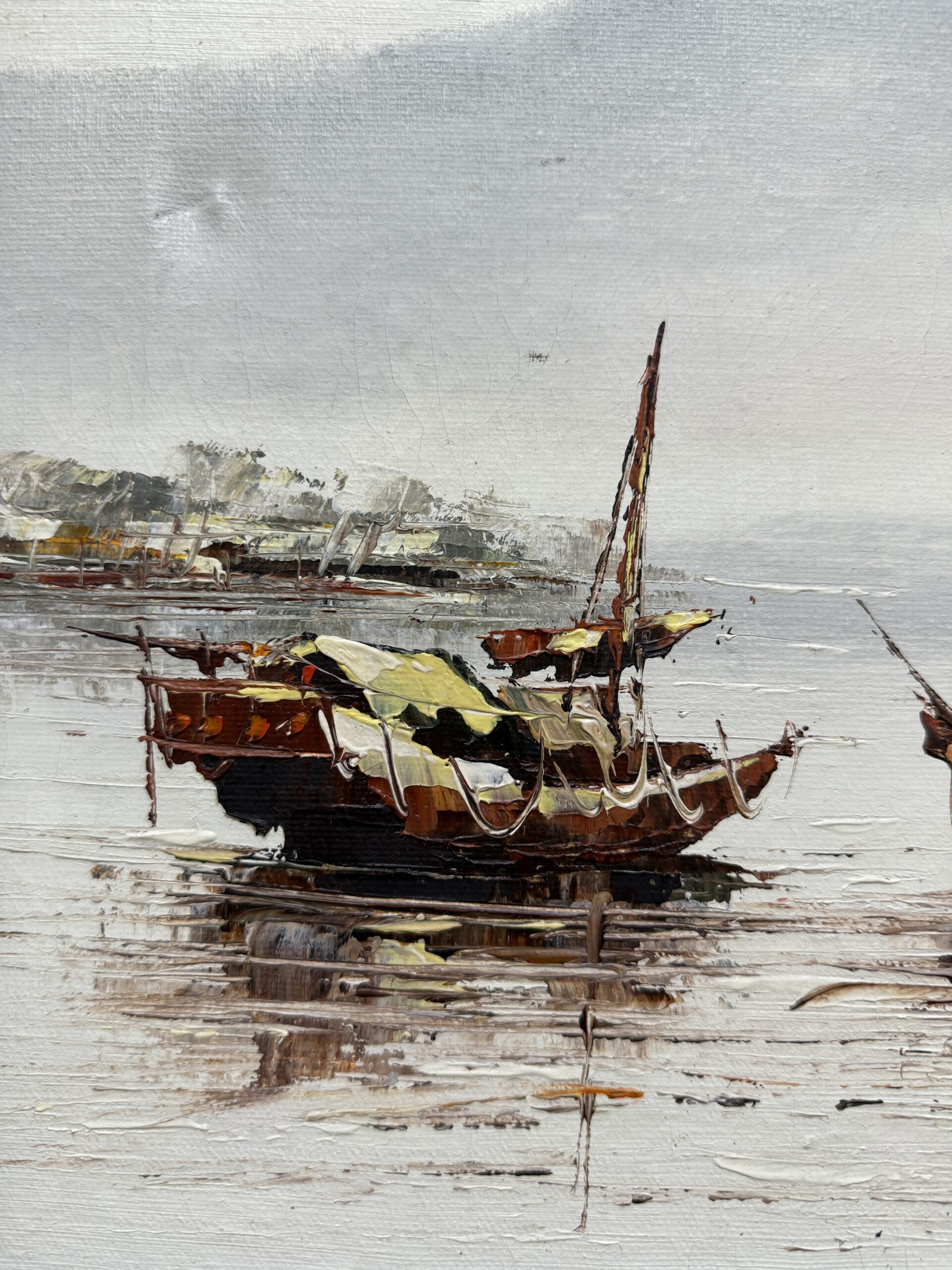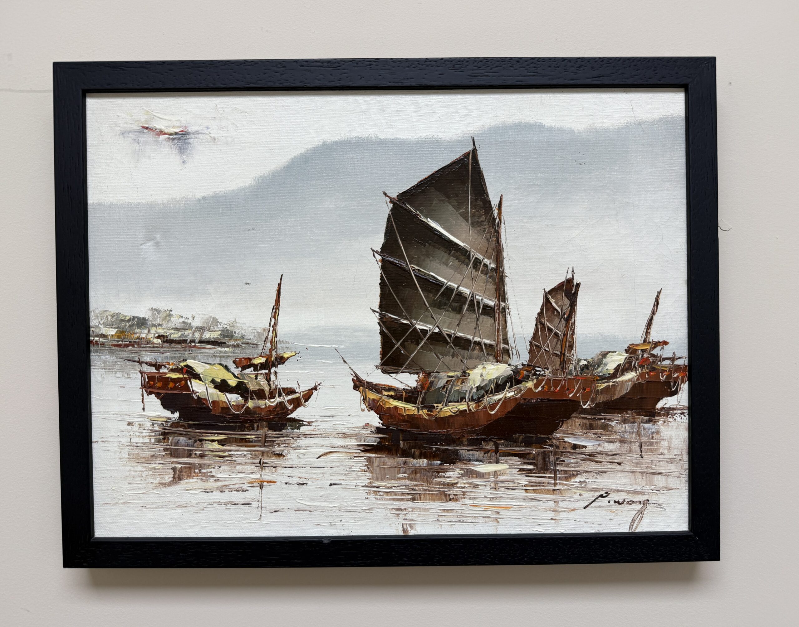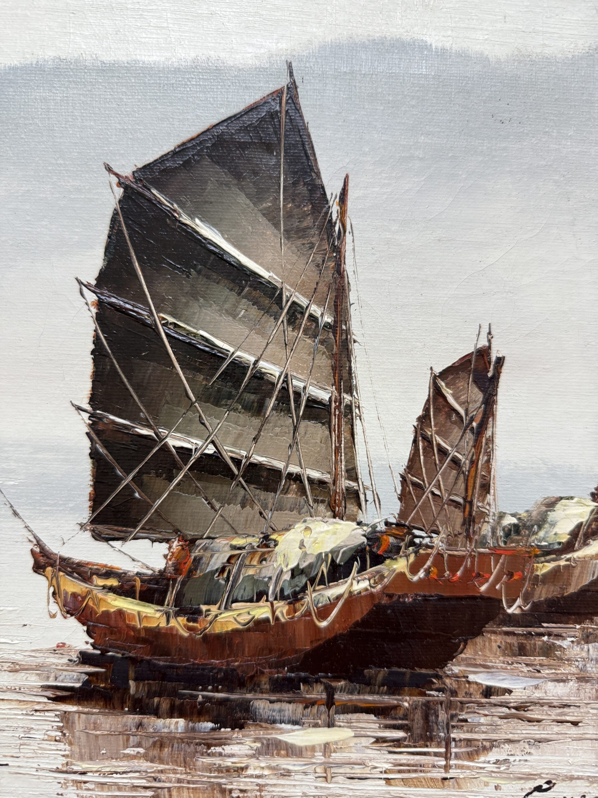 Original Textured Oil on Canvas of Ships by P. Wong