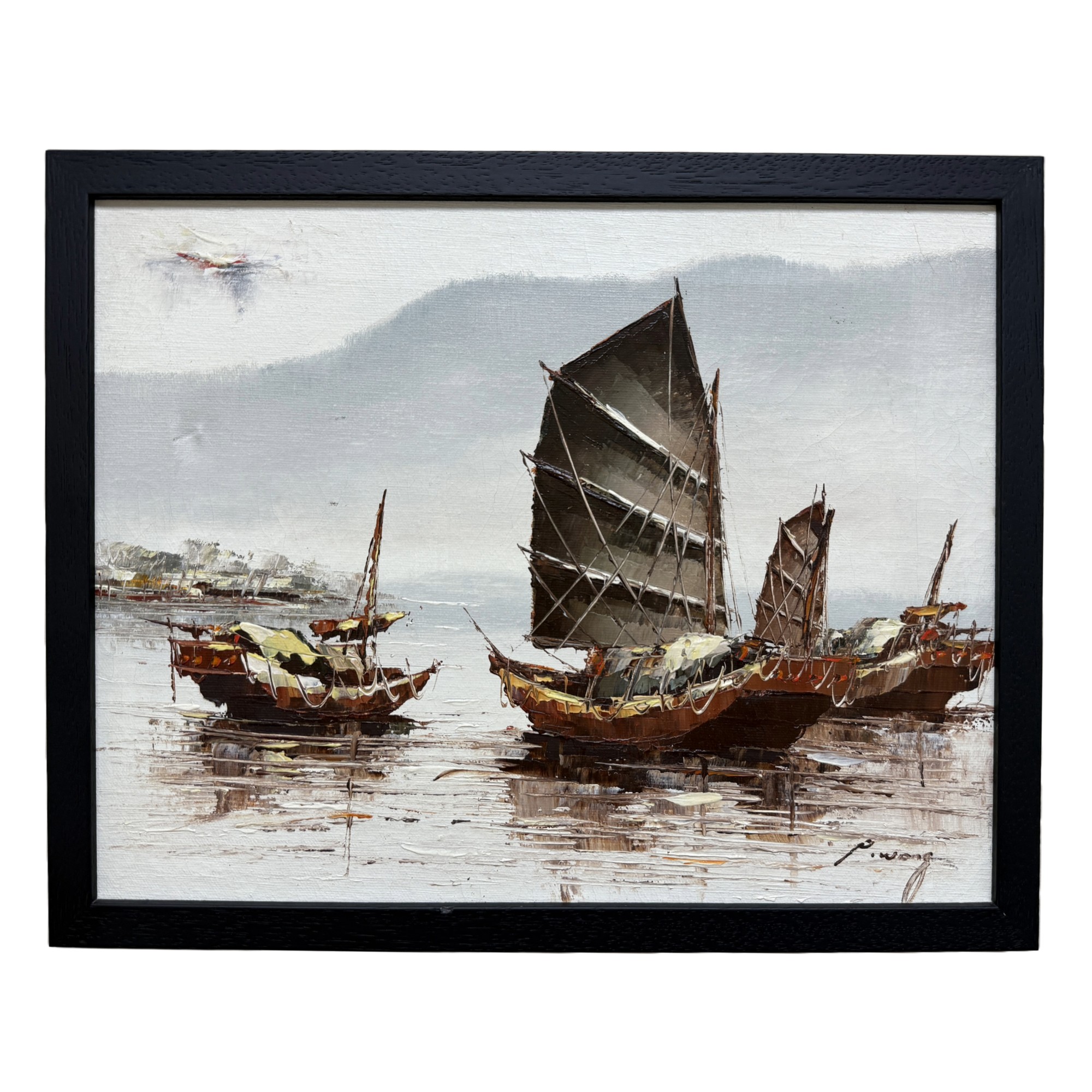 This vibrant oil on canvas by P. Wong features ships with green-toned sails set against a misty backdrop. The textured surface and warm colors bring a lively dimension to the nautical composition.