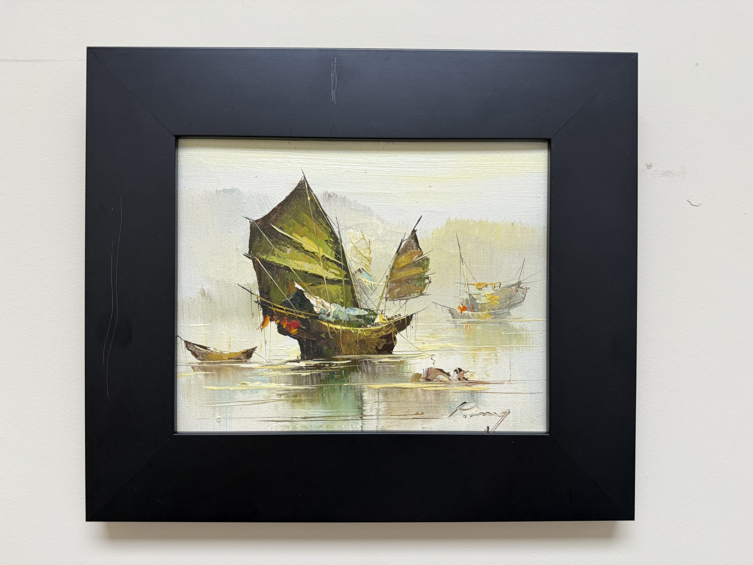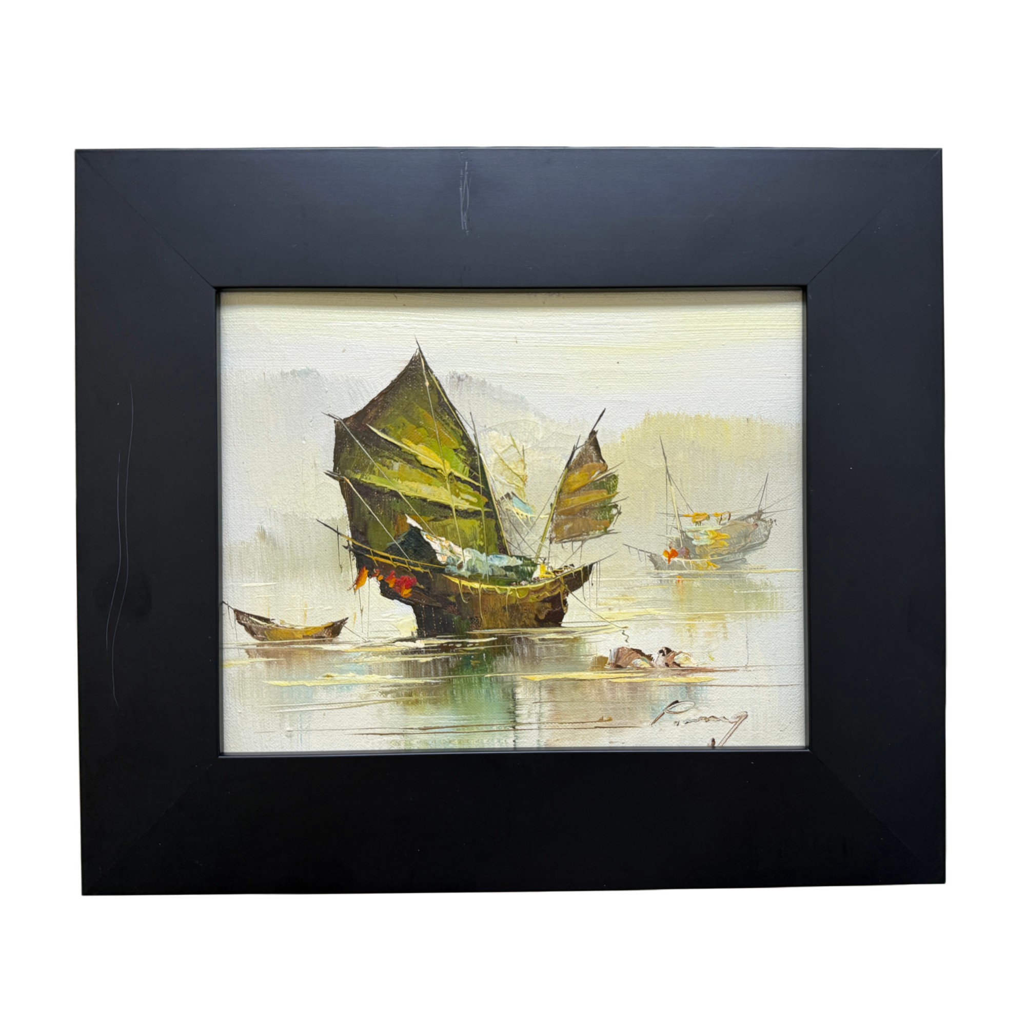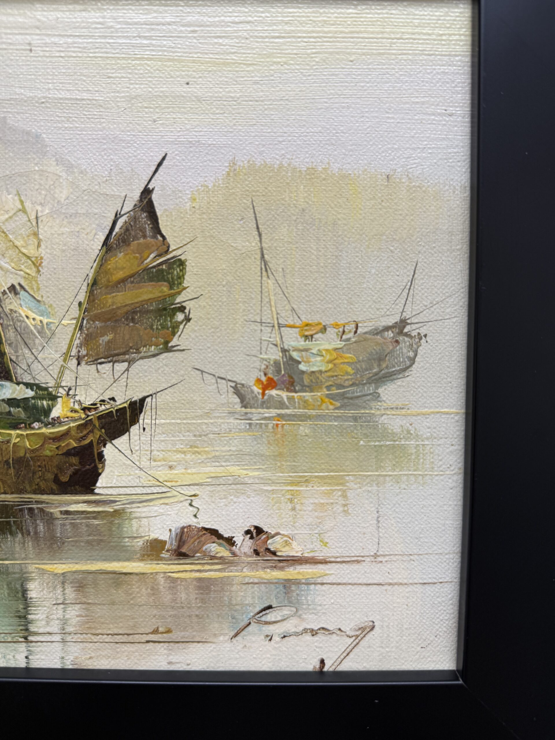 An original framed oil on canvas by P. Wong showcasing detailed ships at sea. The artwork has visible condition wear but still captures the artist’s characteristic textured maritime style.