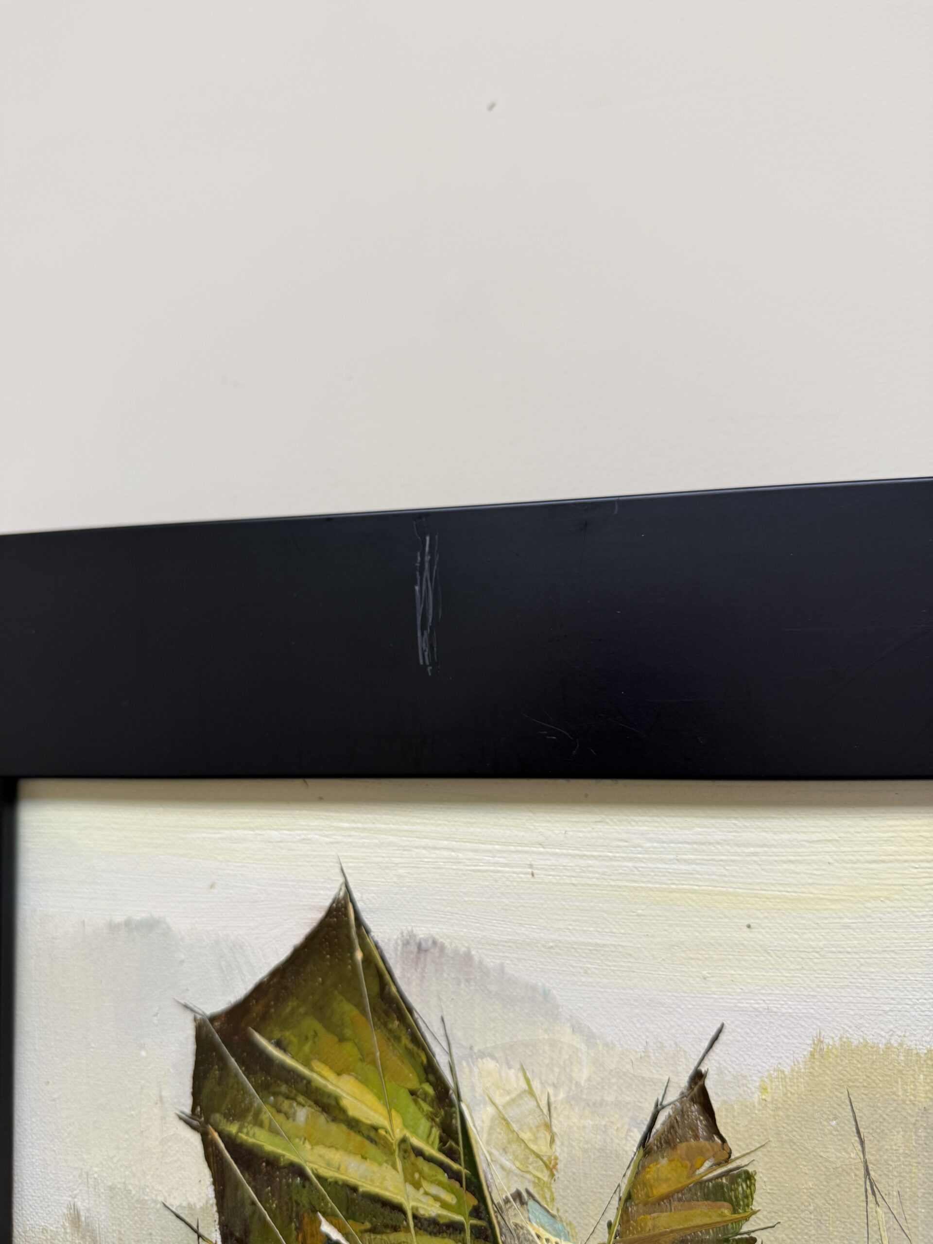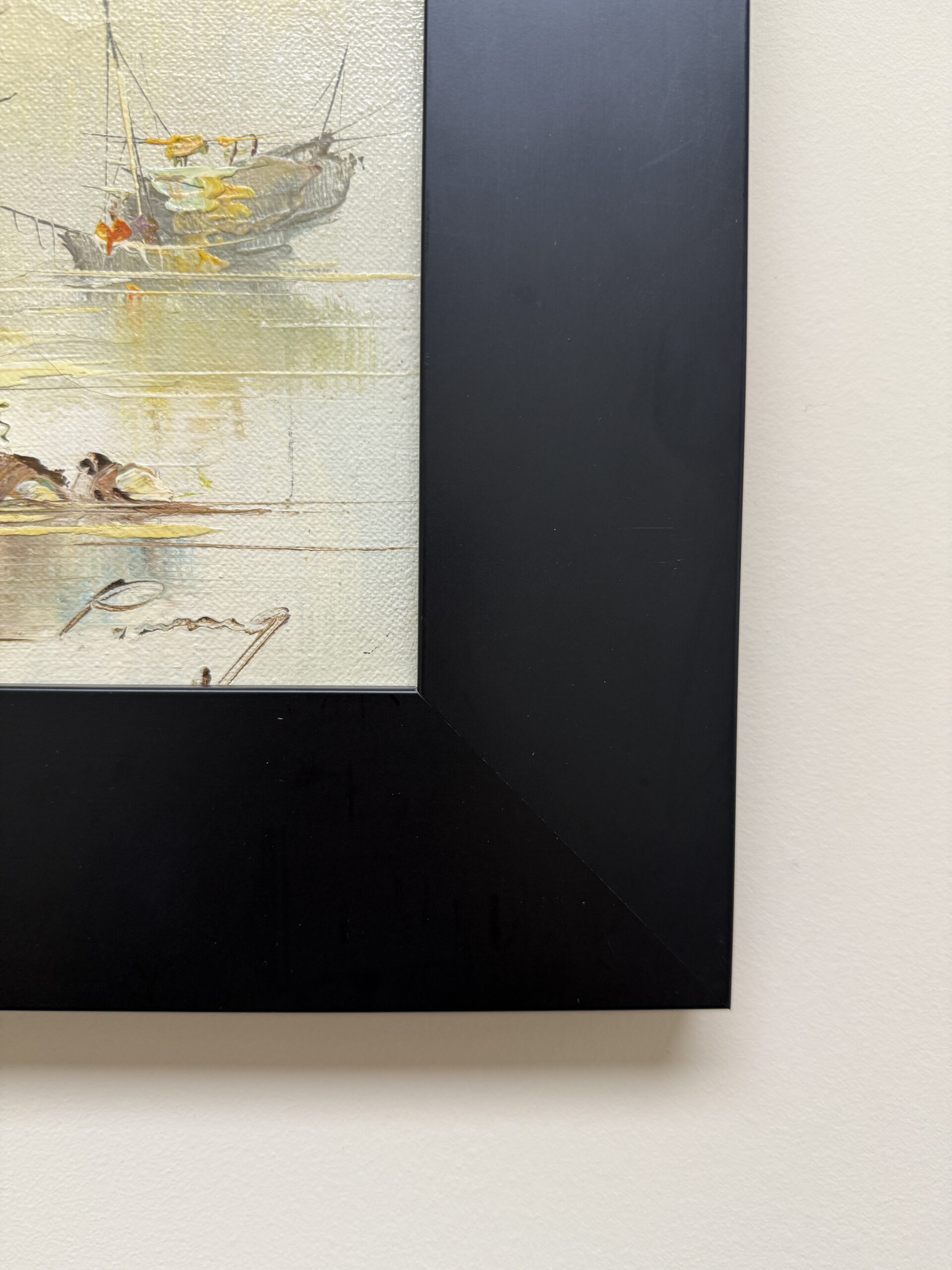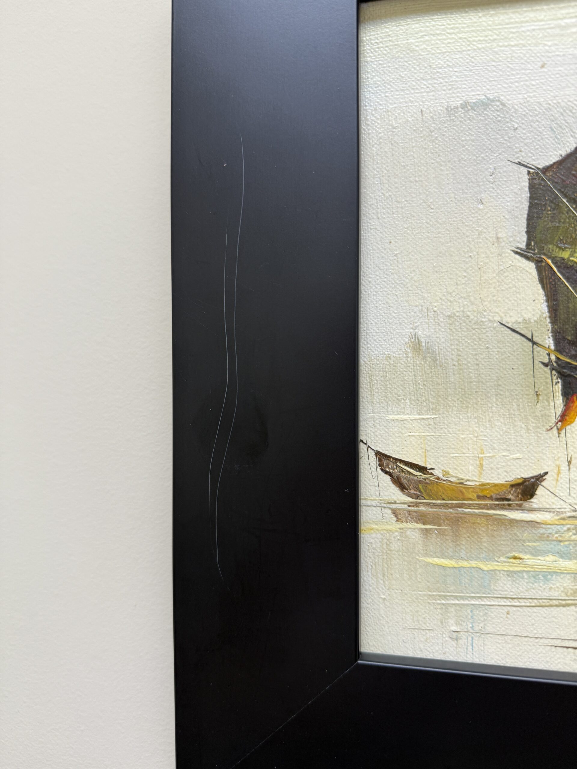 An original framed oil on canvas by P. Wong showcasing detailed ships at sea. The artwork has visible condition wear but still captures the artist’s characteristic textured maritime style.
