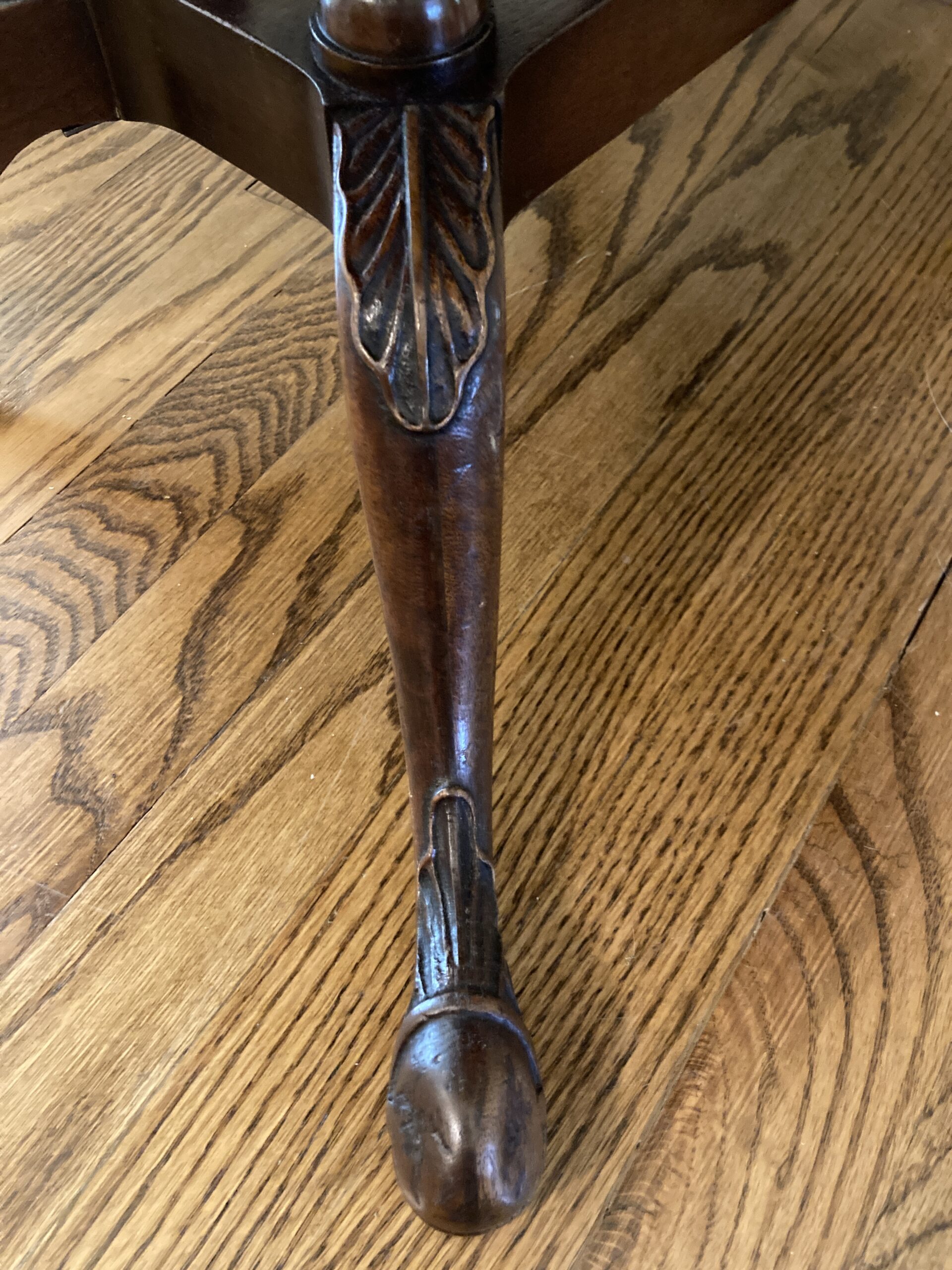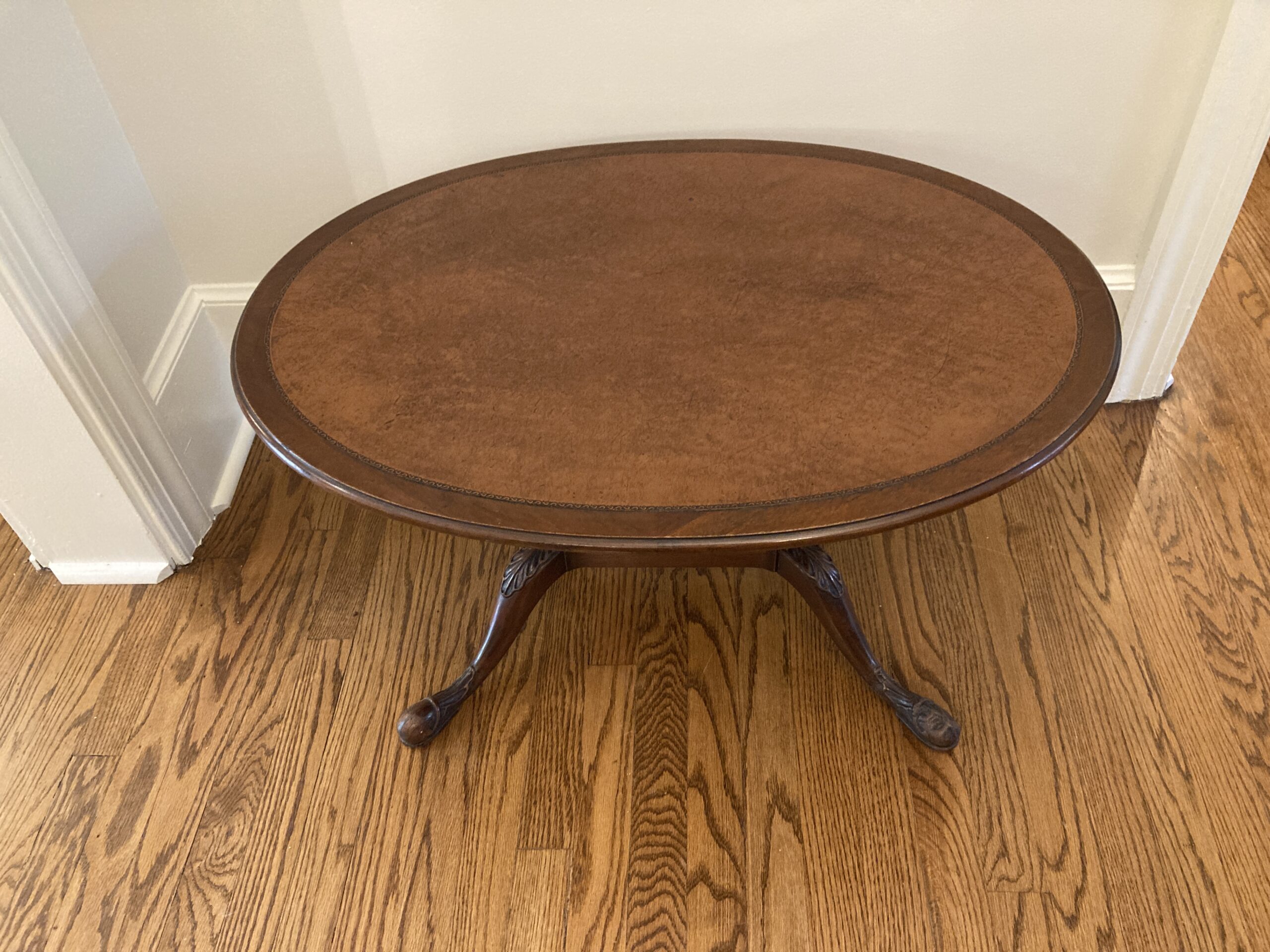 Oval mahogany coffee/tea table with tooled leather top and carved legs. Smaller size on this nice little table that will add character to your living space!  Tooled leather top is in excellent condition with a few very small blemishes as pictured.