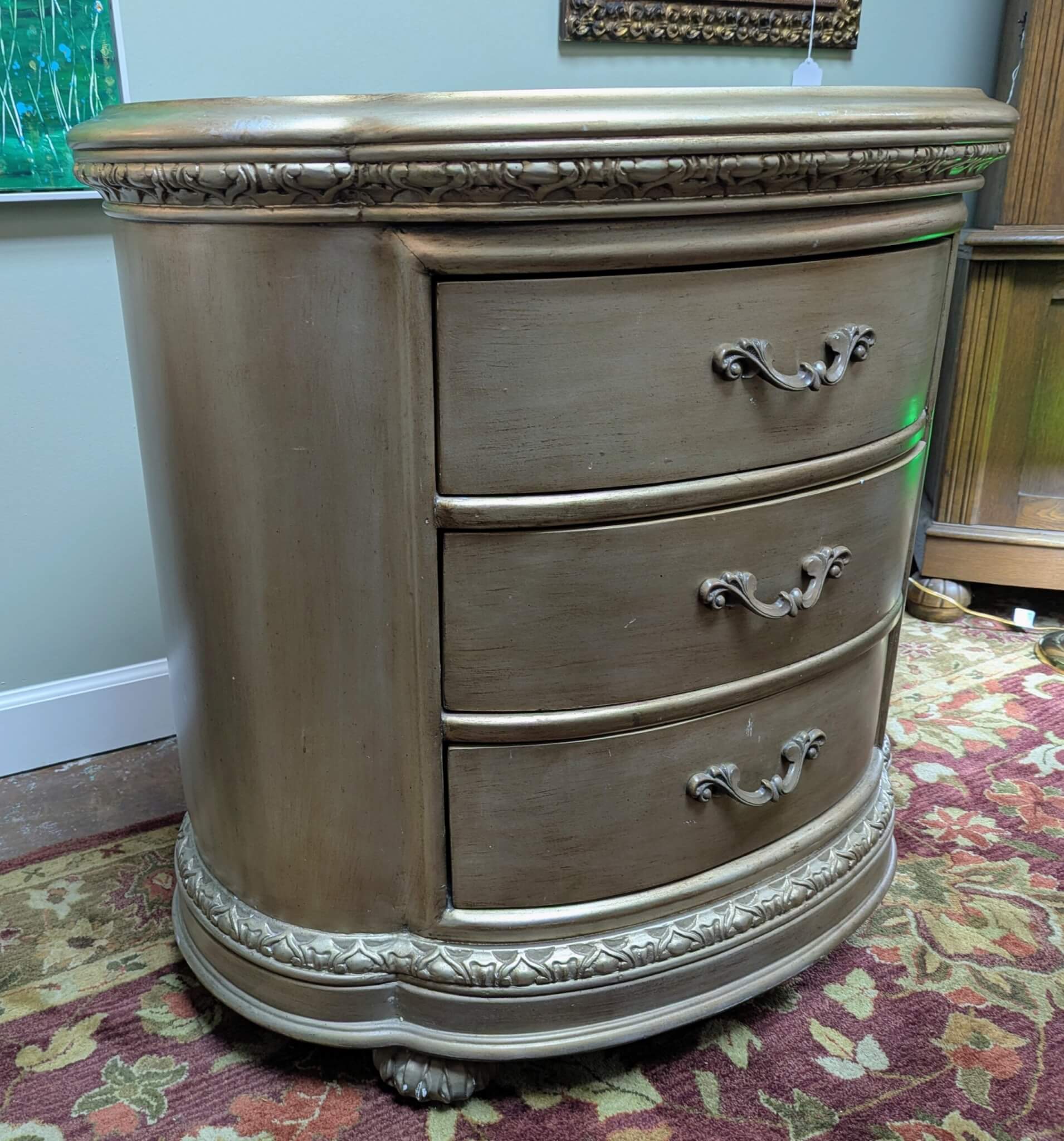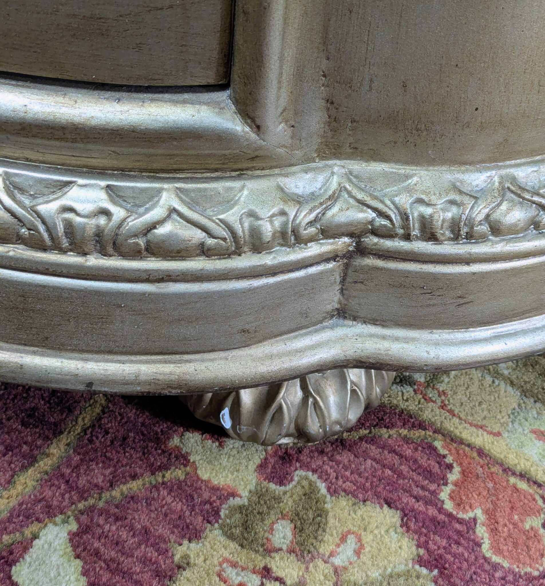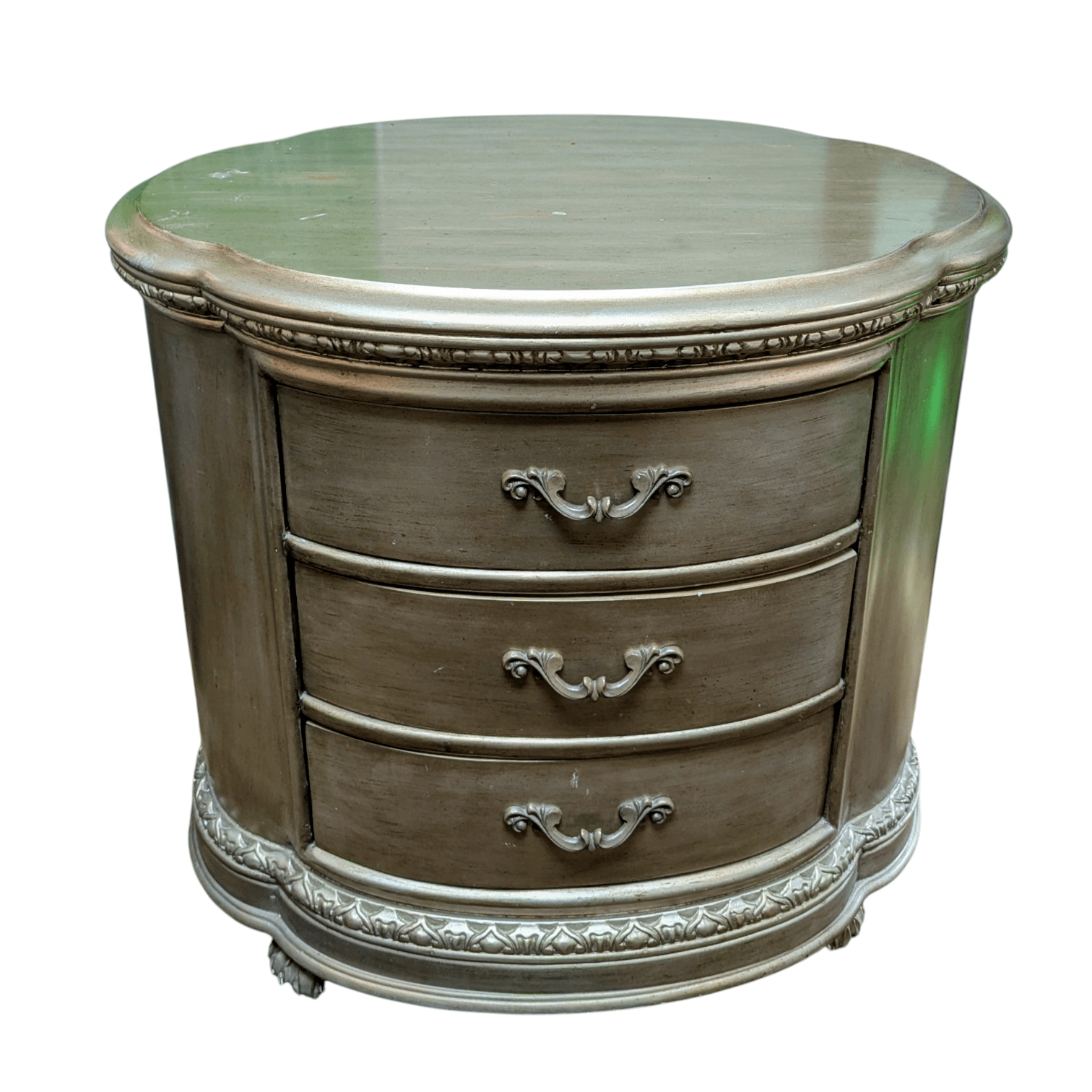 Distressed Silver toned low chest or nightstand. The chest features three drawers with Louis XV style handles and classic wood carvings and details all resting on squash ball feet.