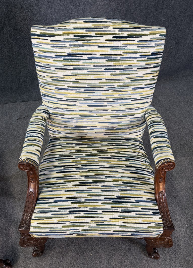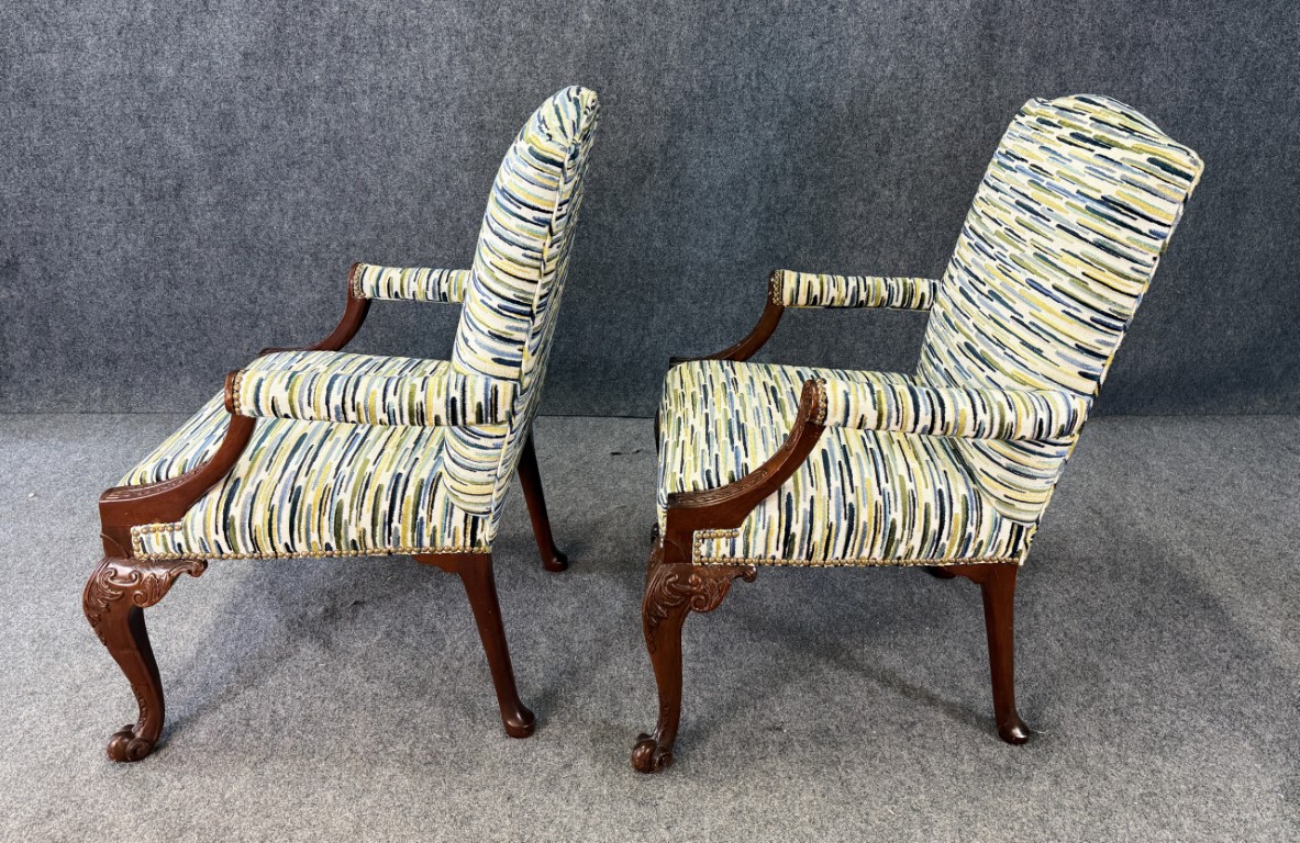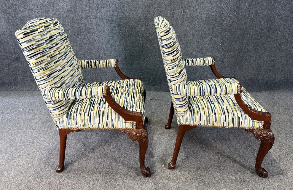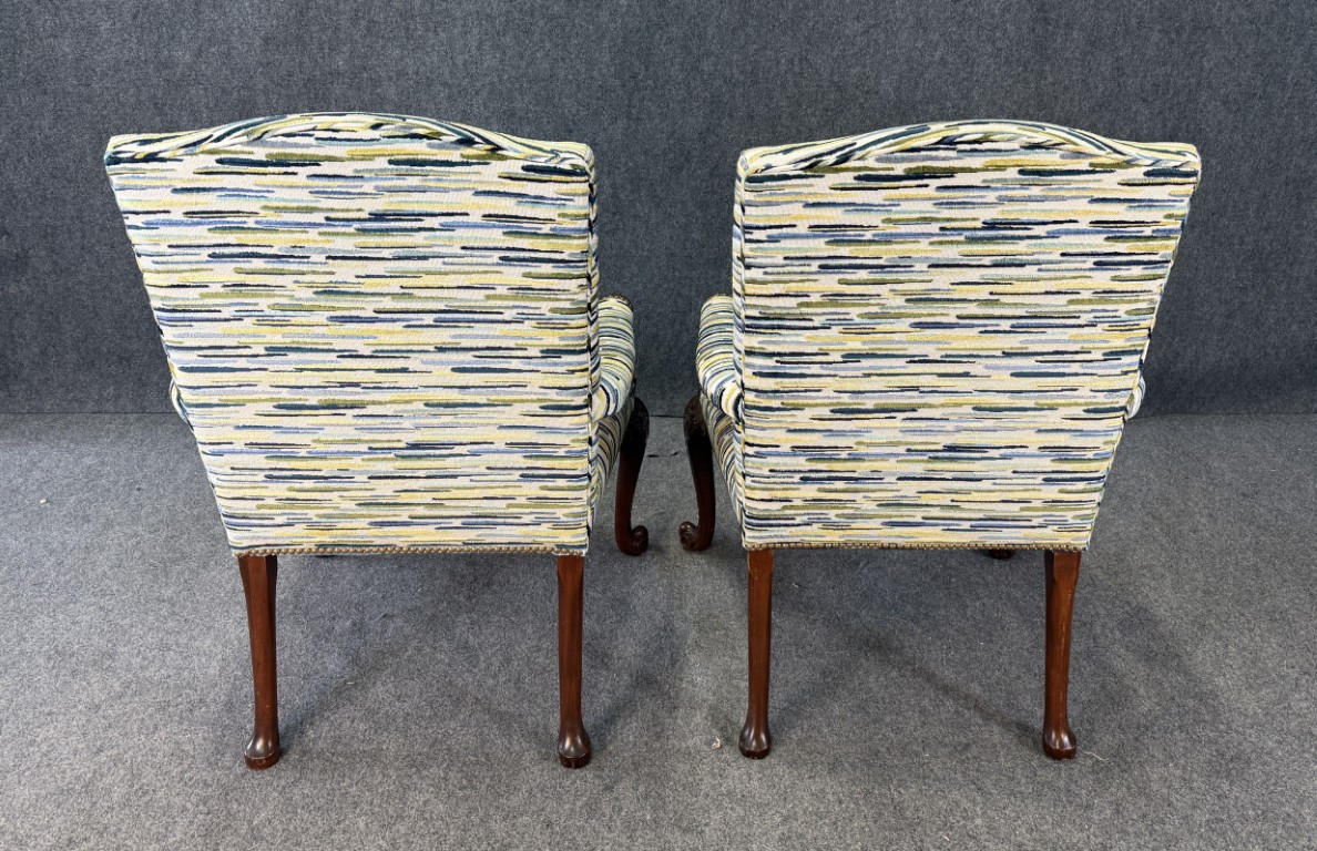 Pair of Baker Furniture Stately Homes Gainsborough Arm Chairs in Green & Blue