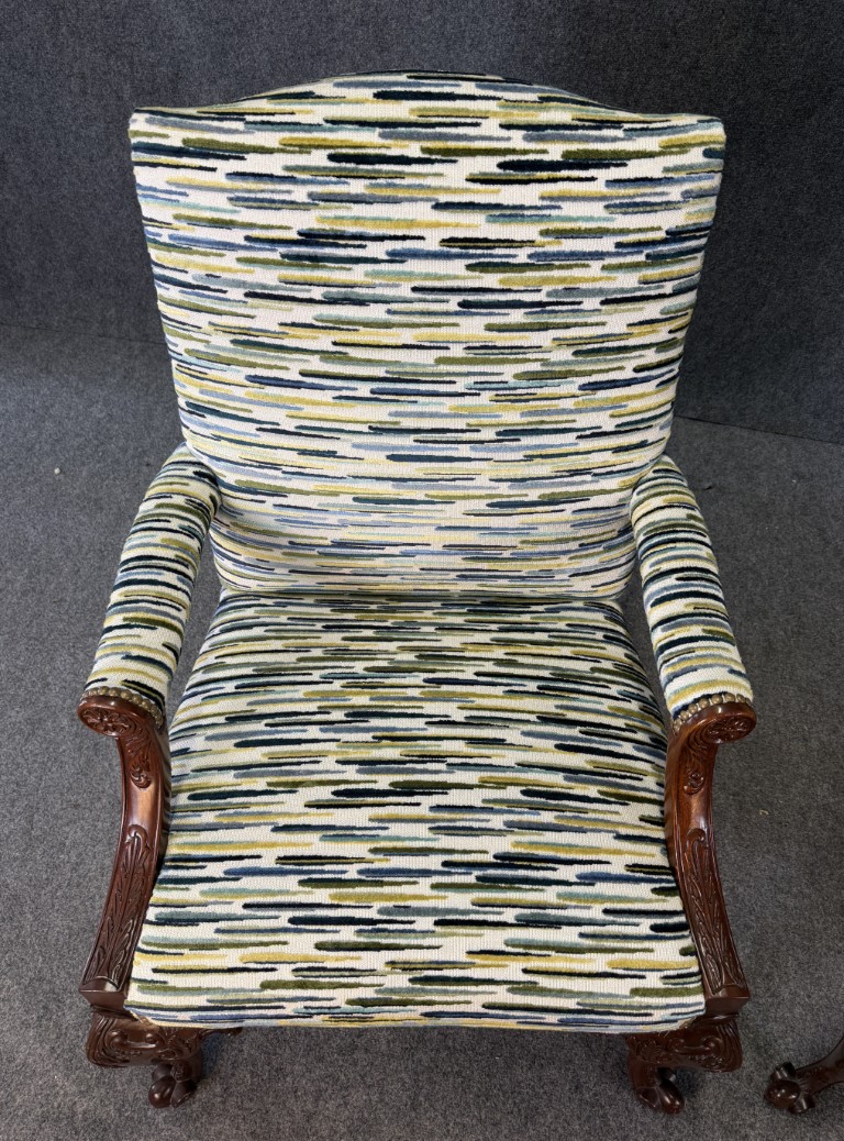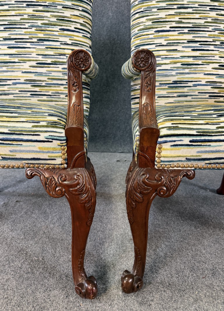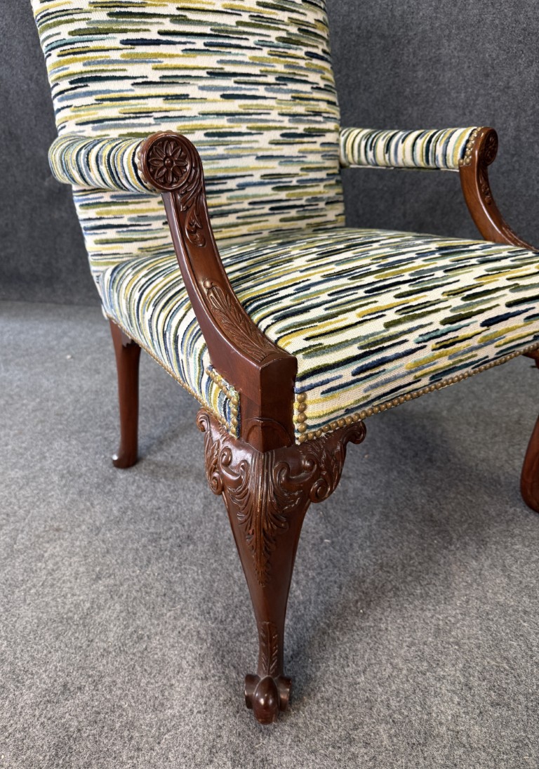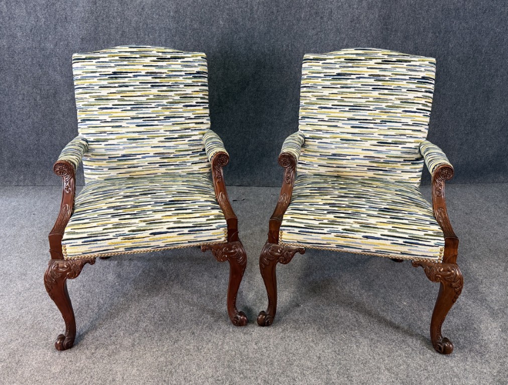 Pair of Baker Furniture Stately Homes Gainsborough Arm Chairs in Green & Blue