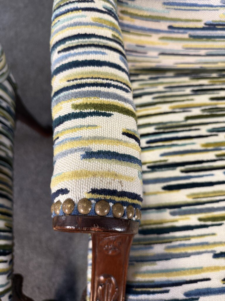 Your happiness with this item is of the utmost importance to us so please review the photographs carefully for condition. We endeavor to try and list any issues we may observe; we may not necessarily note all minor nicks and dings or we may simply miss something. Please inspect carefully to ensure your full happiness with this item. For this particular piece we found minor wear consistent with age and prior use, including minor spotting on one arm. Please note that neither chair retains their original Baker labels, but this pair came in with an identical pair in its original upholstery with a label attached.