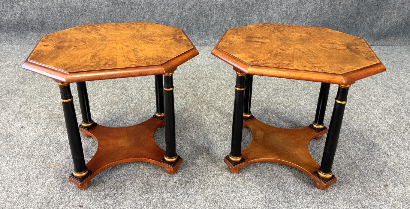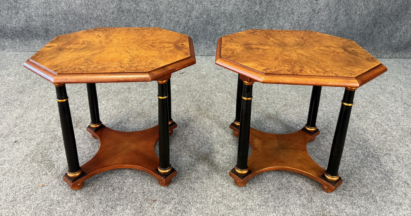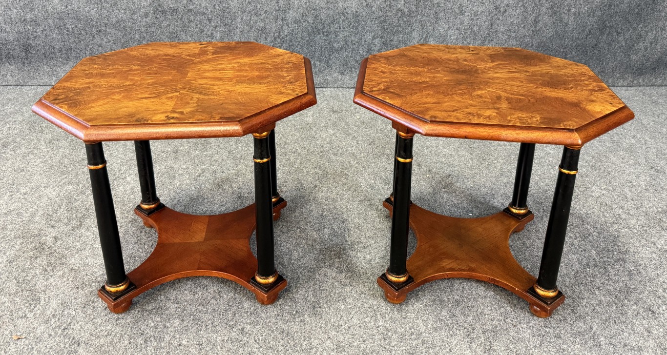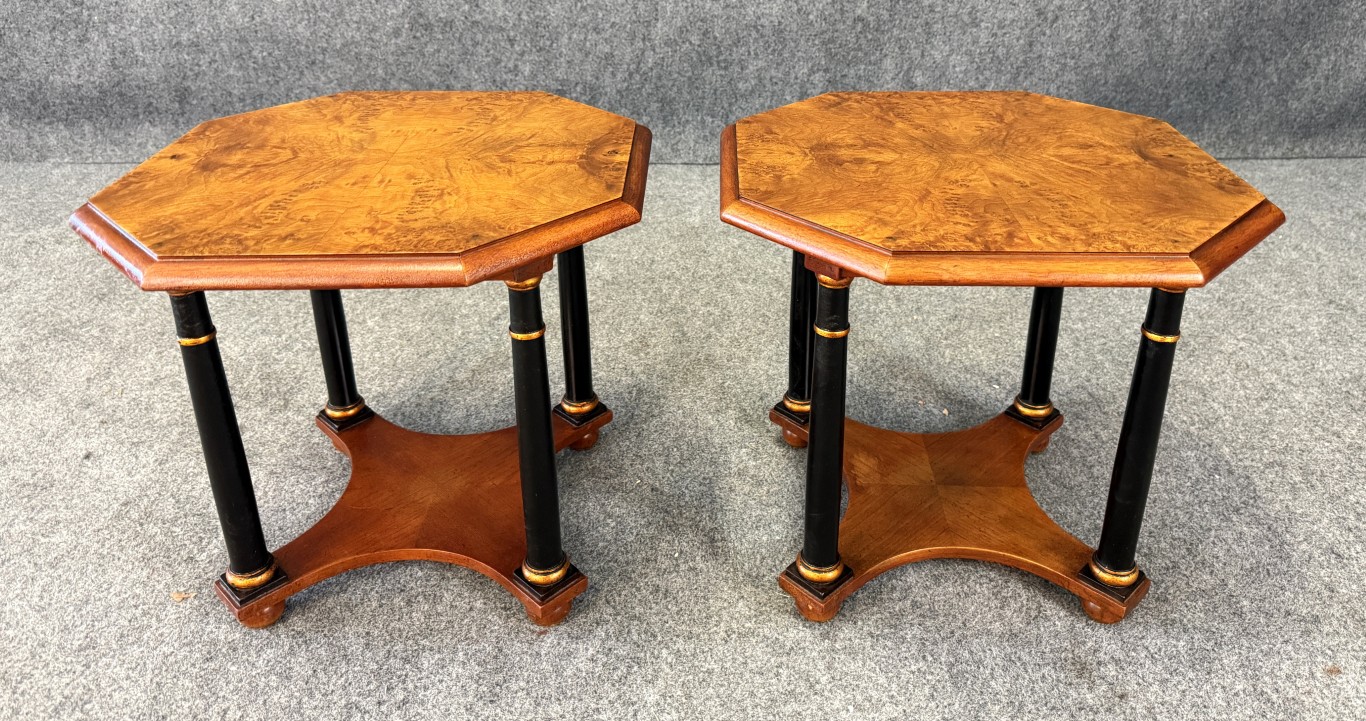 This pair of Baker Neoclassical octagonal side tables is crafted from richly figured burl walnut, showcasing elegant symmetry across their eight-sided tops. Each table is supported by ebonized columnar legs with gilt ring accents, joined by a shaped lower shelf for added stability and style. The refined mix of warm burl wood and contrasting dark supports makes them versatile pieces ideal for both traditional and transitional interiors.
