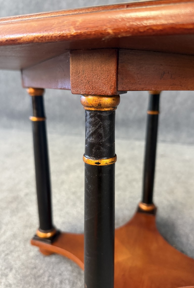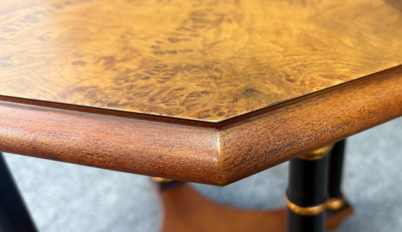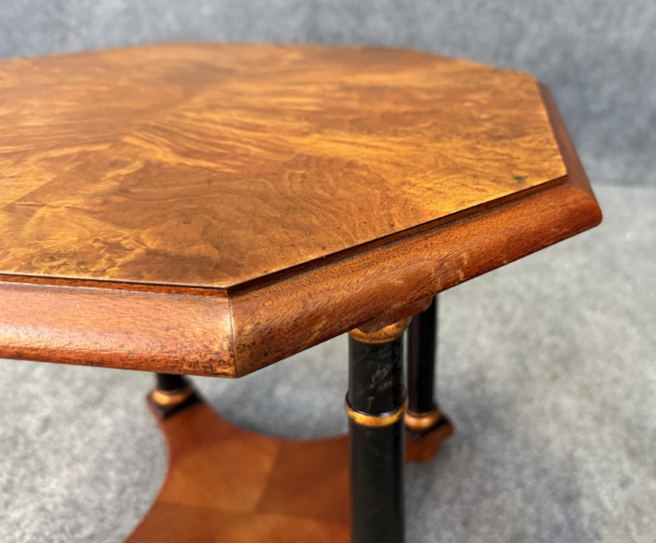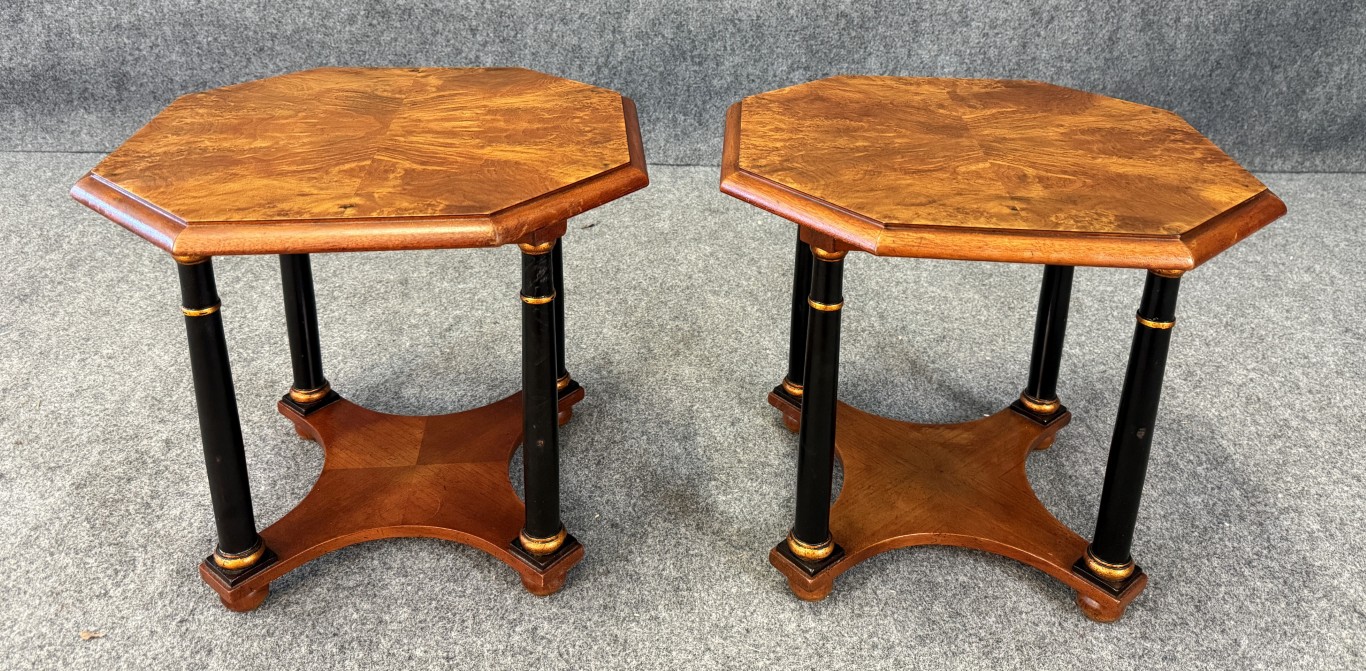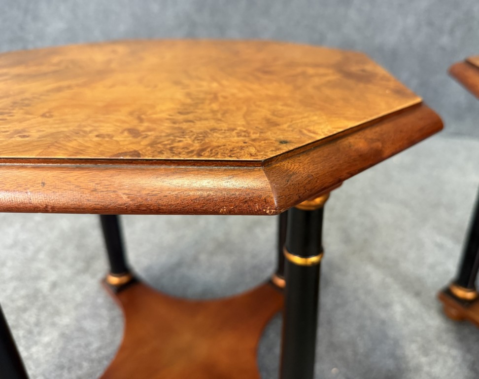This pair of Baker Neoclassical octagonal side tables is crafted from richly figured burl walnut, showcasing elegant symmetry across their eight-sided tops. Each table is supported by ebonized columnar legs with gilt ring accents, joined by a shaped lower shelf for added stability and style. The refined mix of warm burl wood and contrasting dark supports makes them versatile pieces ideal for both traditional and transitional interiors.