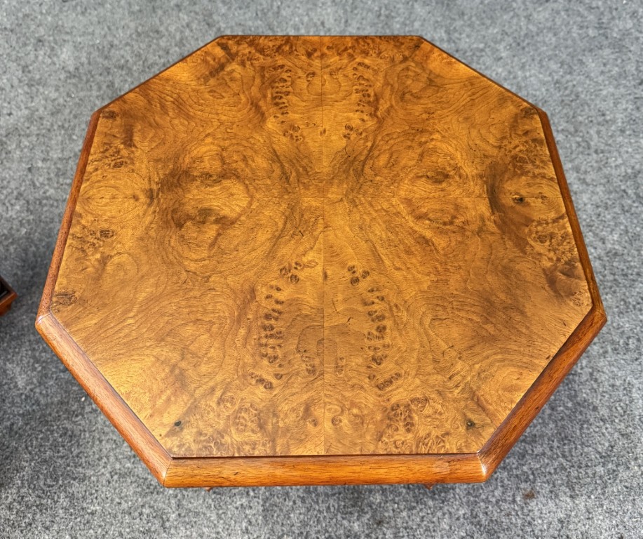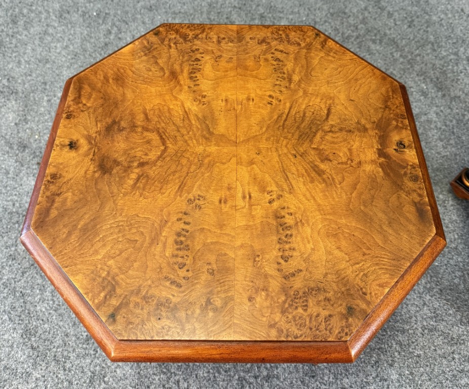 Pair of Baker Neoclassical Burl Walnut Octagonal Side Tables