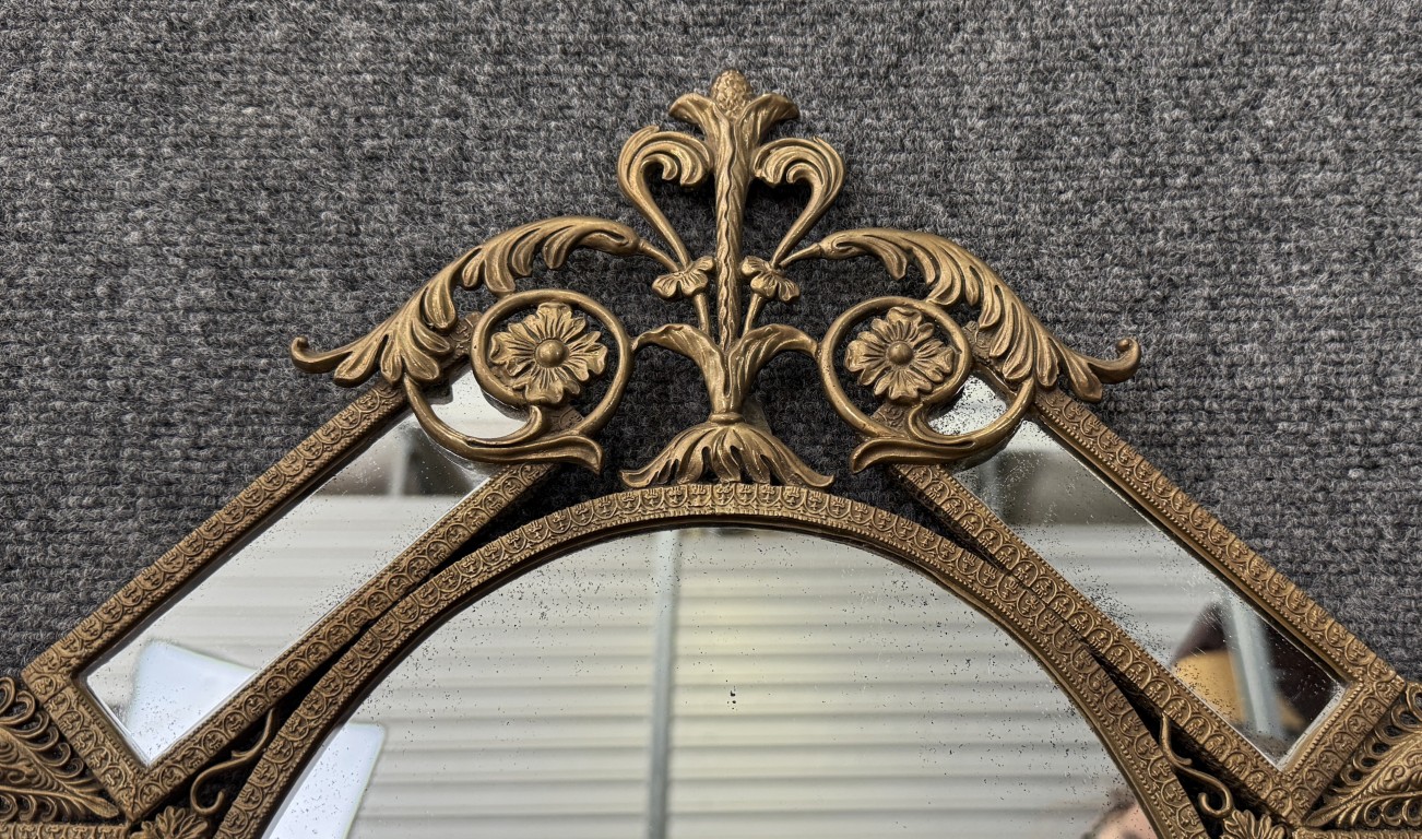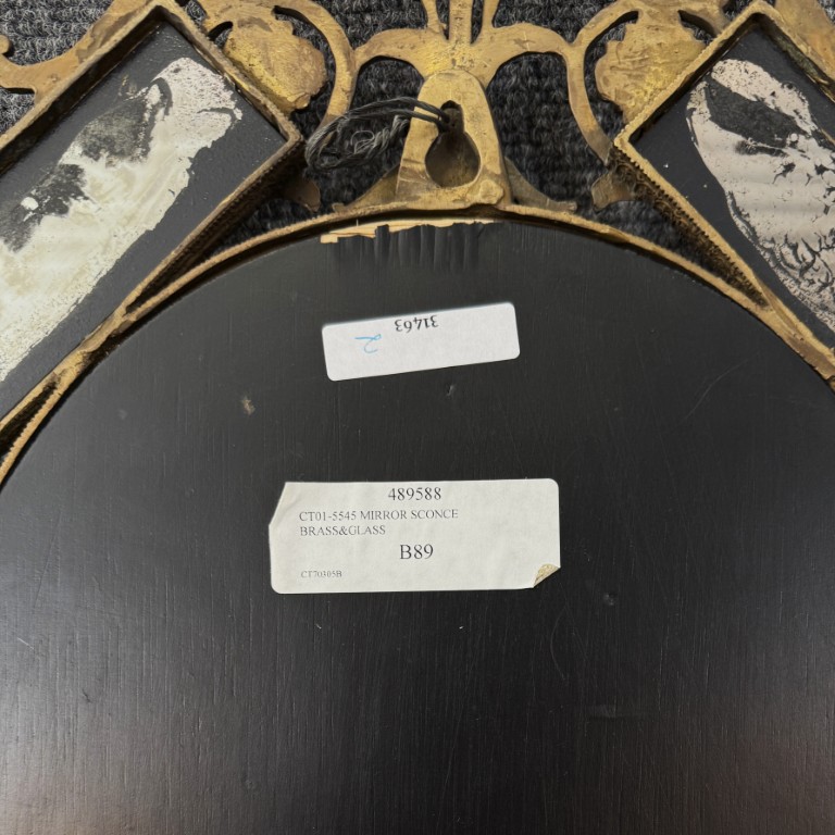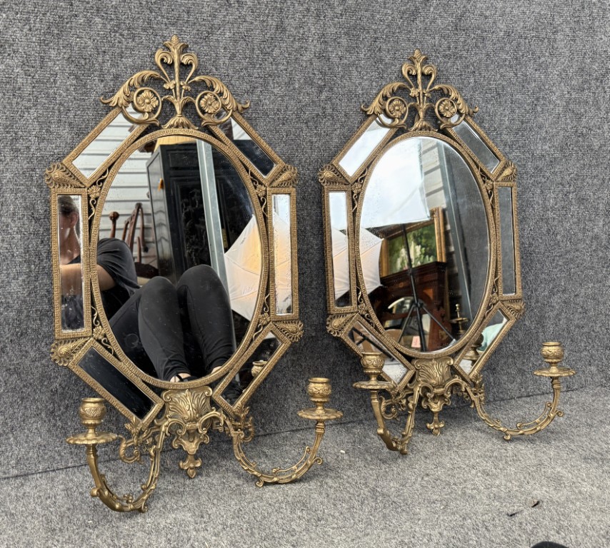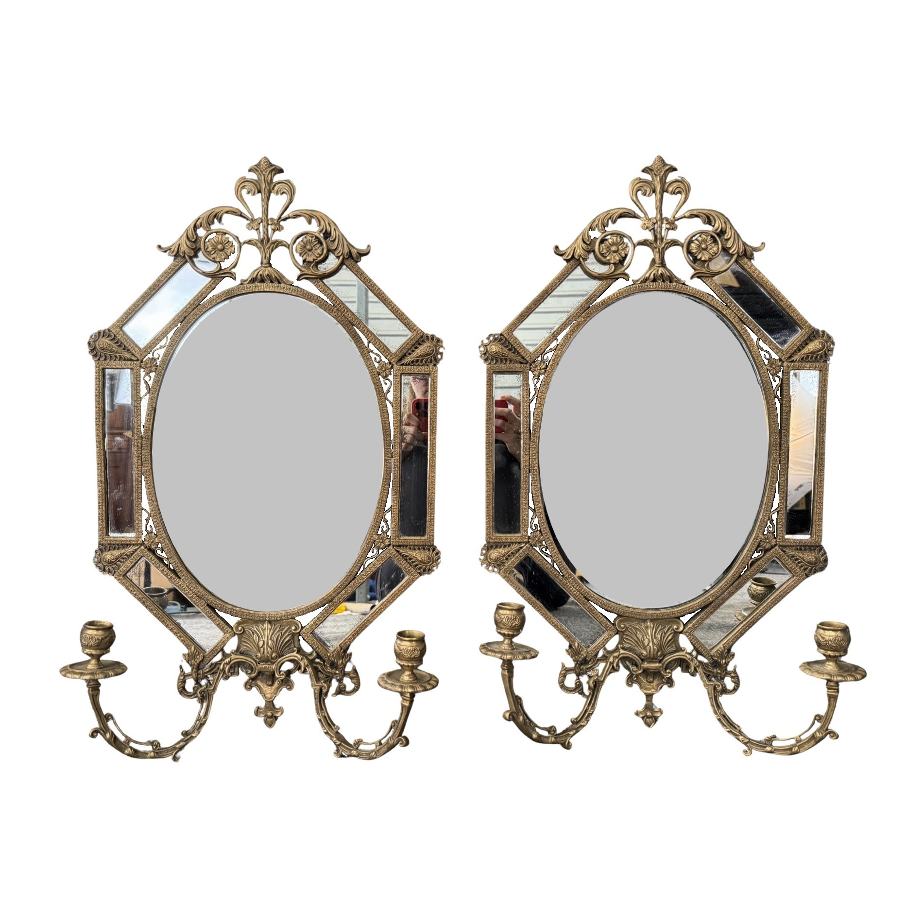 This elegant pair of Brass Renaissance Style Girandole Mirrors features ornate oval centers surrounded by mirrored panels and intricate scrollwork. Each is adorned with dual candleholders, blending function and artistry in classic European fashion. Their warm brass finish and timeless design make them ideal for adding symmetry and Old World charm to a hallway, dining room, or mantel display.