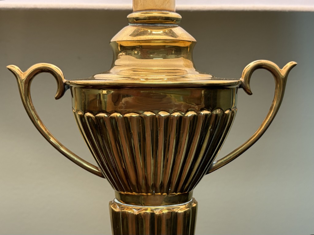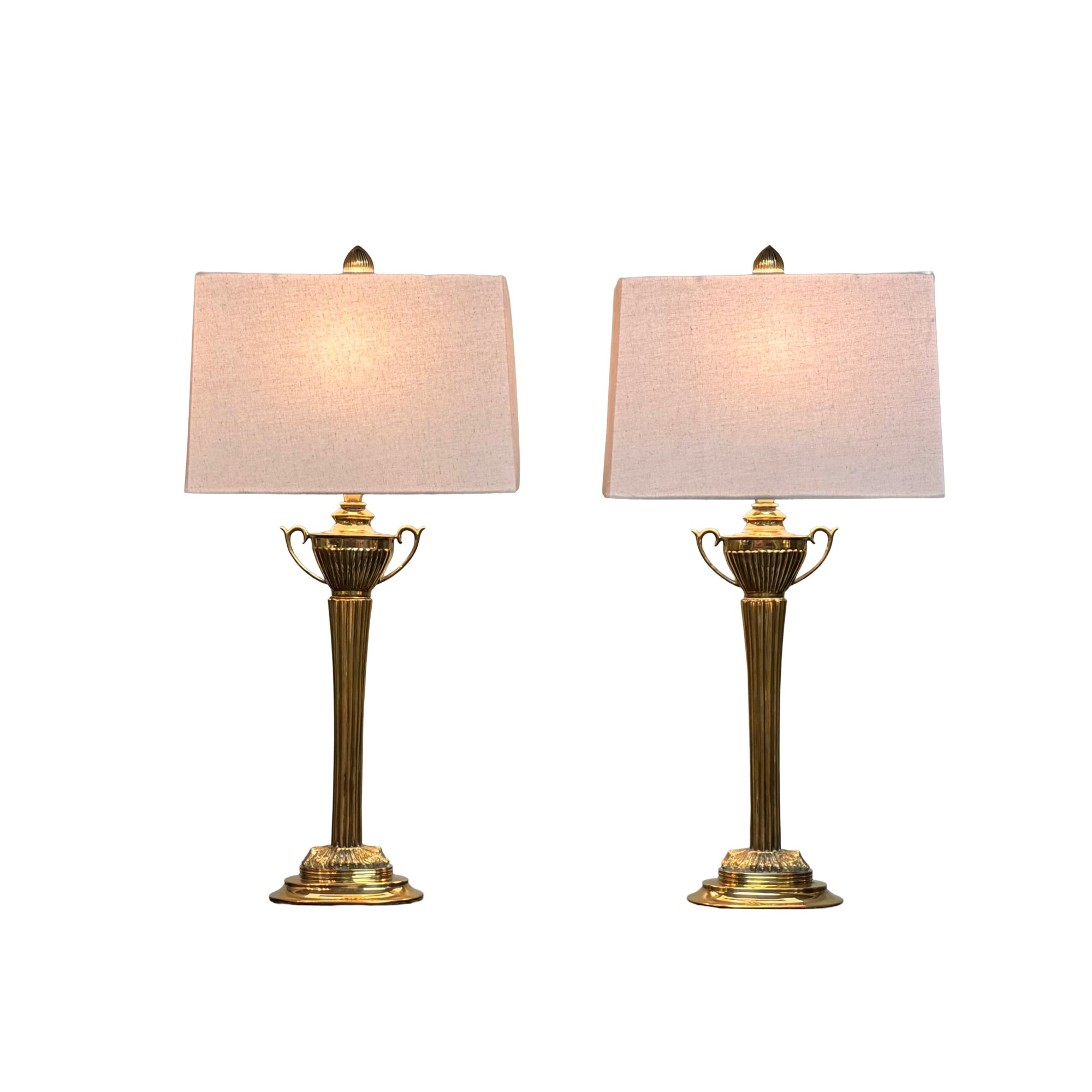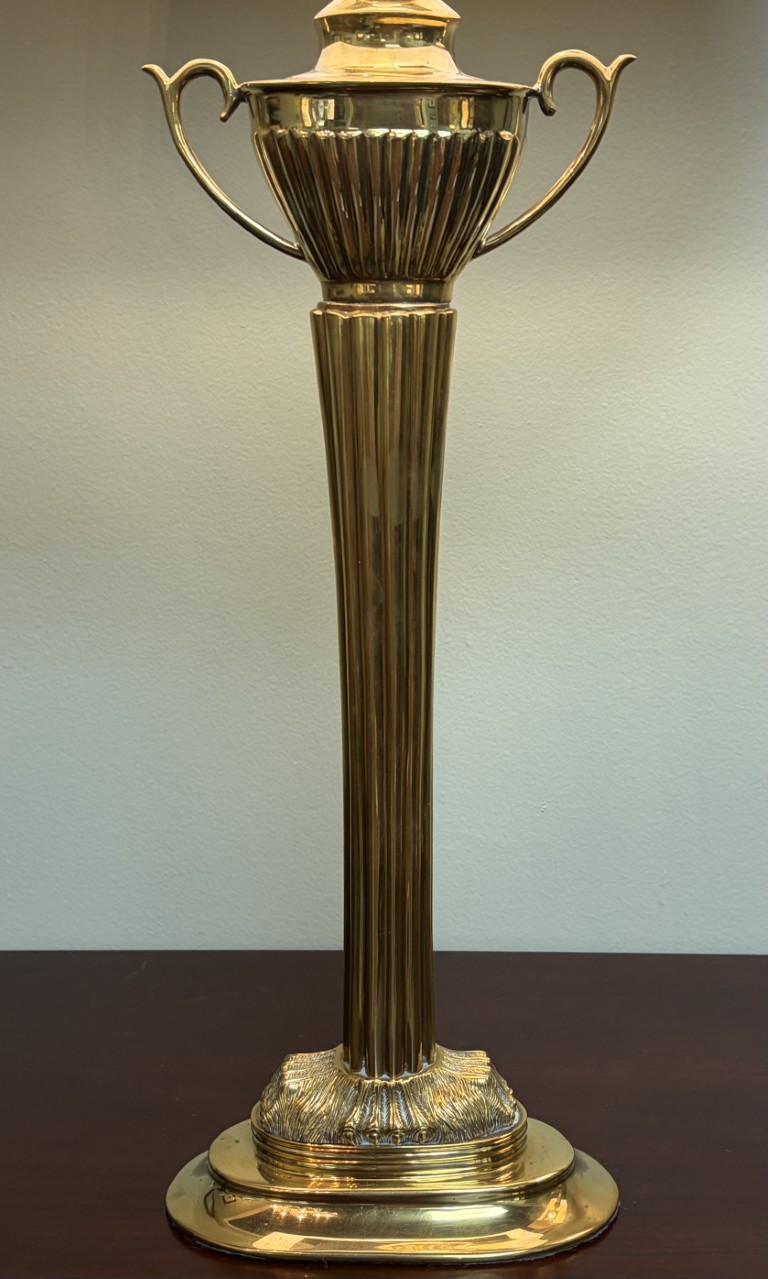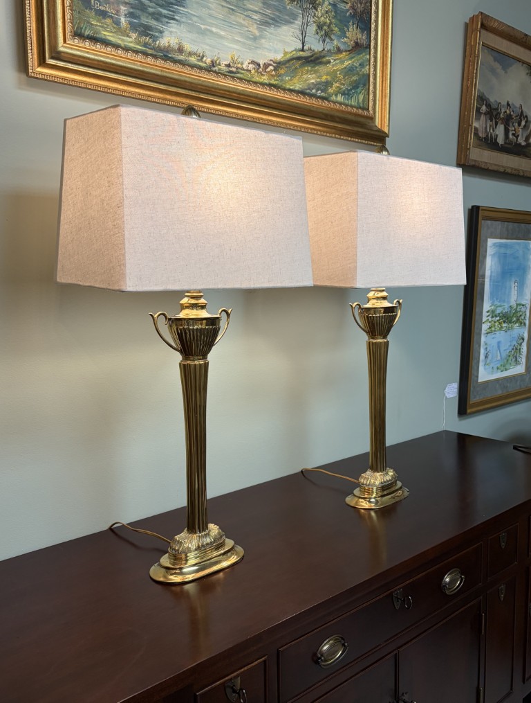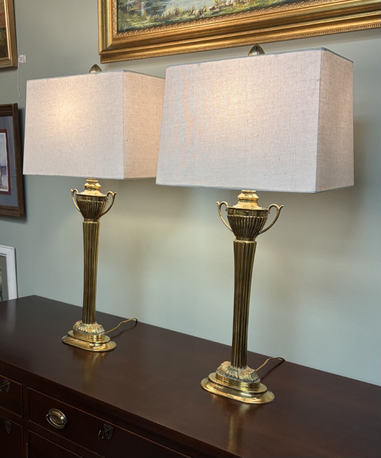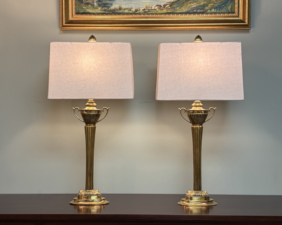 Pair of Brass Trophy Shaped Lamps with New Shades