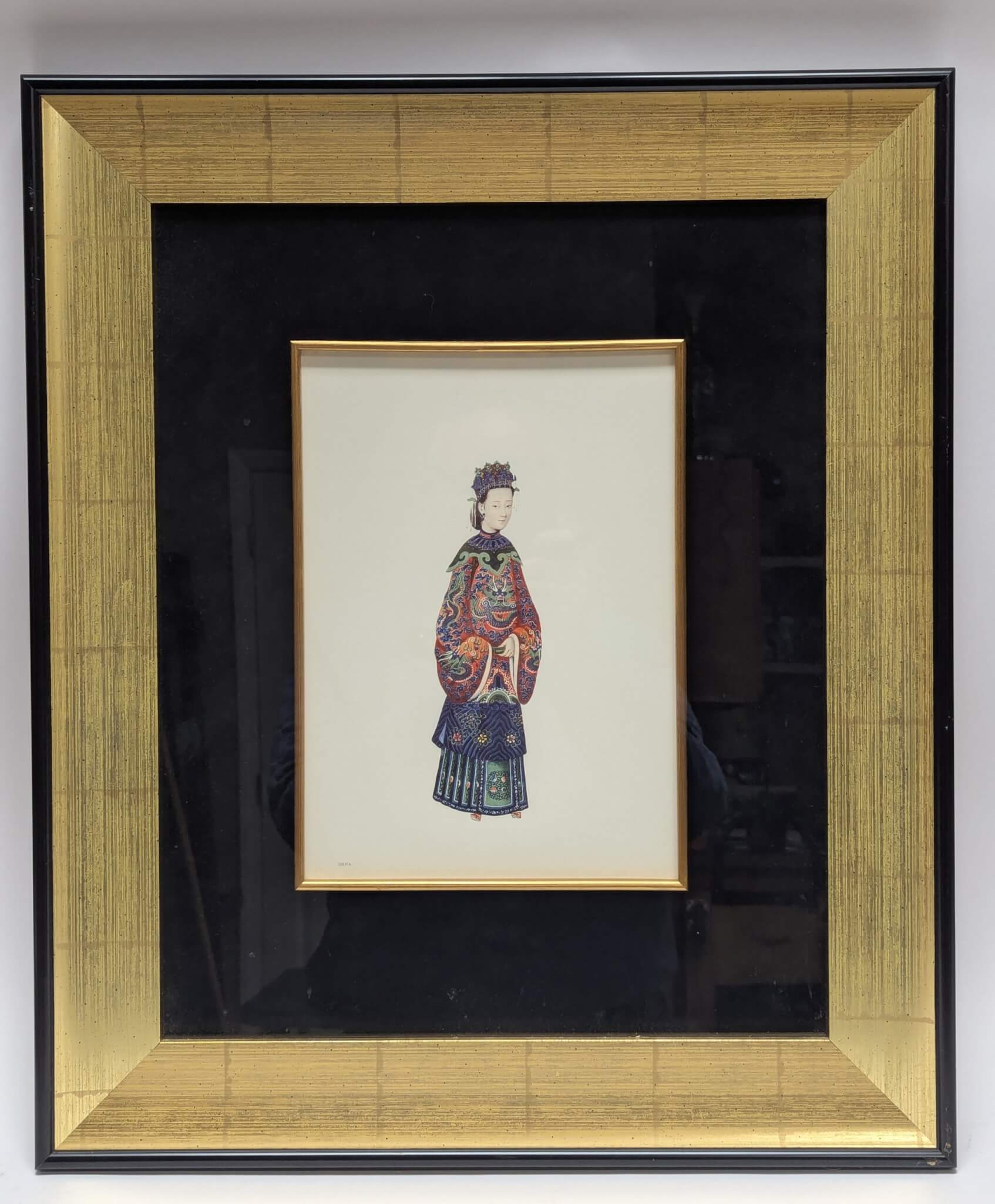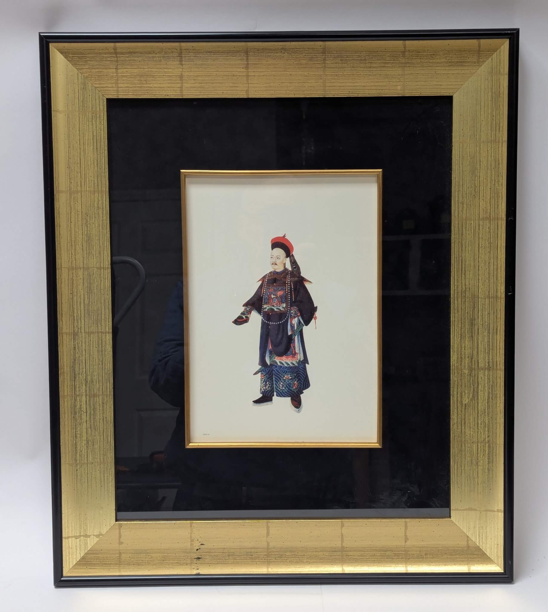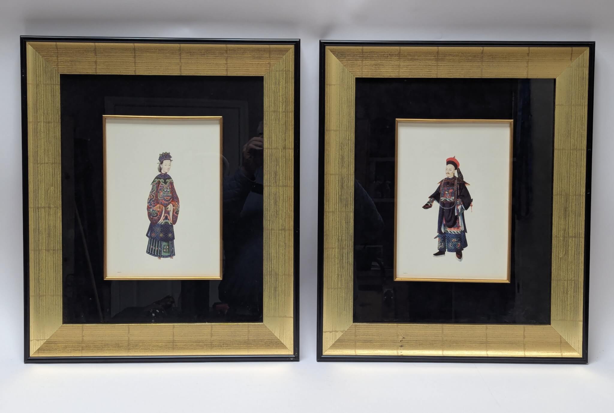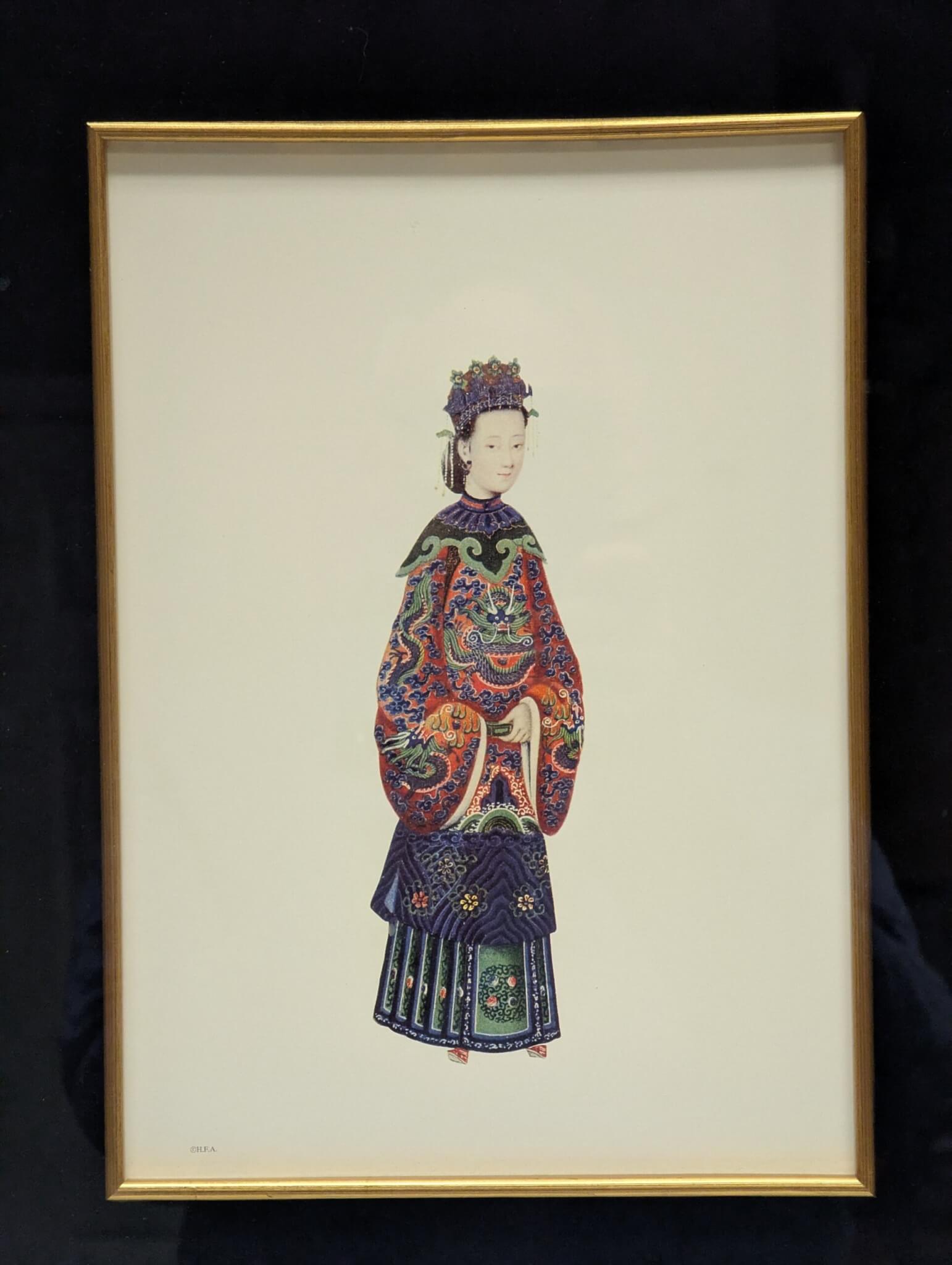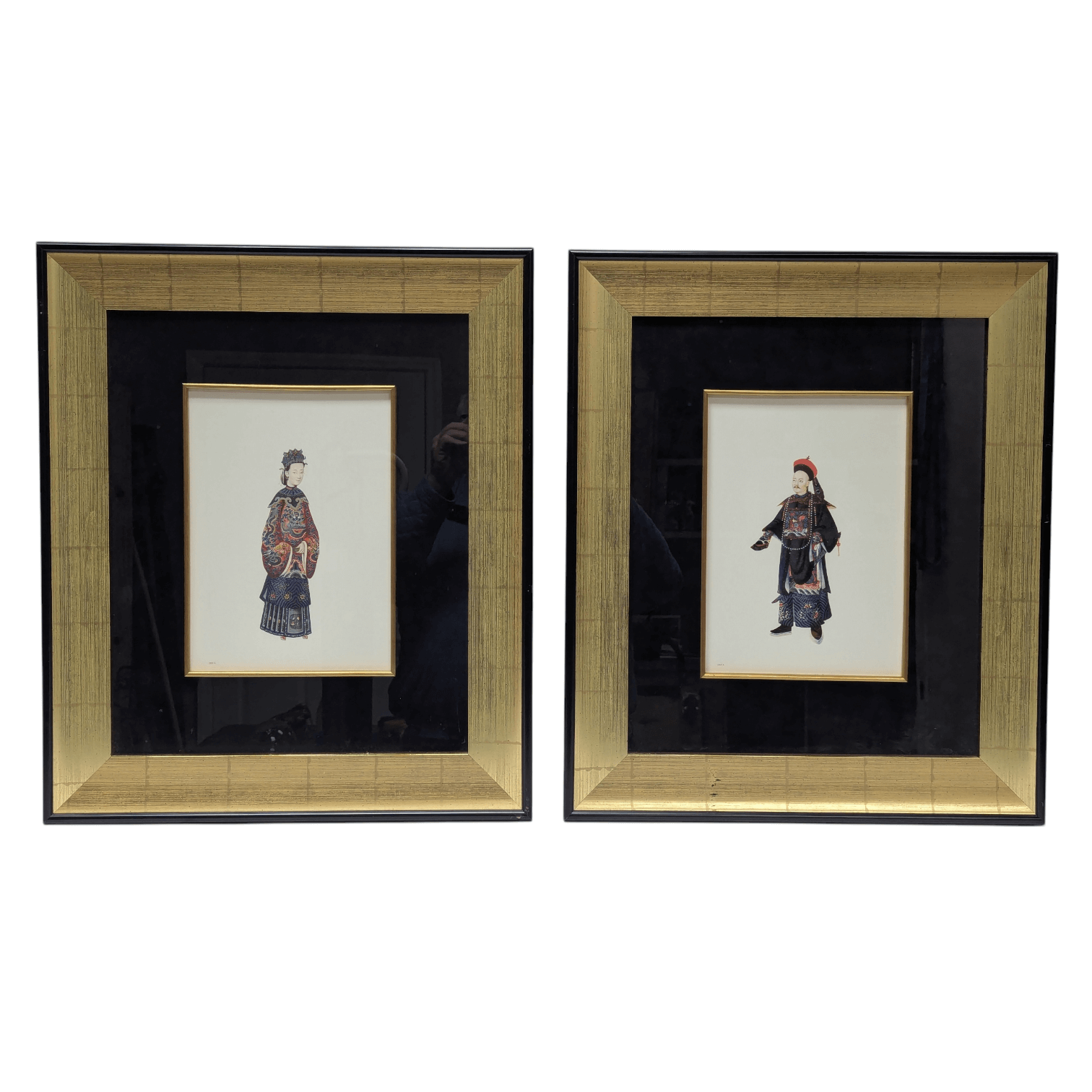Pair of Chinese Ancestral portraits [circa 1995]. This figural pair dressed in traditional Chinese Mandrin attire, display traditional costumes in period details and vibrant colors. The prints are beautifully matted and mounted in black and gold frames. Sold only as a pair.