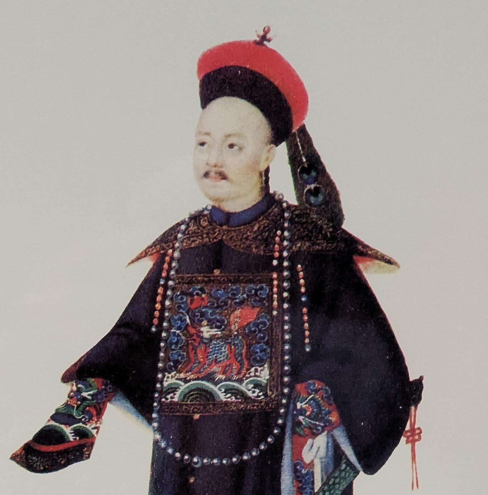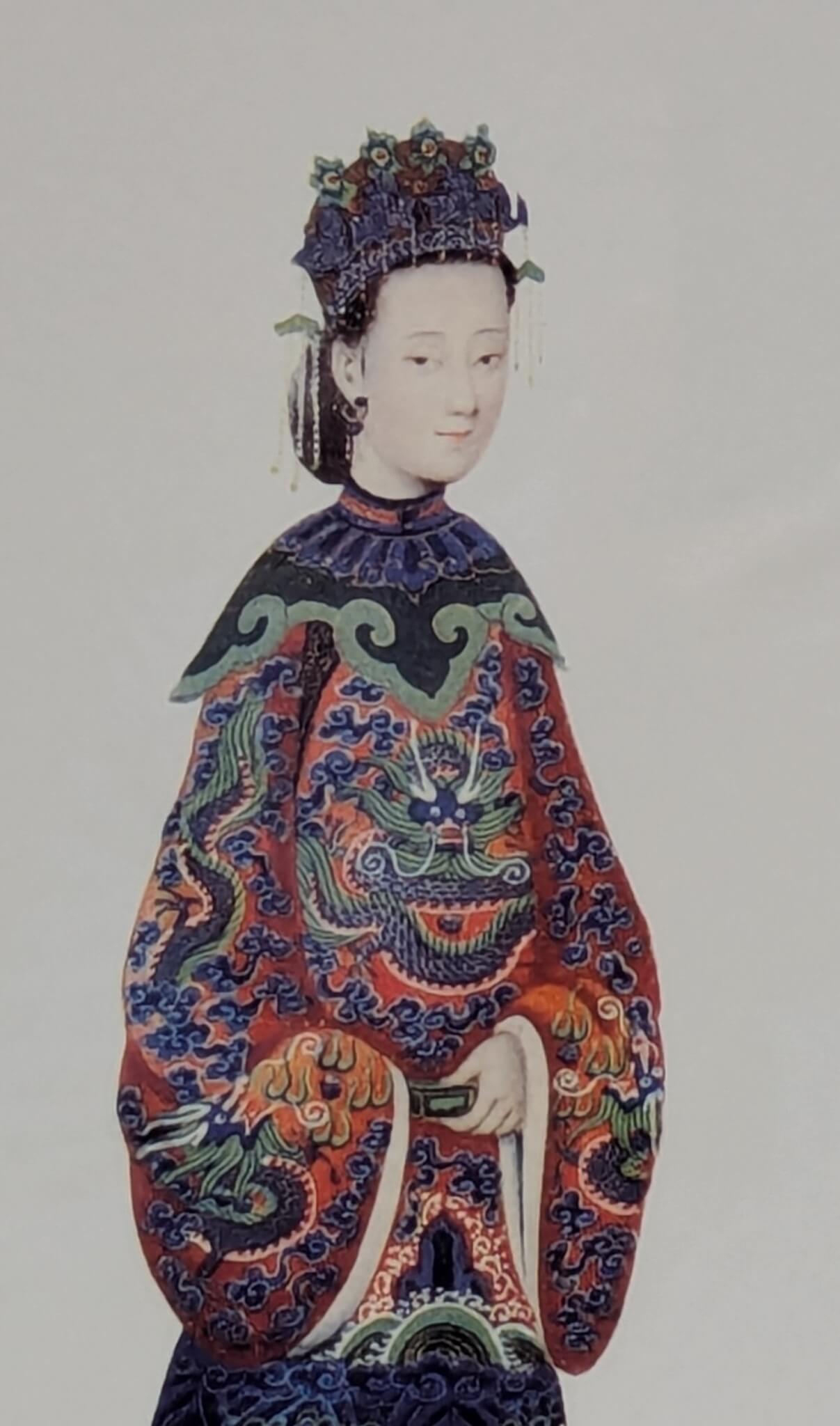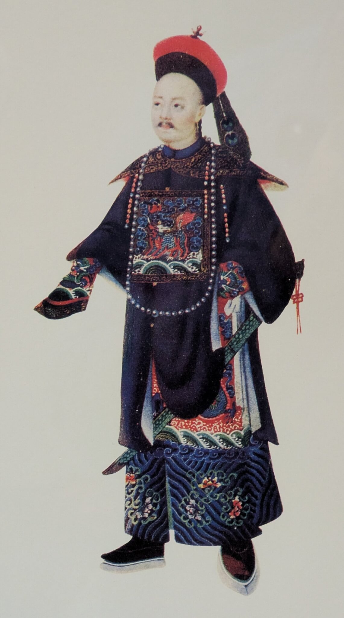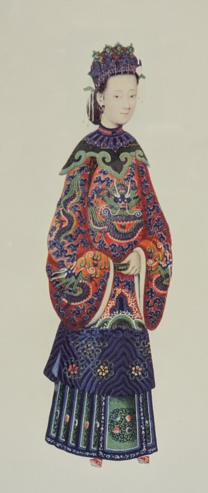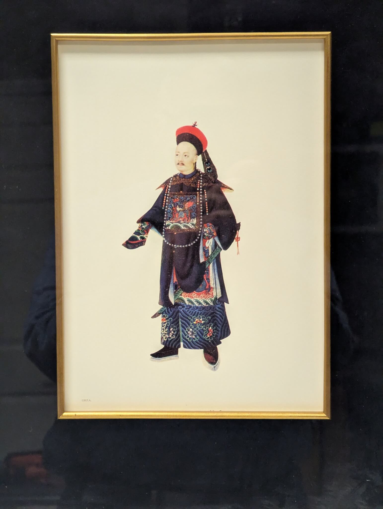 Pair of Chinese Ancestral portraits [circa 1995]. This figural pair dressed in traditional Chinese Mandrin attire, display traditional costumes in period details and vibrant colors. The prints are beautifully matted and mounted in black and gold frames. Sold only as a pair.