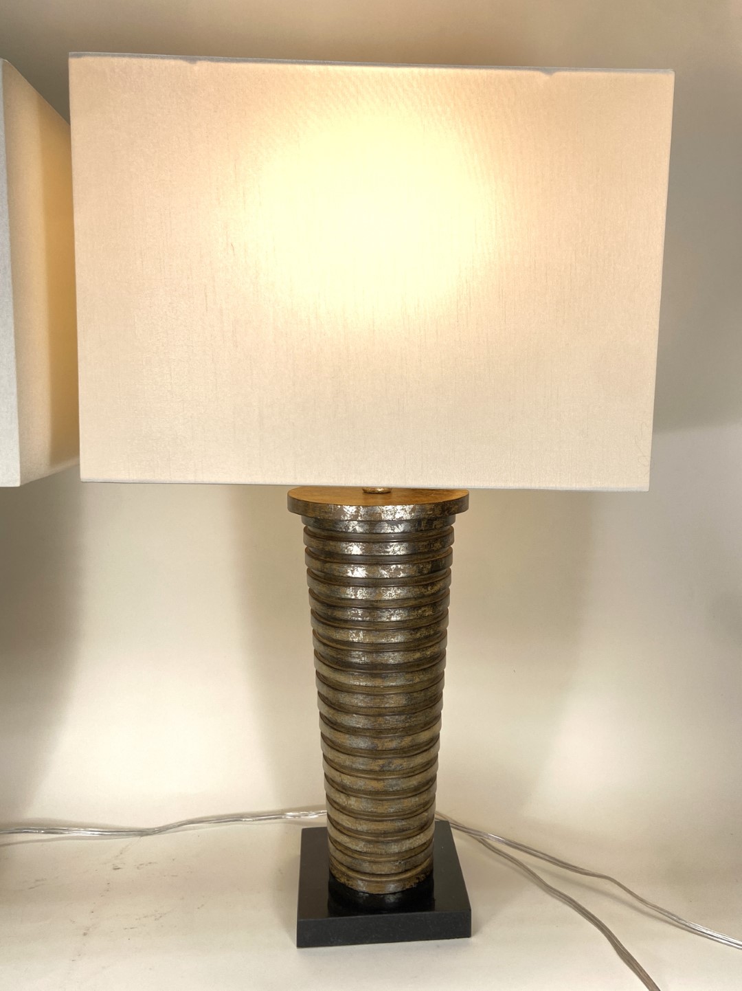 Enhance your space with this stunning pair of gold table lamps with rectangular shades, blending modern sophistication with timeless elegance. The textured, tiered gold bases sit atop sleek black pedestals, adding depth and contrast to the design. Topped with crisp rectangular white shades, these lamps provide a warm, ambient glow—perfect for any contemporary or transitional setting.