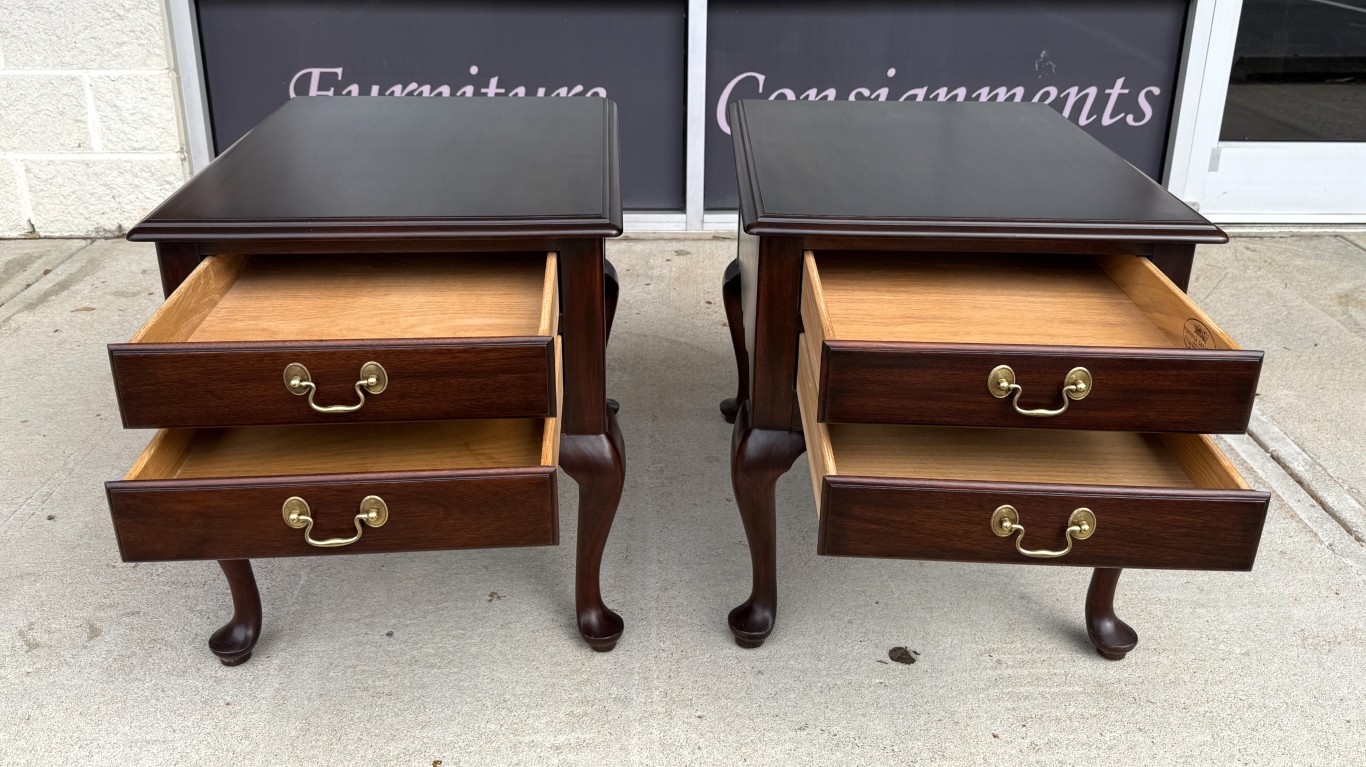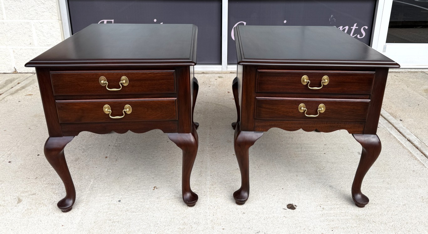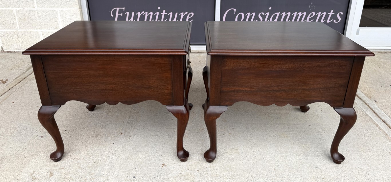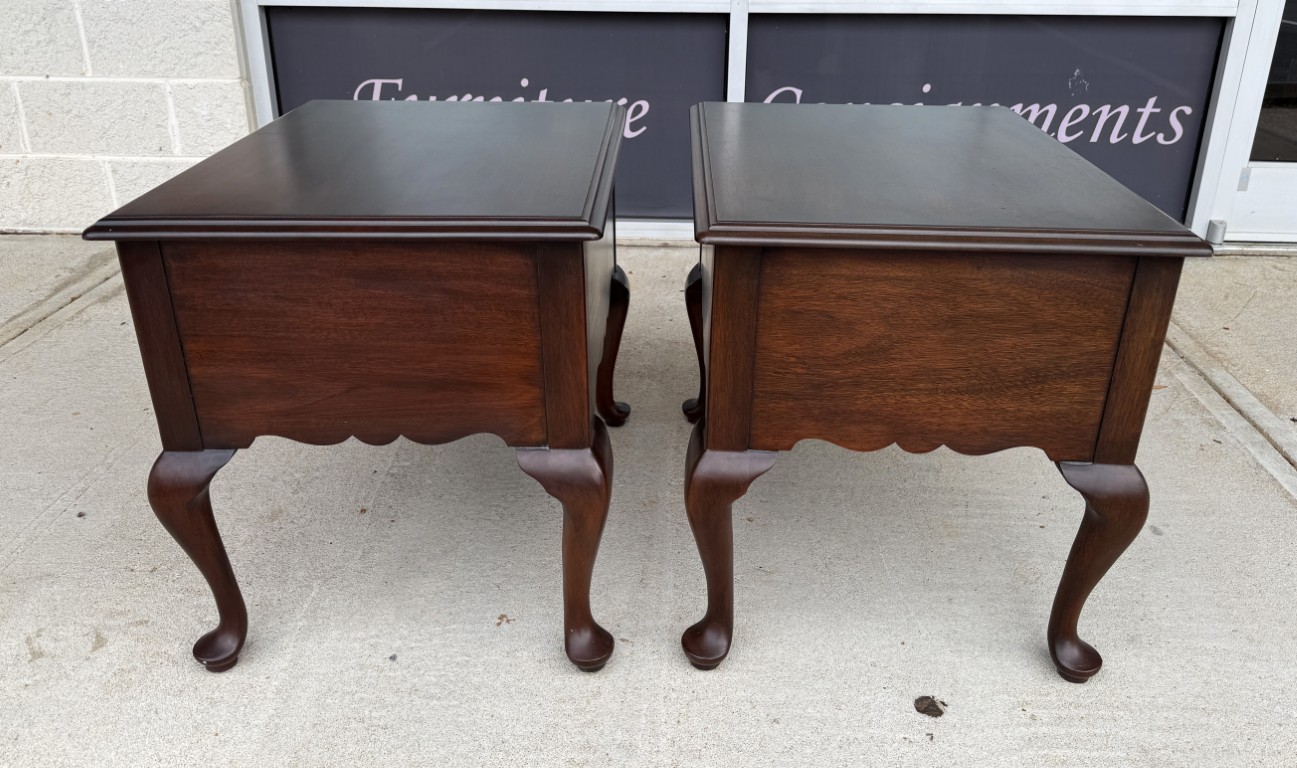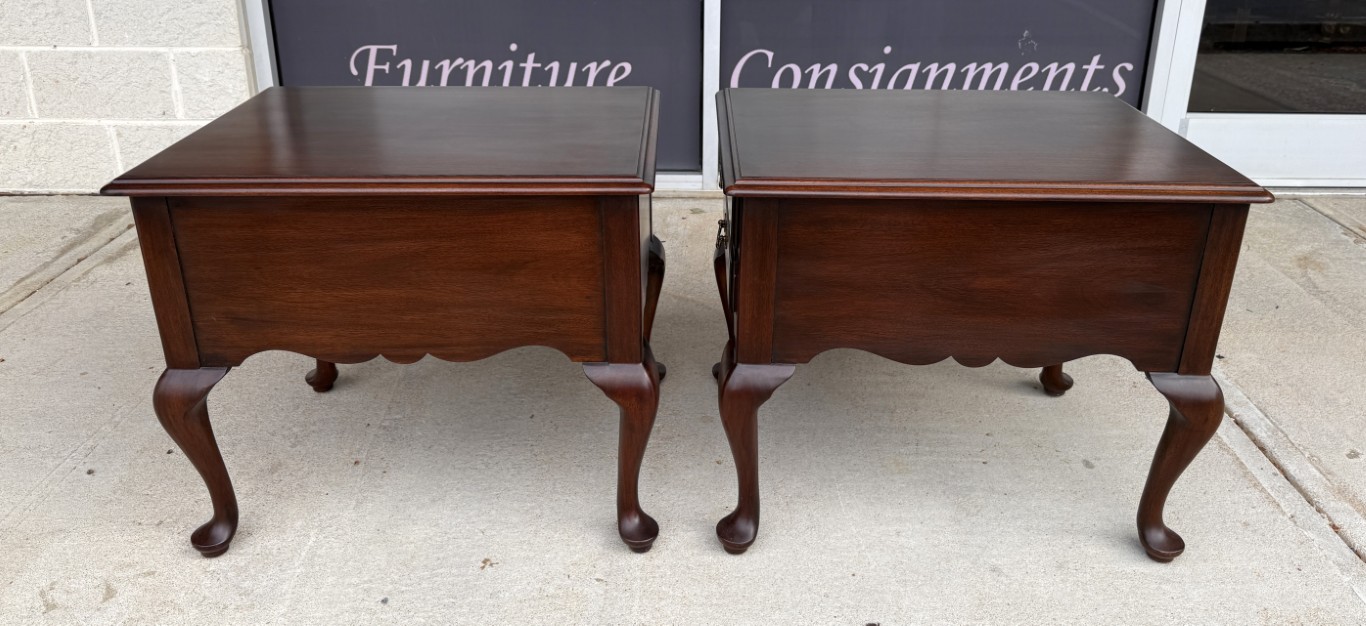 This matching pair of Henkel Harris solid mahogany end tables features gracefully shaped Queen Anne–style legs, scalloped aprons, and two smoothly functioning drawers accented with classic brass hardware. The rich mahogany finish highlights the wood’s natural grain, making these tables an elegant and practical addition beside a sofa or bed. Henkel Harris is widely regarded as one of America’s premier furniture makers, known for its meticulous craftsmanship, traditional designs, and heirloom-quality solid wood construction made in Virginia.