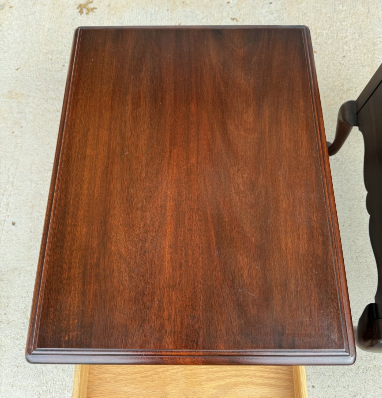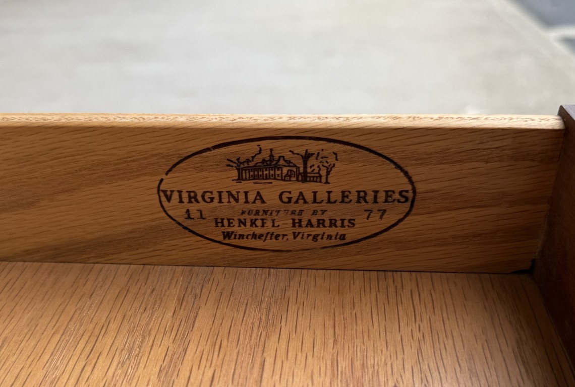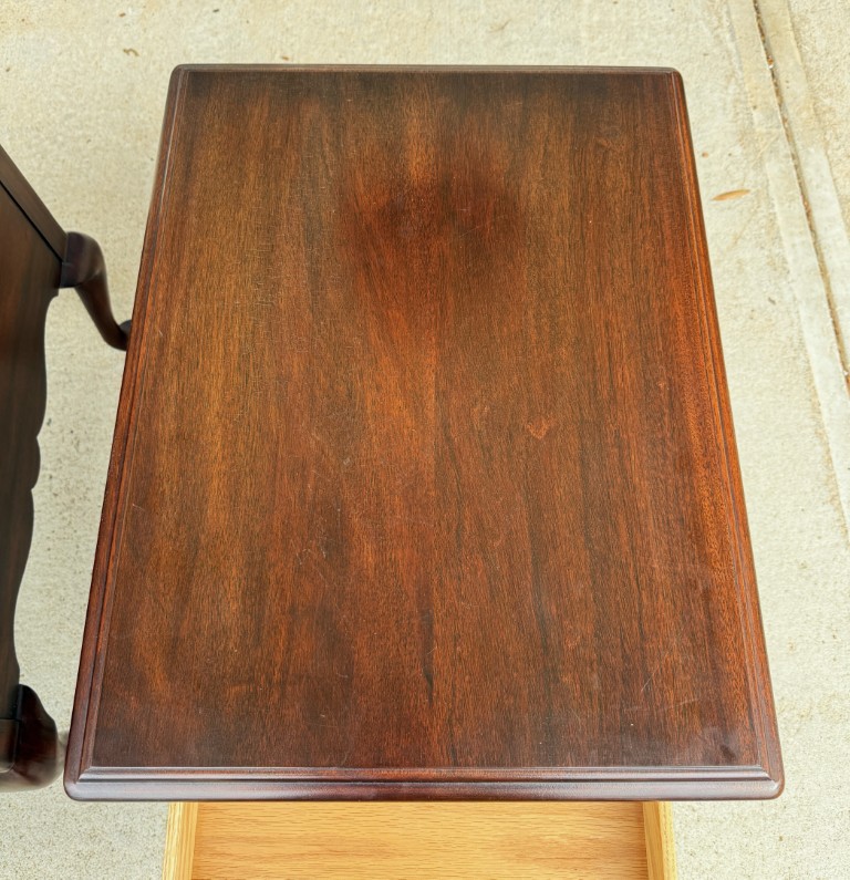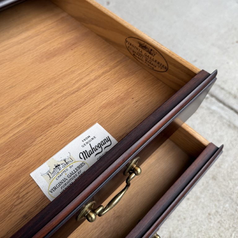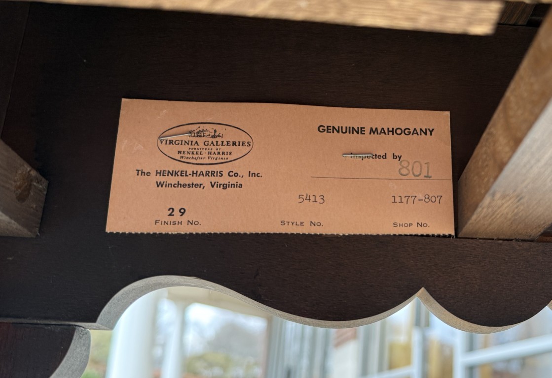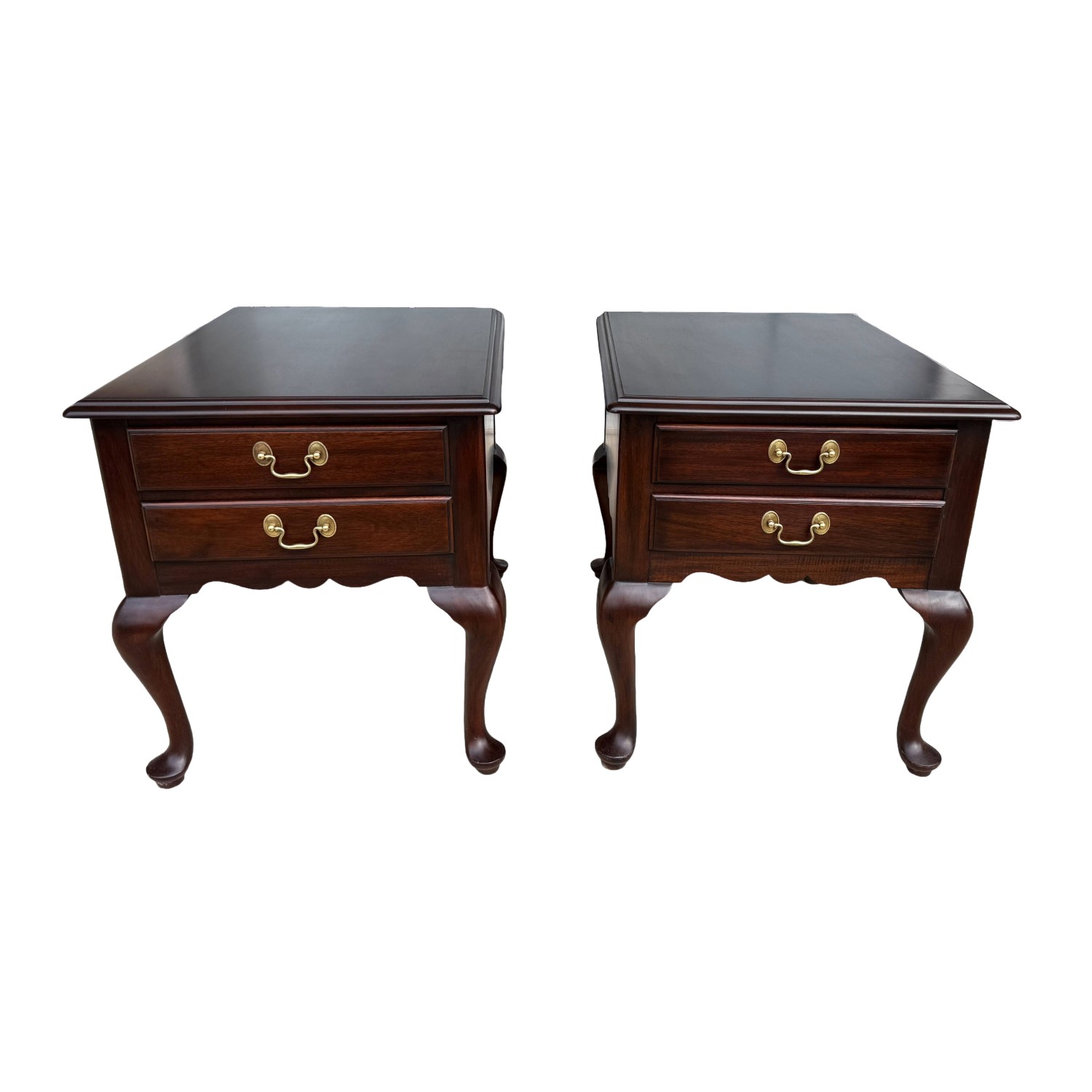 This matching pair of Henkel Harris solid mahogany end tables features gracefully shaped Queen Anne–style legs, scalloped aprons, and two smoothly functioning drawers accented with classic brass hardware. The rich mahogany finish highlights the wood’s natural grain, making these tables an elegant and practical addition beside a sofa or bed. Henkel Harris is widely regarded as one of America’s premier furniture makers, known for its meticulous craftsmanship, traditional designs, and heirloom-quality solid wood construction made in Virginia.