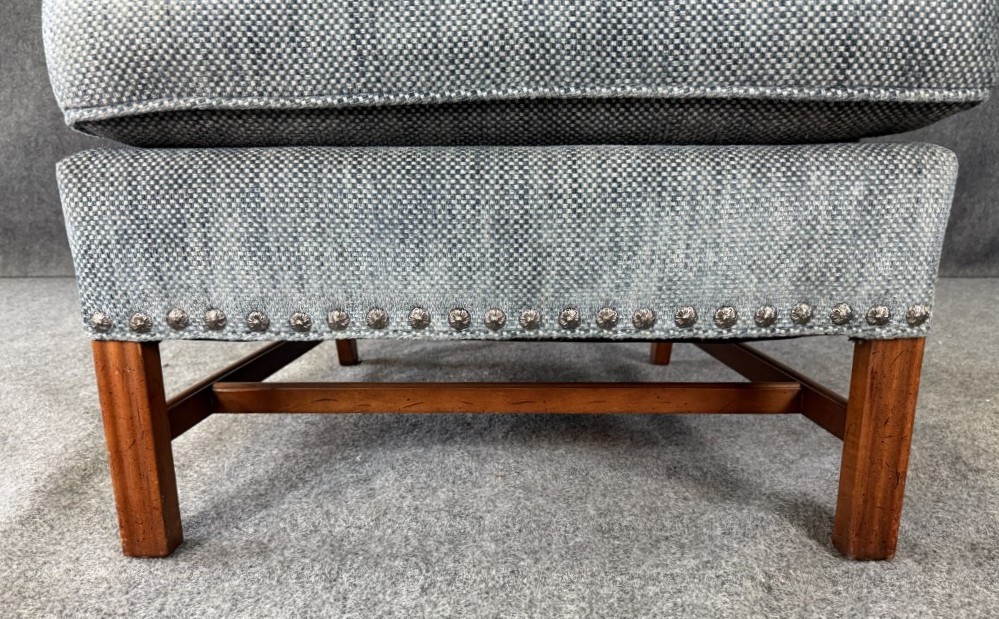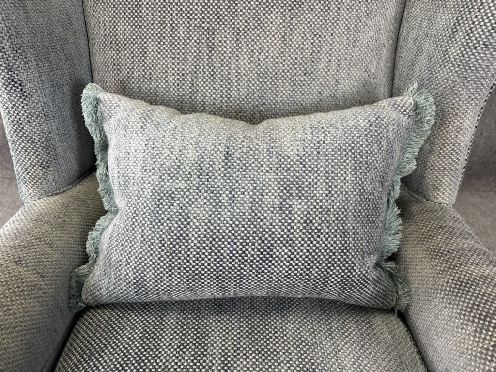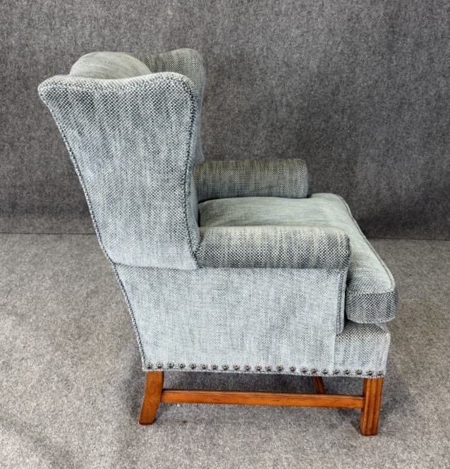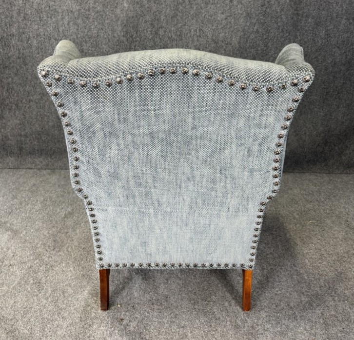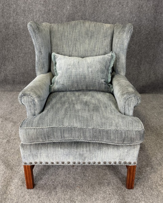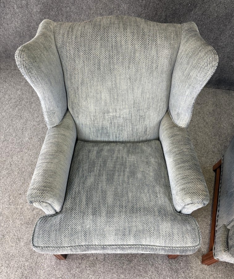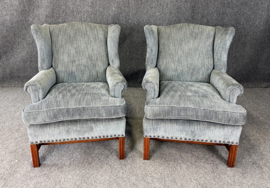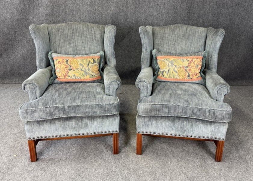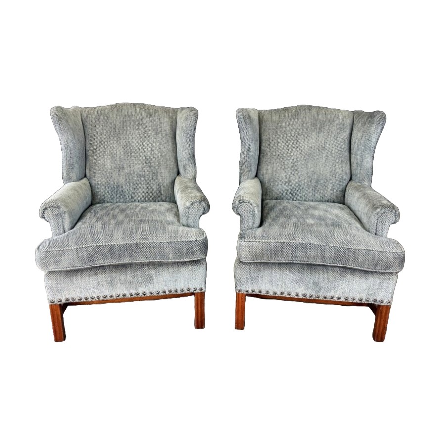 This pair of high-end upholstered wingback arm chairs features a soft, textured blue-gray fabric with classic winged silhouettes, gently rolled arms, and tailored nailhead trim along the base. Each chair includes reversible accent pillows—one side in matching upholstery and the other in a floral tapestry—adding both versatility and a refined decorative touch.