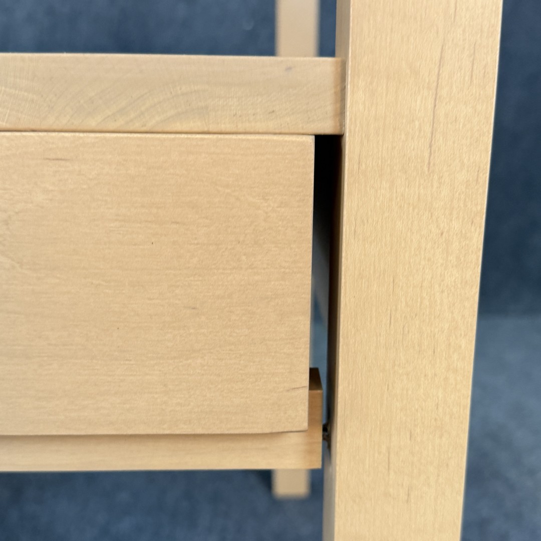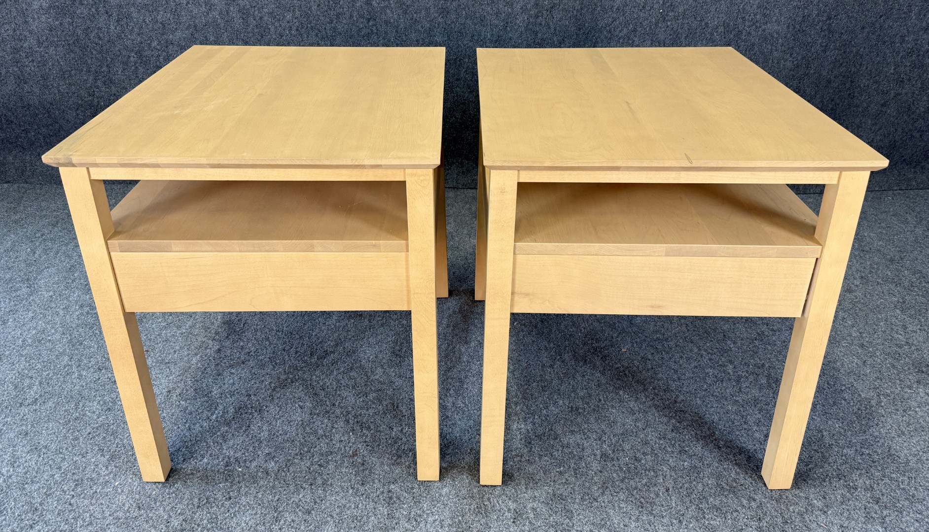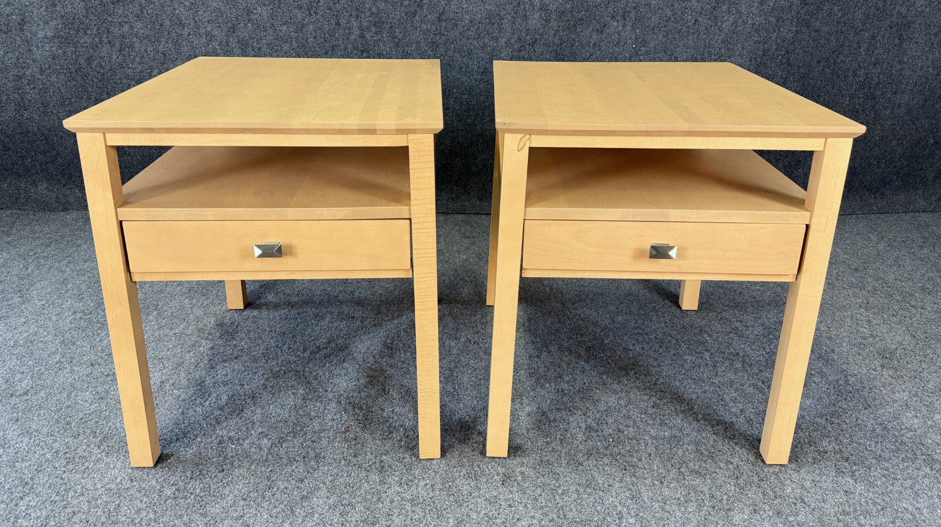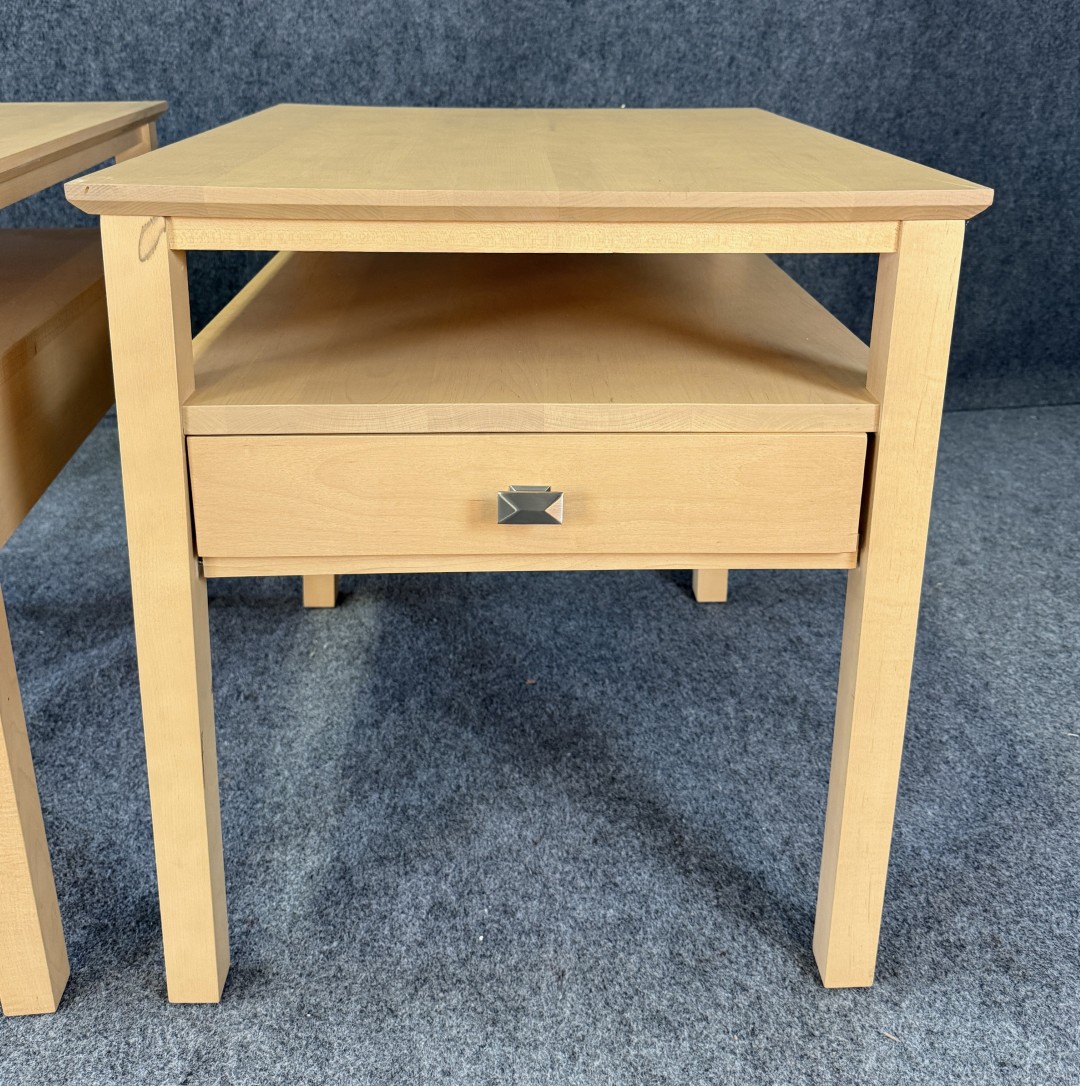 This Pair of Leisters Furniture Maple Side Tables showcases clean, contemporary lines in a light maple finish that highlights the natural grain of the wood. Each table features an open lower shelf and a single drawer with a modern metal pull, offering both functional storage and versatile style for a living room or bedroom setting.