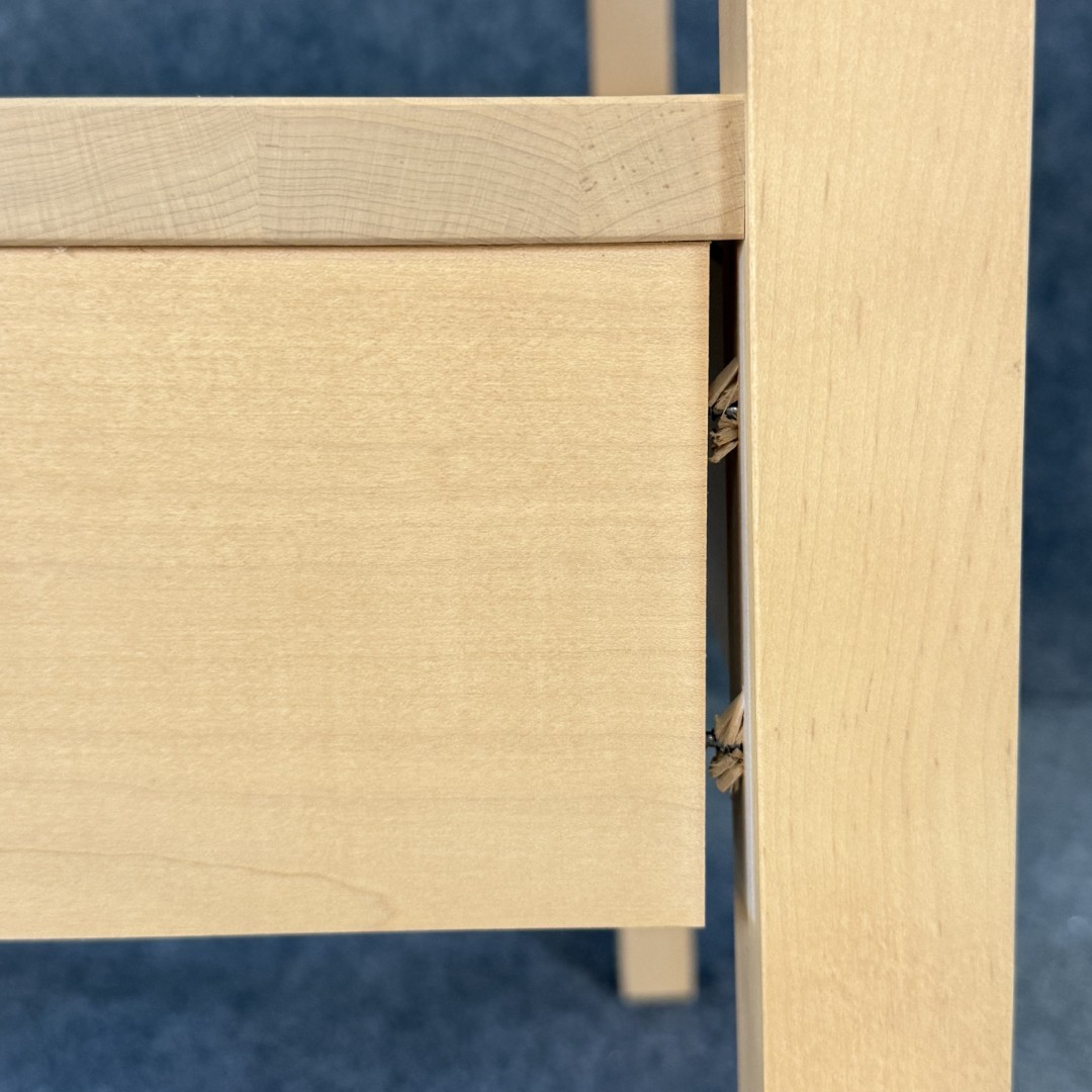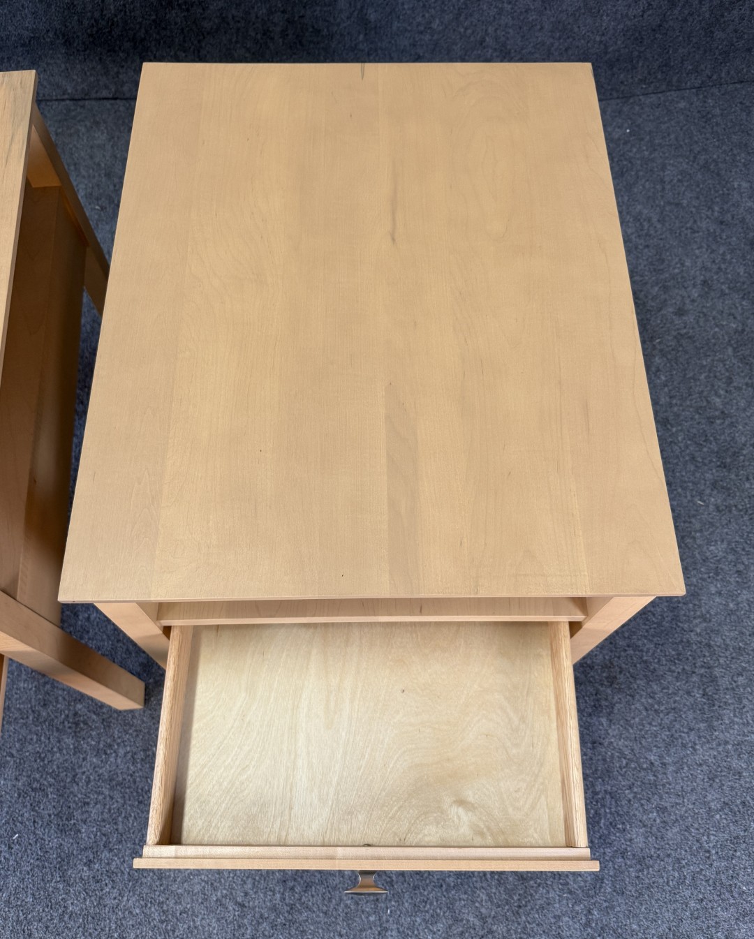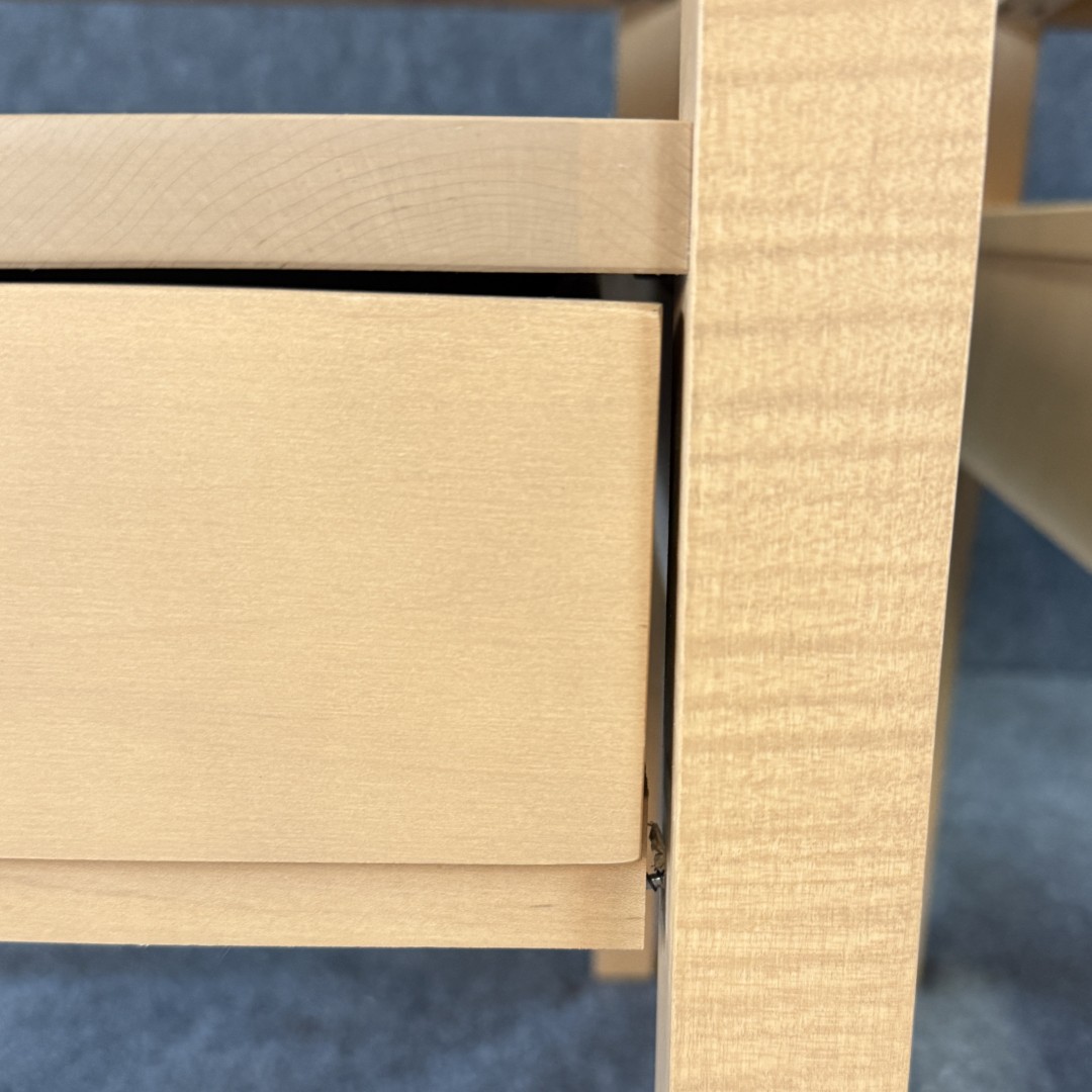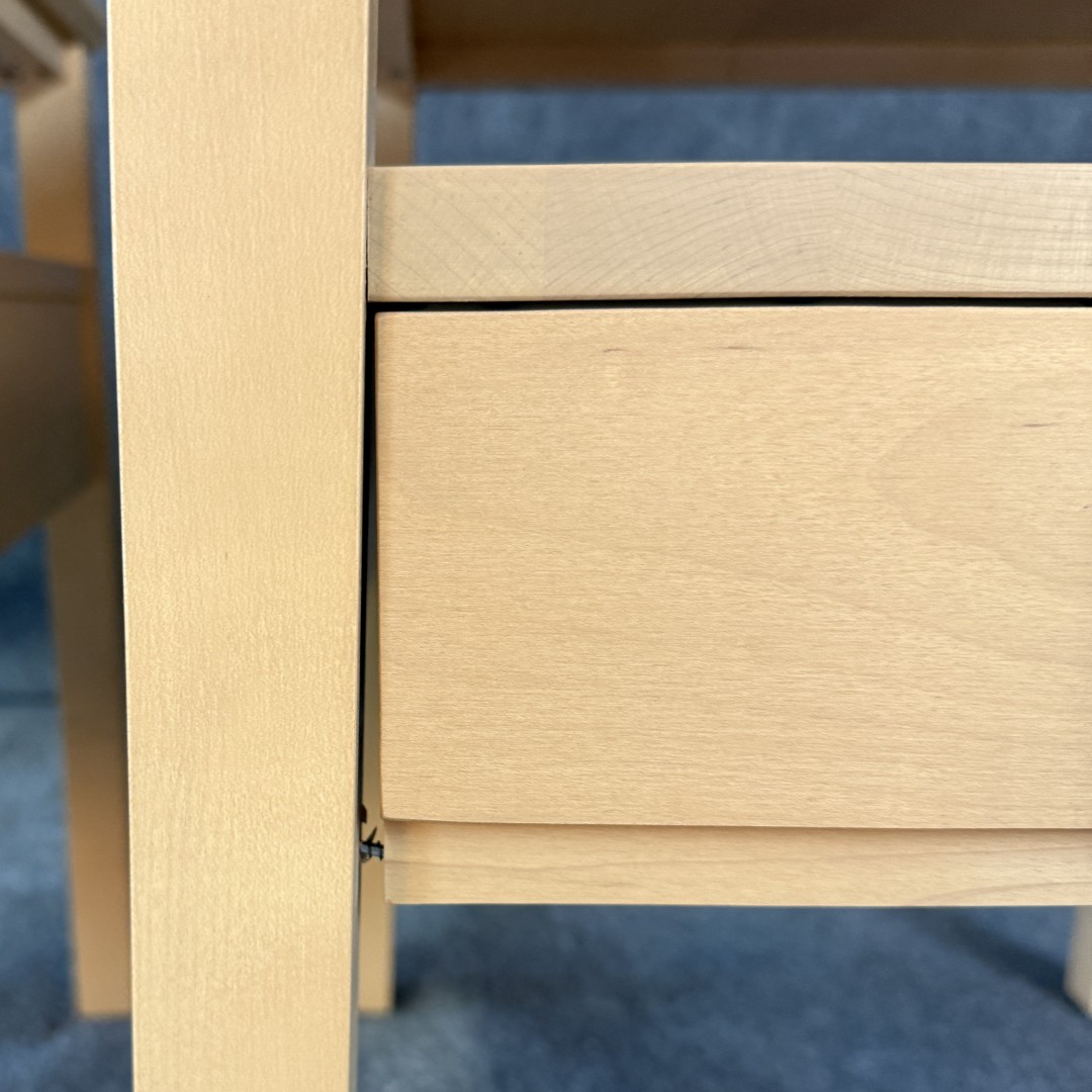 This Pair of Leisters Furniture Maple Side Tables showcases clean, contemporary lines in a light maple finish that highlights the natural grain of the wood. Each table features an open lower shelf and a single drawer with a modern metal pull, offering both functional storage and versatile style for a living room or bedroom setting.